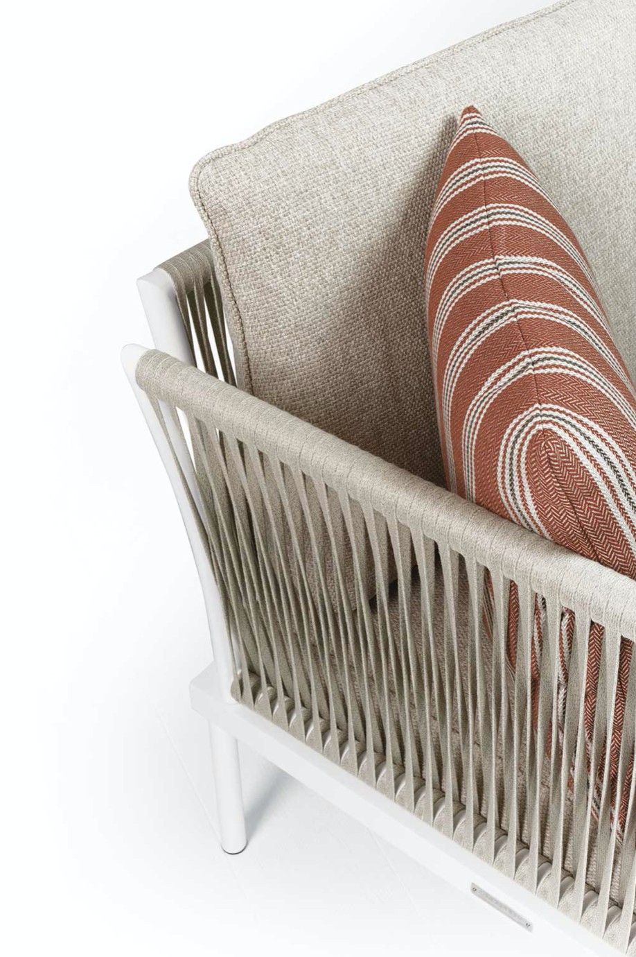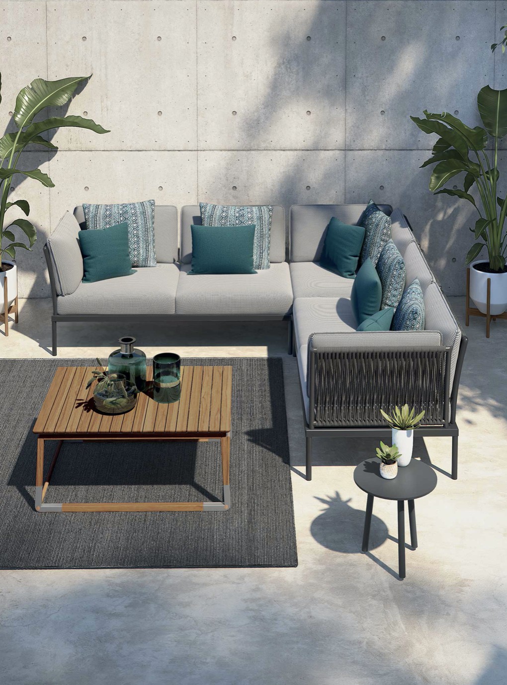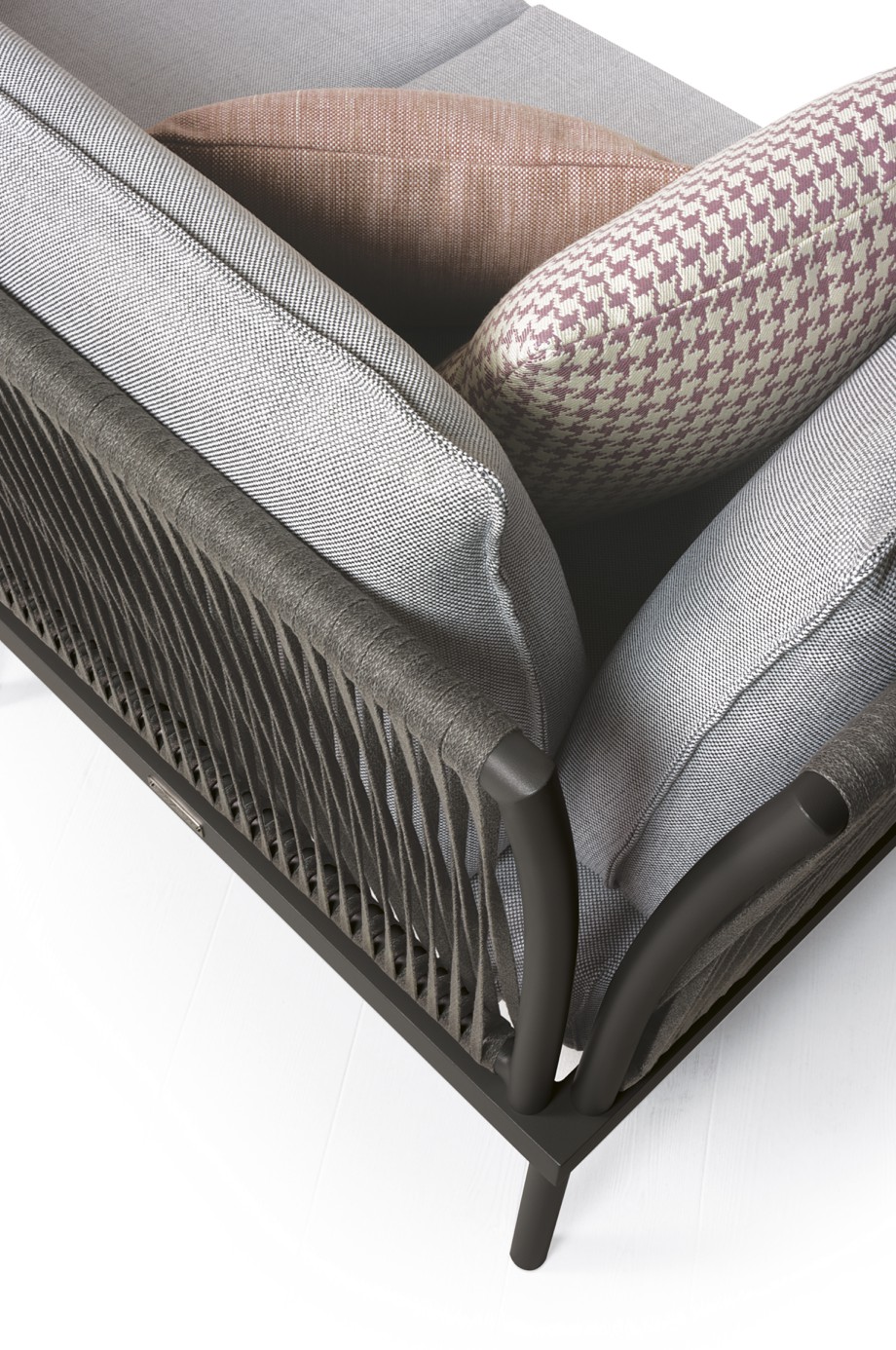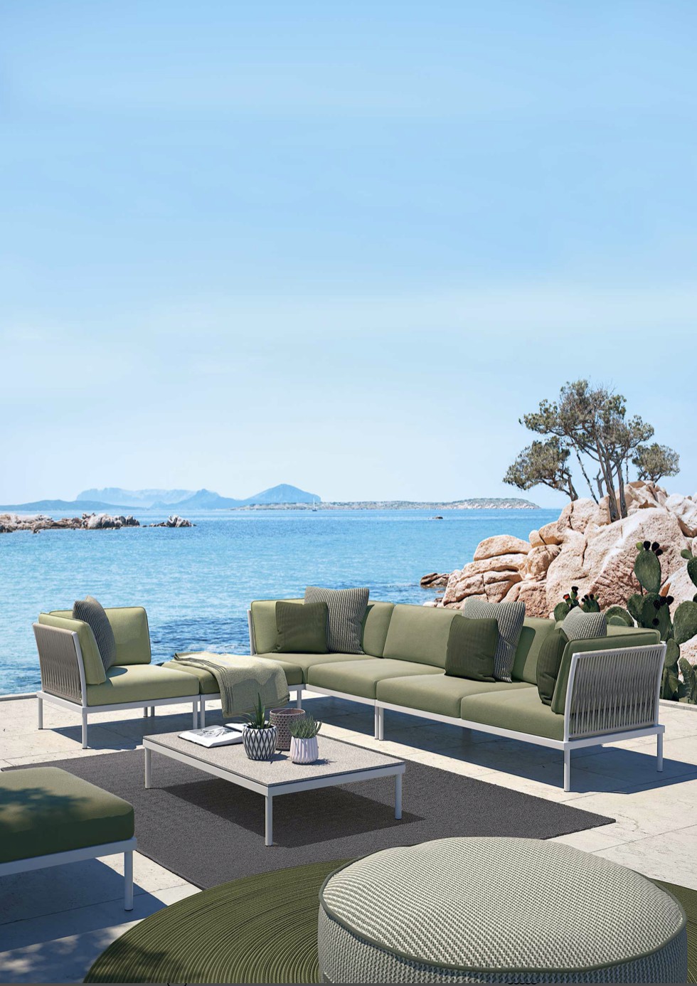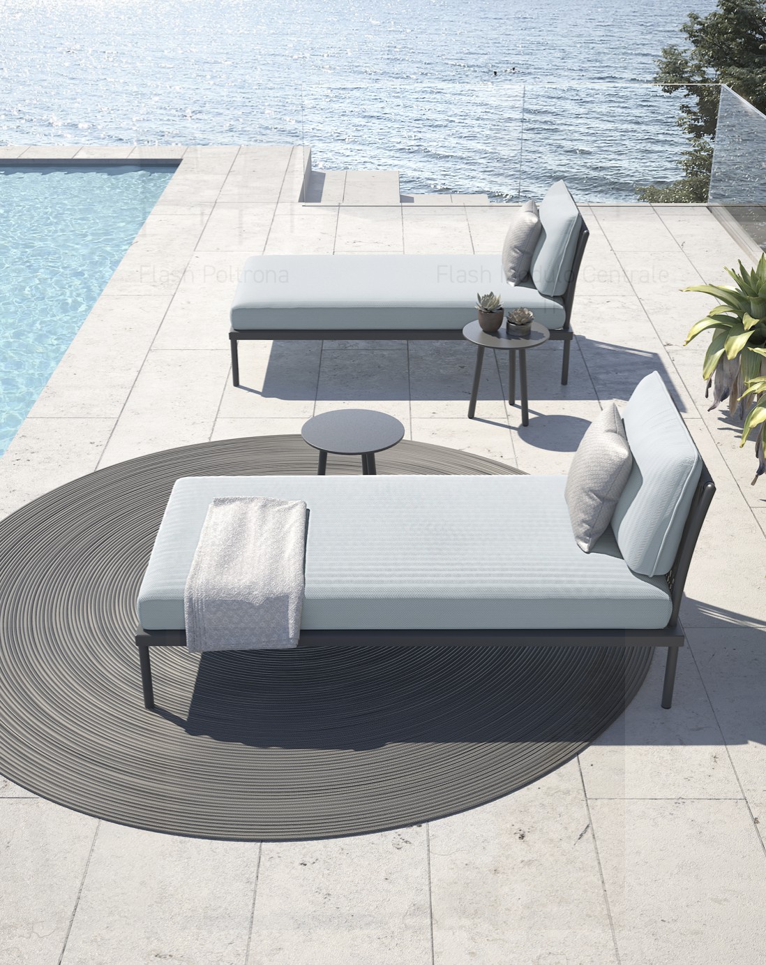 Flash è il divano modulare caratterizzato dall’intreccio a mano di corde termoplastiche in fibra acrilica di Teflon, resistenti all’acqua e di facile pulizia. Il materiale presenta un appeal morbido e raffinato simile ad intrecci tessili. Si caratterizza per la sua resistenza ai raggi UV e per la velocità di asciugatura. I colori delle finiture sono il bianco avorio melange e un grigio con filamenti di color sabbia. I piani dei tavoli sono caratterizzati da un effetto materico di pietra naturale color grigio antracite.