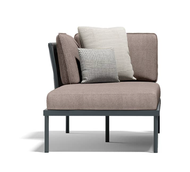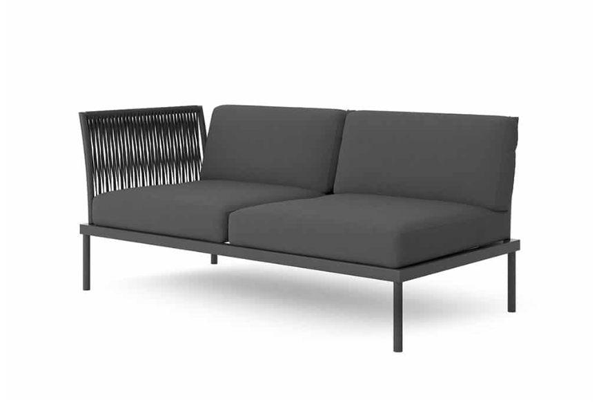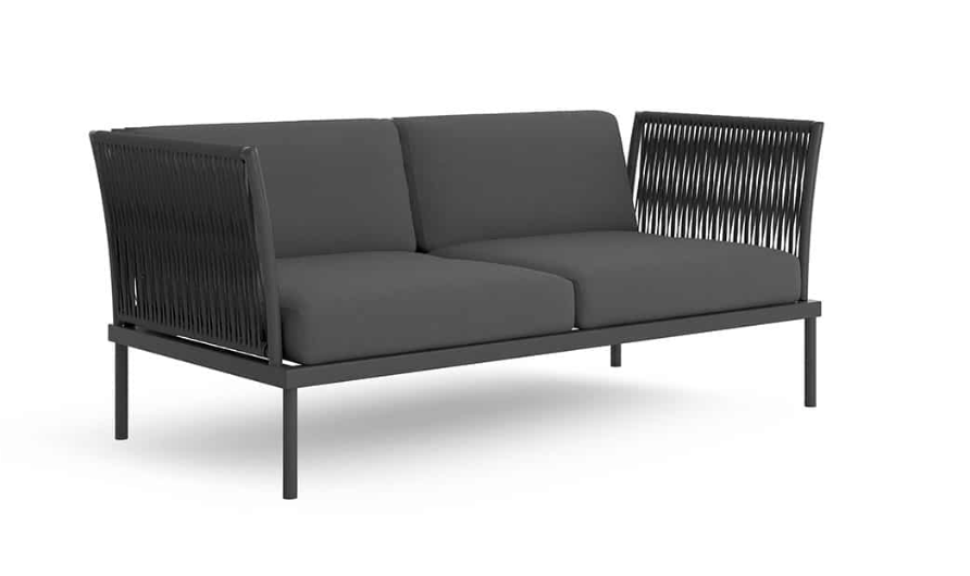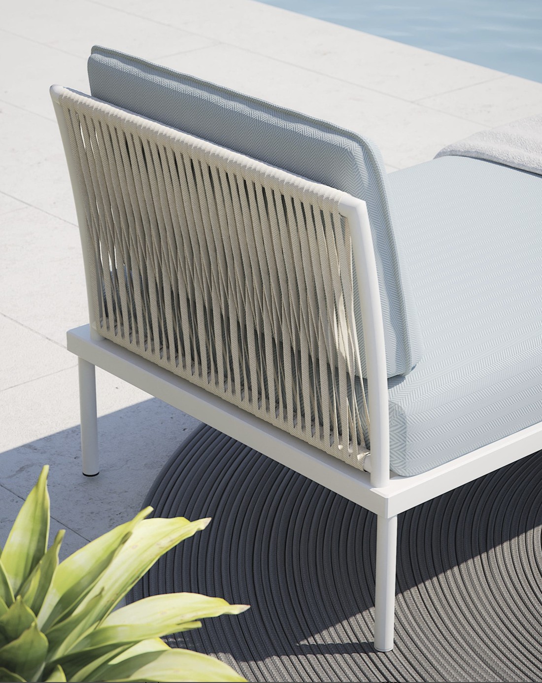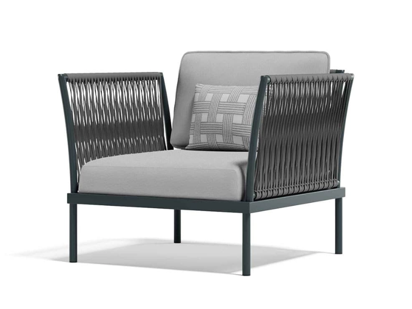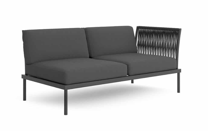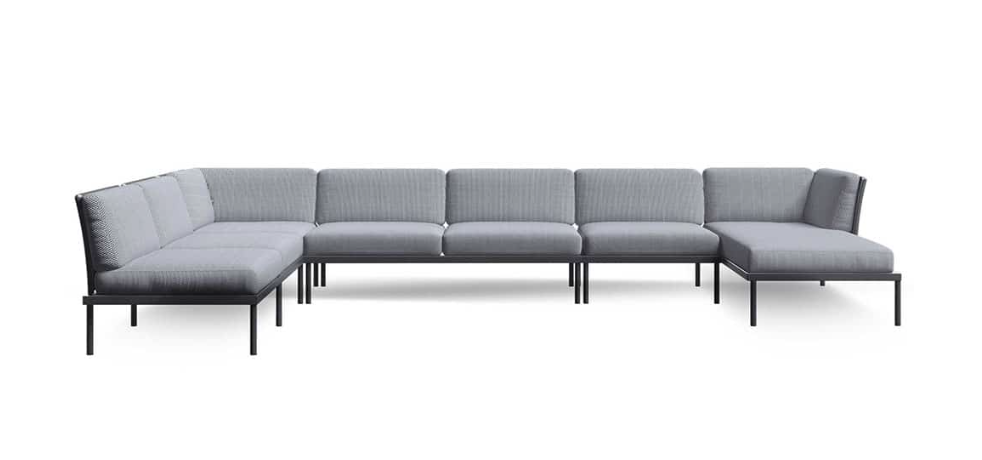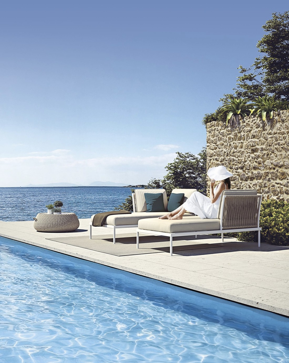 Flash è il divano modulare caratterizzato dall’intreccio a mano di corde termoplastiche in fibra acrilica di Teflon, resistenti all’acqua e di facile pulizia. Il materiale presenta un appeal morbido e raffinato simile ad intrecci tessili. Si caratterizza per la sua resistenza ai raggi UV e per la velocità di asciugatura. I colori delle finiture sono il bianco avorio melange e un grigio con filamenti di color sabbia. I piani dei tavoli sono caratterizzati da un effetto materico di pietra naturale color grigio antracite.