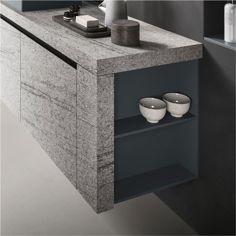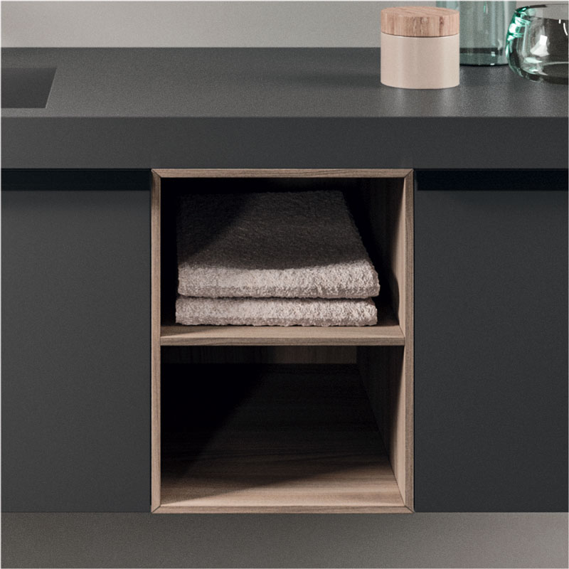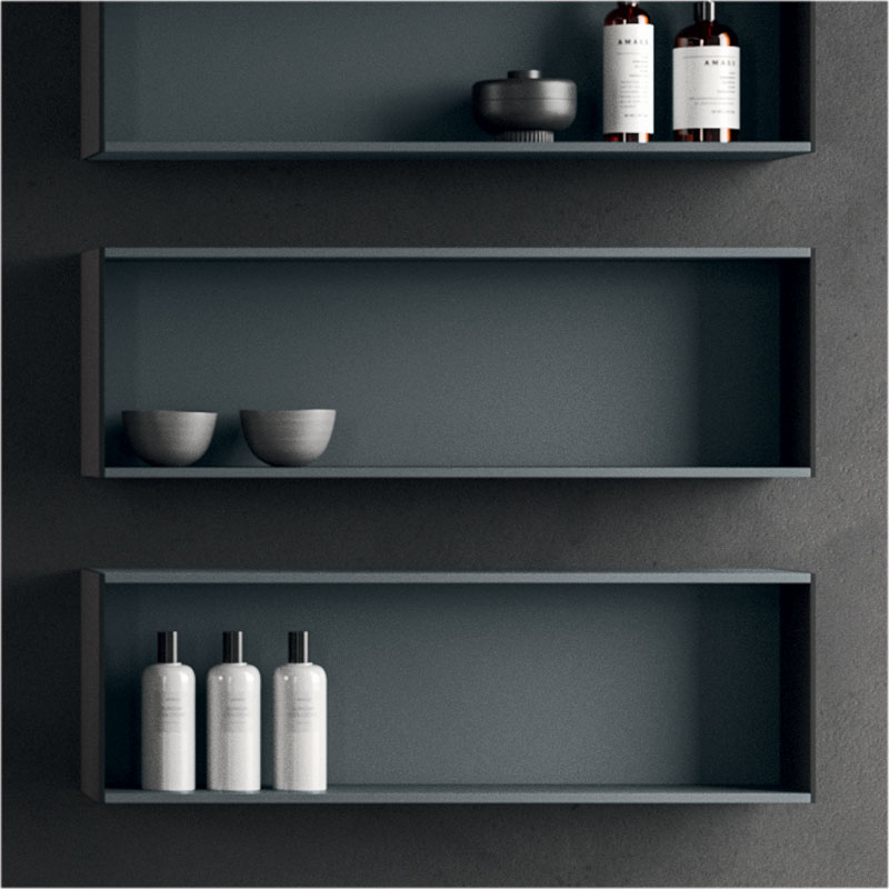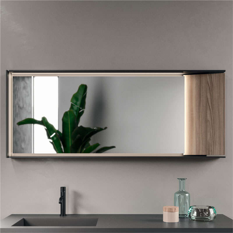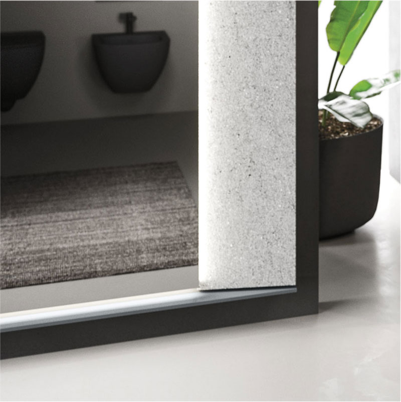 The Levante 3 Led shaped mirror characterises this monolithic composition that also features a side open compartment on the right.