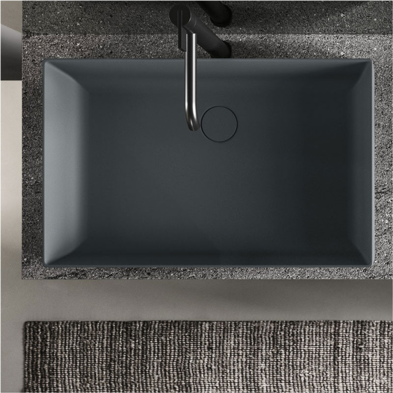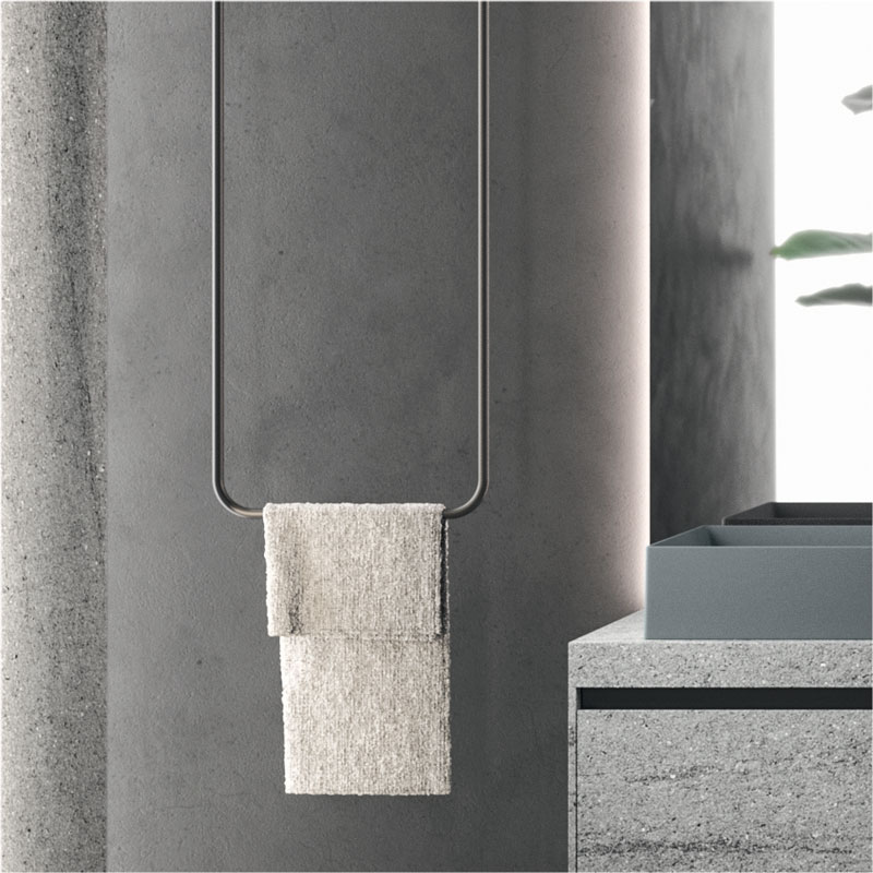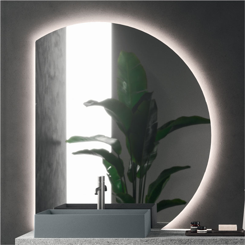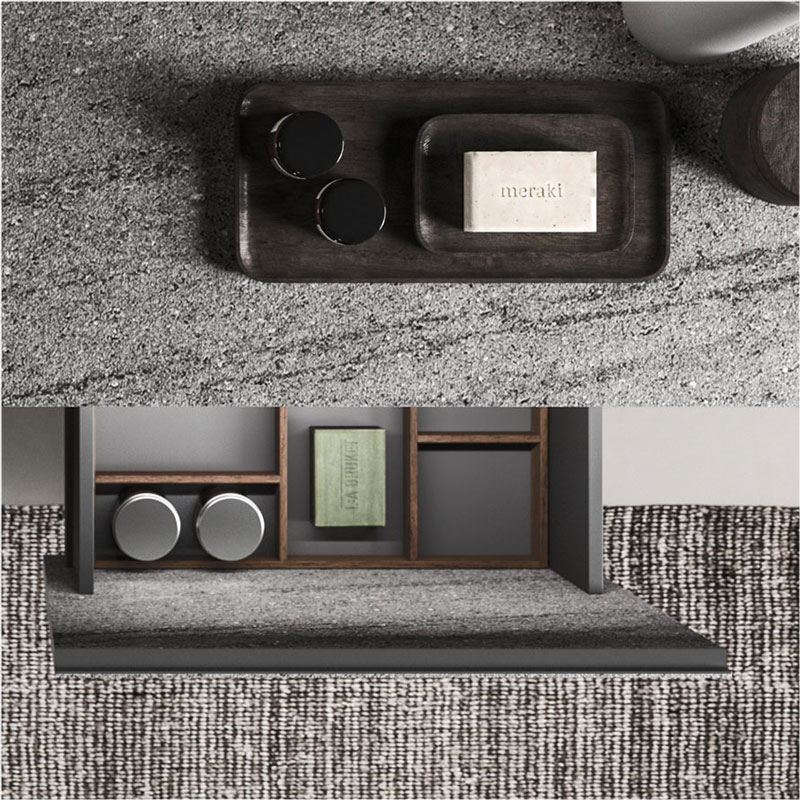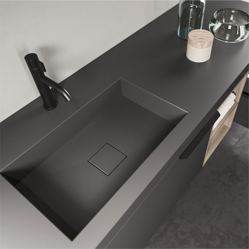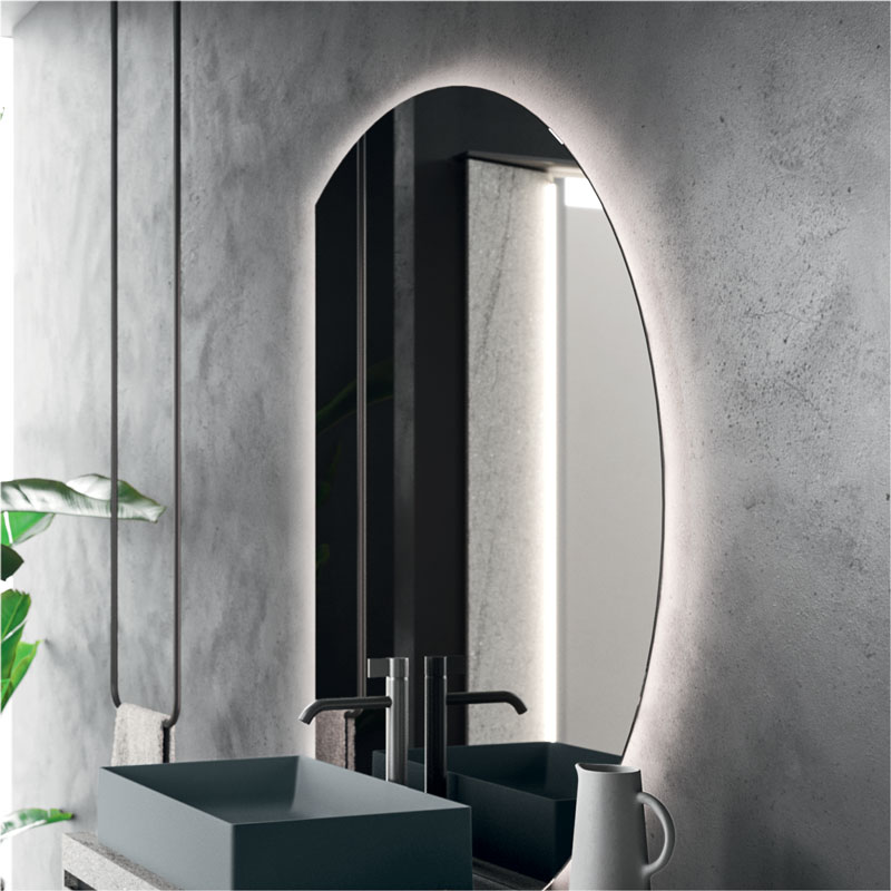 The Levante 3 Led shaped mirror characterises this monolithic composition that also features a side open compartment on the right.