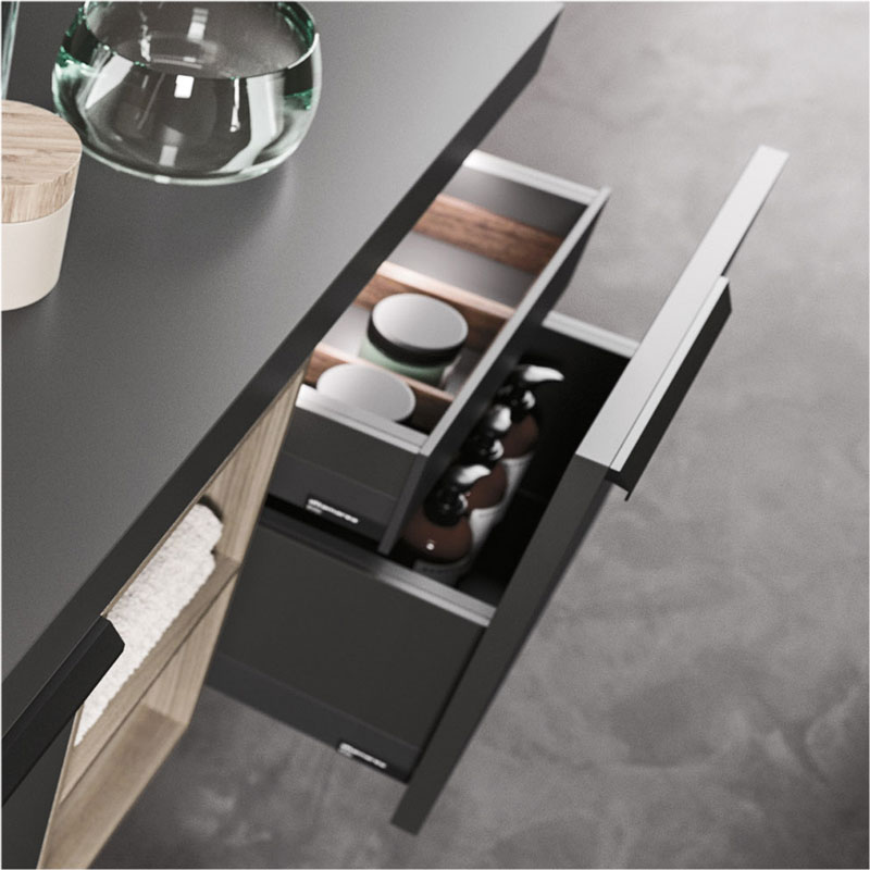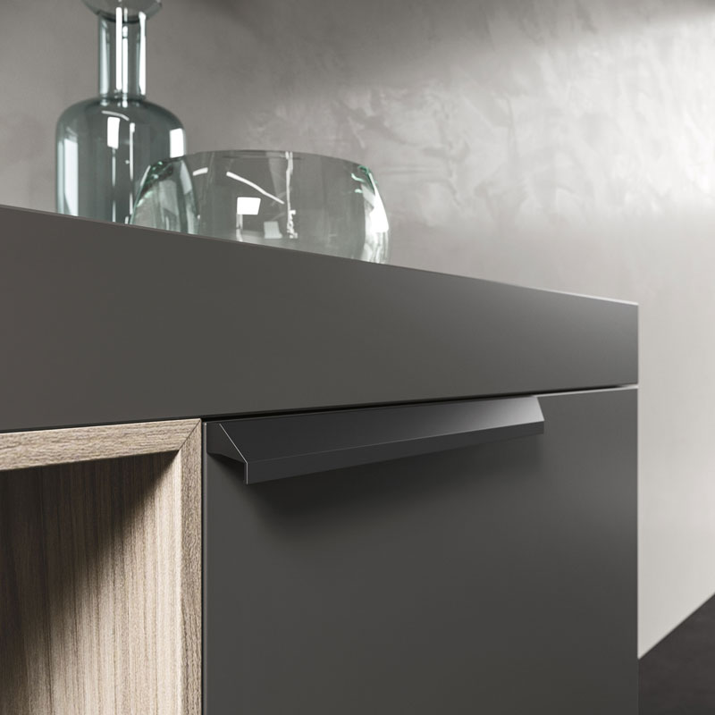 The Step handle profile in Brunito aluminium combined with the flat groove provides easy access to the storage compartments.