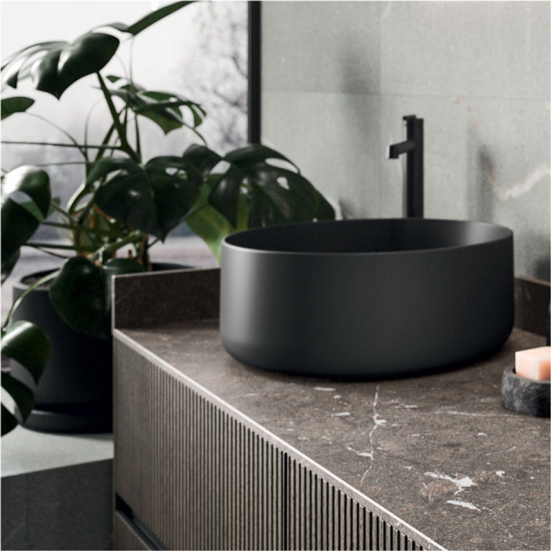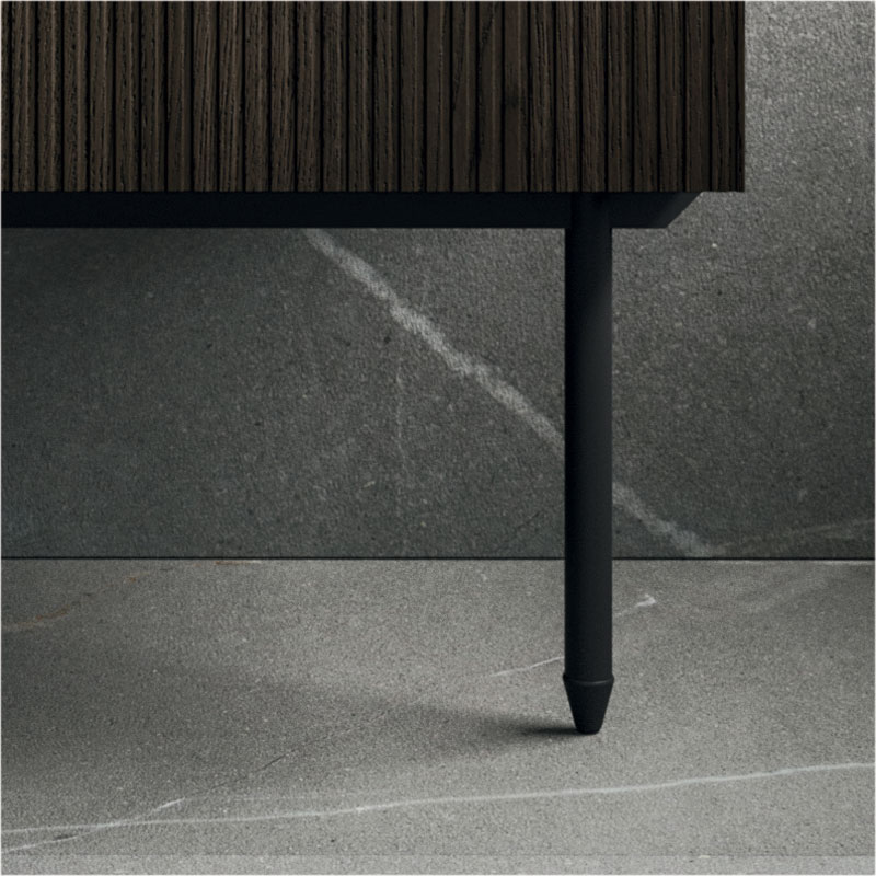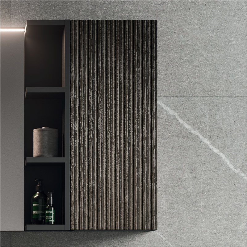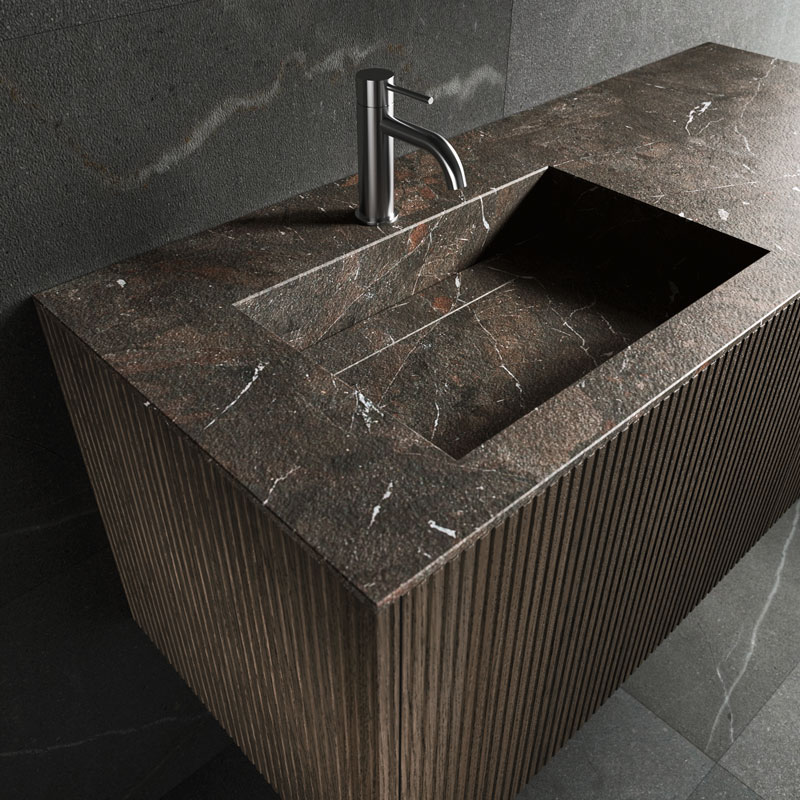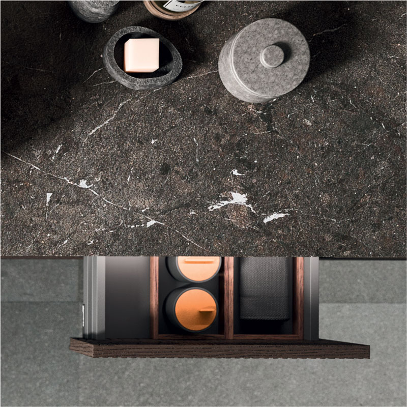 The special tray-shaped stoneware top effortlessly accommodates the Round 40 circular basin in black ceramic. The upper and lower Groove handle in Brunito aluminium provide a comfortable grip to open the Rovere Cacao veneered doors in the Traccia finish with vertical slats.