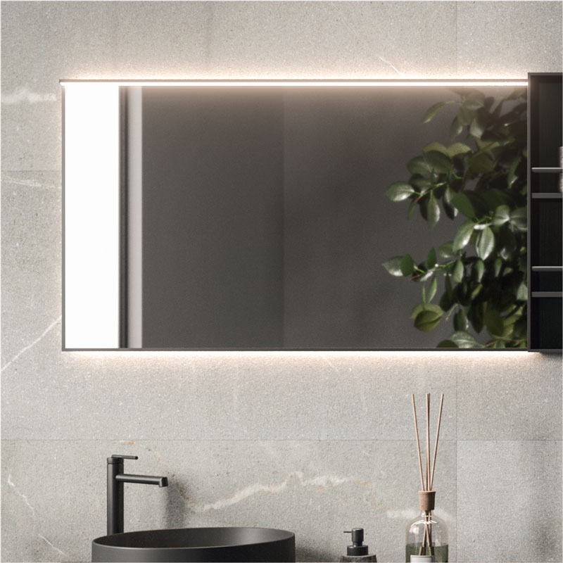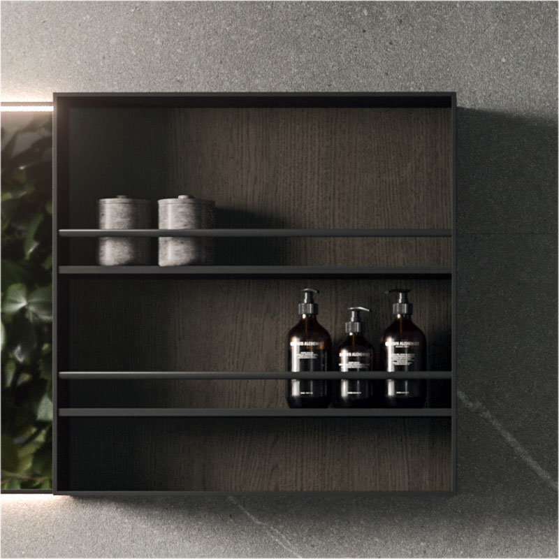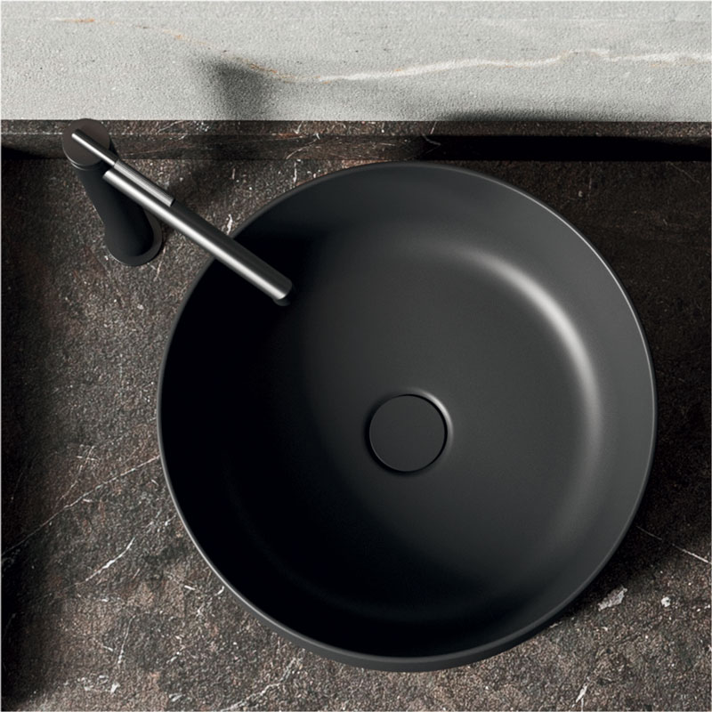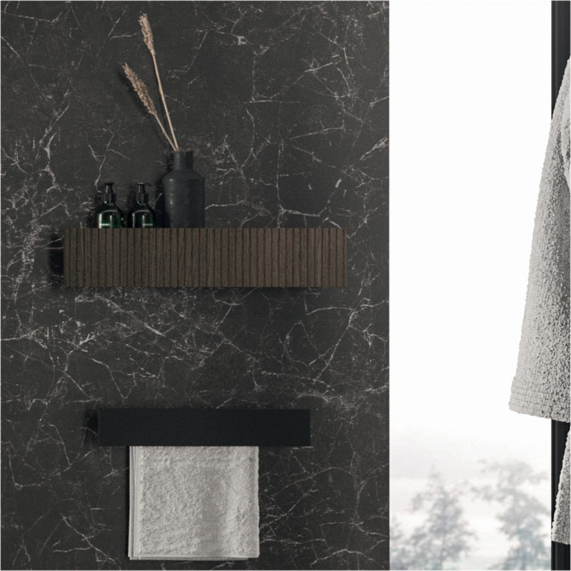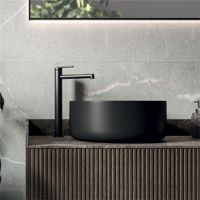 The special tray-shaped stoneware top effortlessly accommodates the Round 40 circular basin in black ceramic. The upper and lower Groove handle in Brunito aluminium provide a comfortable grip to open the Rovere Cacao veneered doors in the Traccia finish with vertical slats.