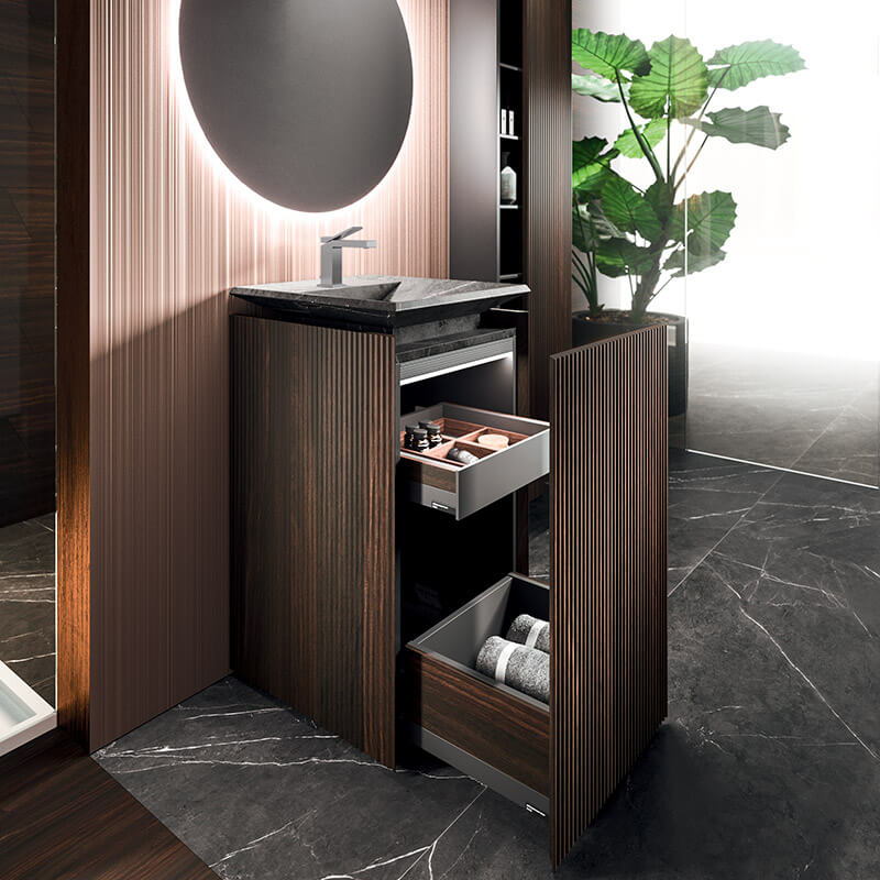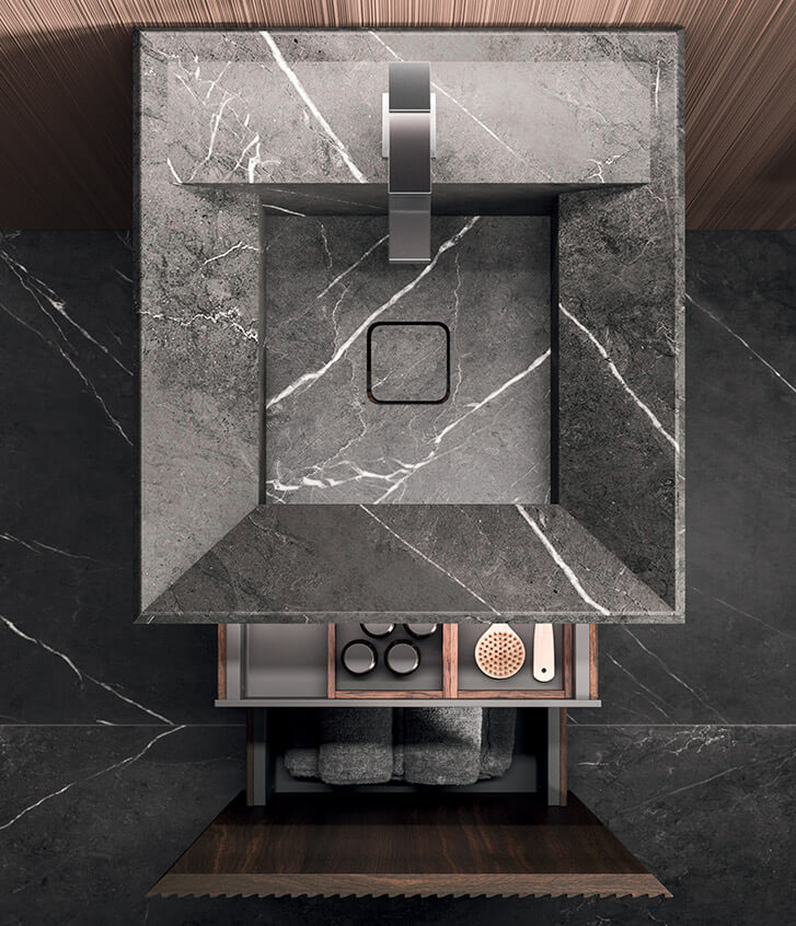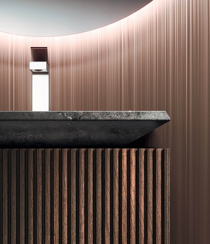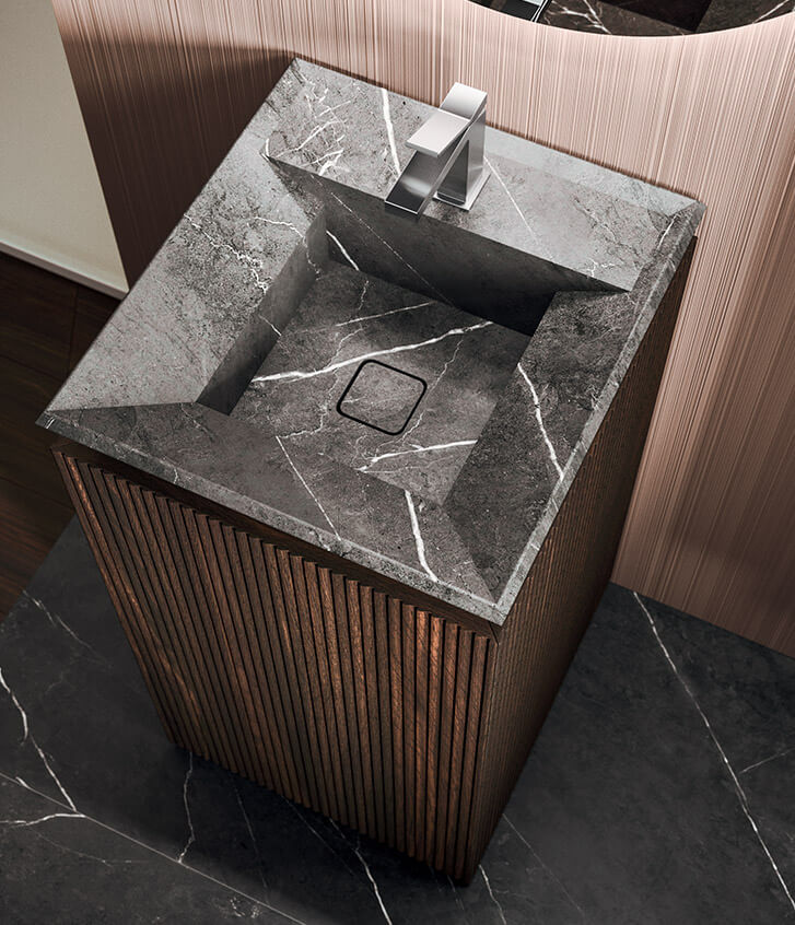 Monolith, the iconic element of the Lympha collection. The Pietra Grey blends with the Rovere Terra Dogato wood, creating a highly sophisticated overall design. Minimalist and absolute.