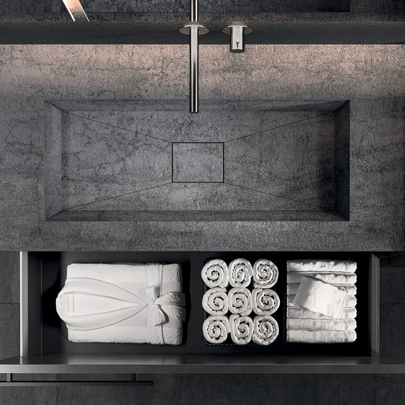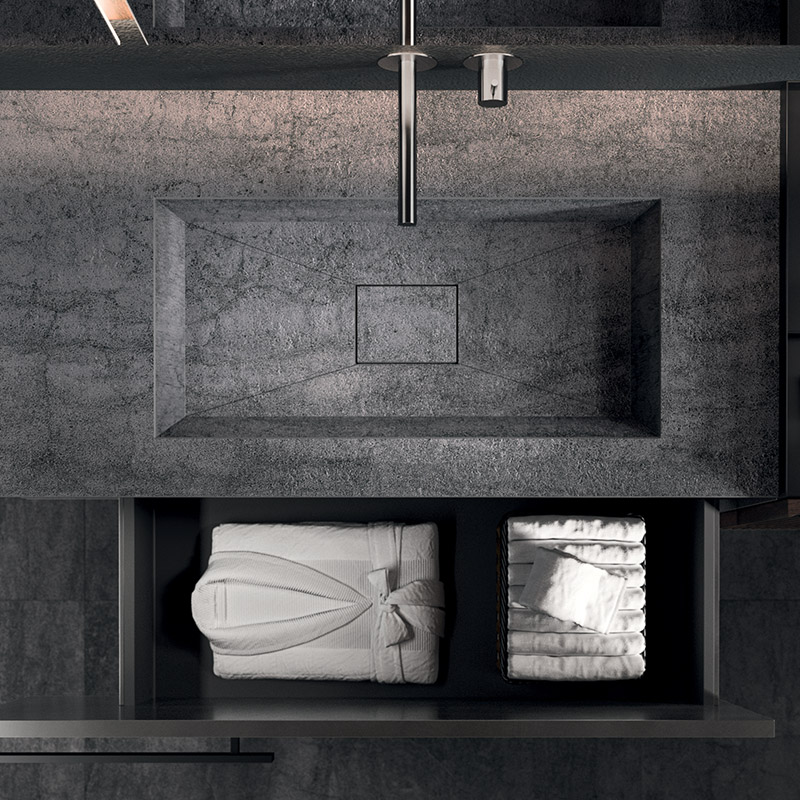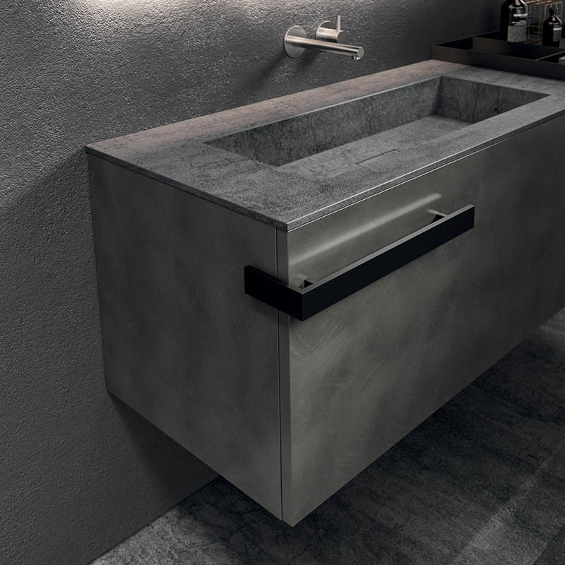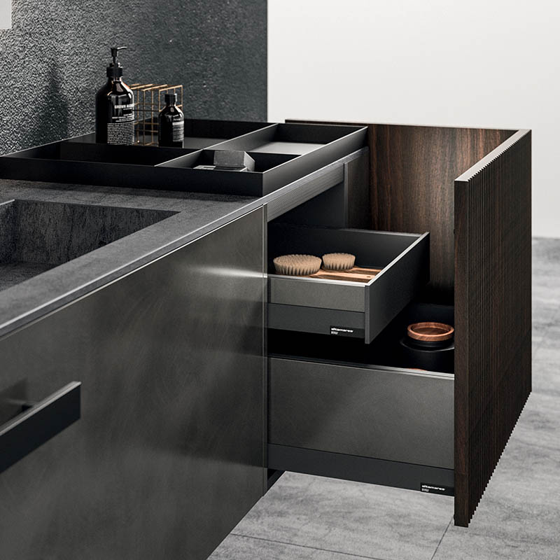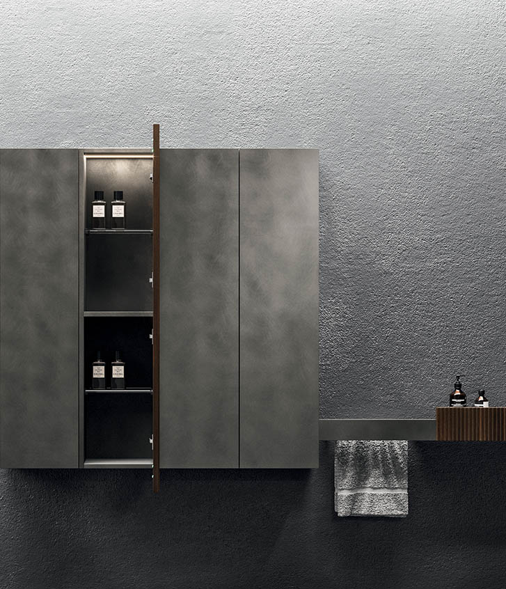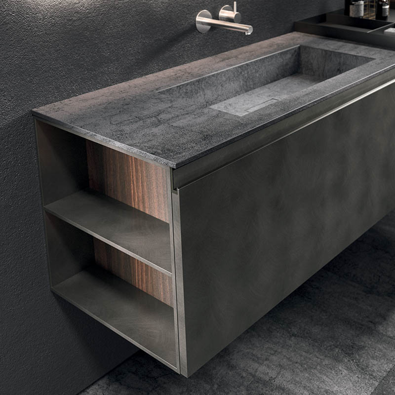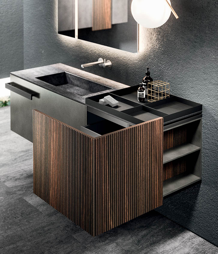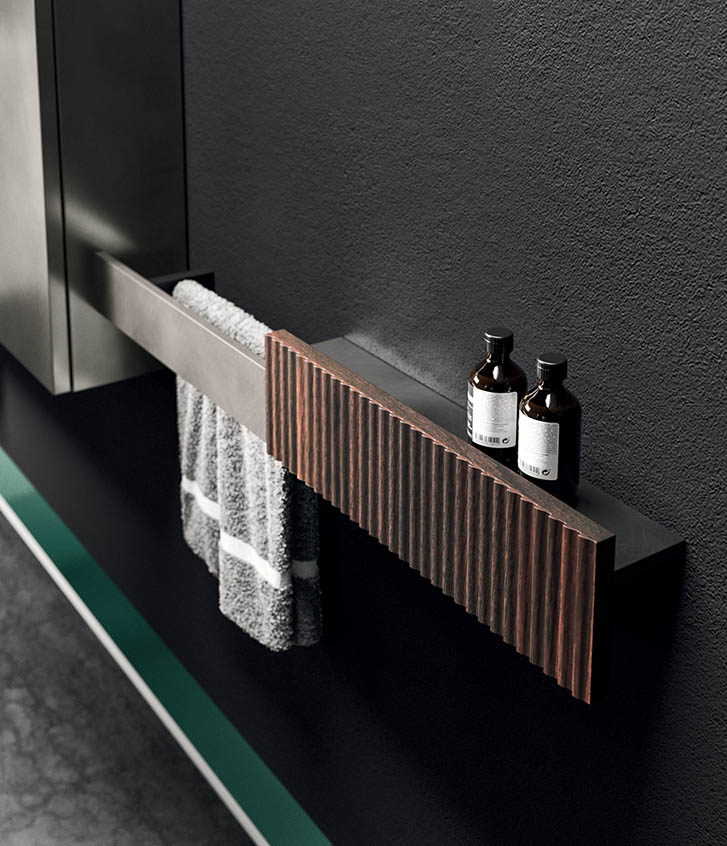 The asymmetrical forms balance out the aesthetic language defined by the elements in Rovere Terra Dogato, which are counterpoised with elements in a refined oxidised lacquer.