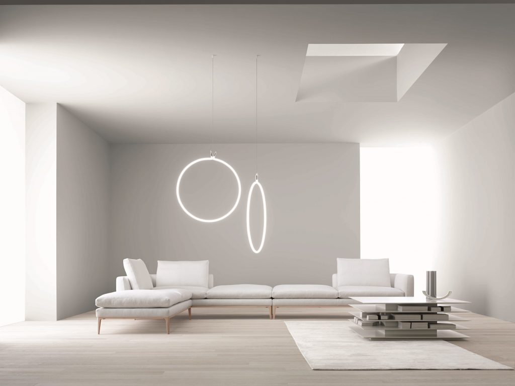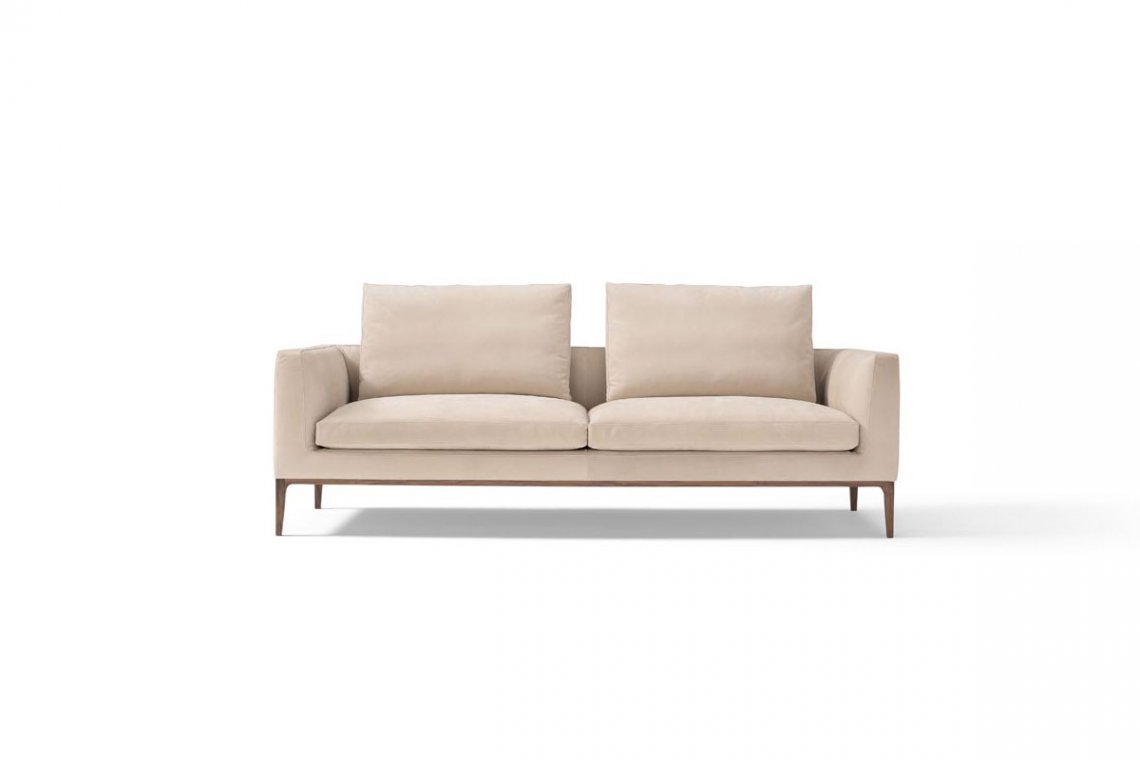 Un tratto continuo disegna il profilo delle sedute, delle spalliere e dei braccioli imbottiti che accolgono morbidi e soffici cuscini.