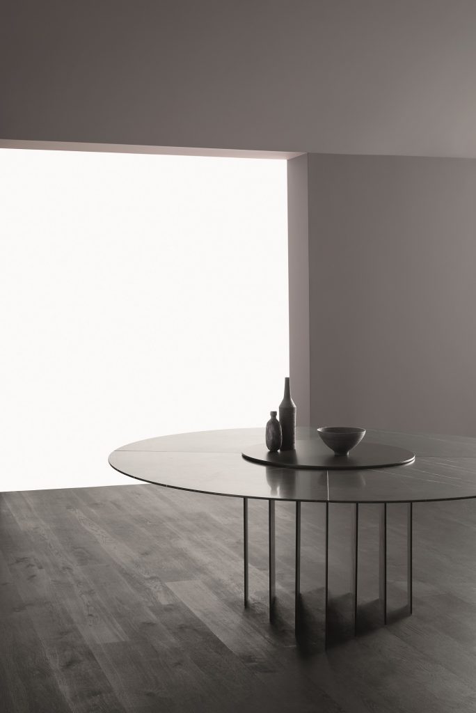 Fragilità e forza, leggerezza e solidità: sono questi i confini entro cui si muovono i tavoli Exilis, con le loro linee essenziali, gli spessori minimi delle lastre che forzano fino all’estremo le potenzialità dei materiali, e al contempo la stabilità assoluta data da esatti rapporti di forza tra basi e top. Contrastano tra loro anche la semplicità formale delle linee che si intersecano creando piani d’appoggio minimali, e l’importanza dei materiali scelti: lamiera metallica per la base e marmo o legno per il top. Exilis è una collezione di tavoli dalla forte personalità che si inserisce in ogni tipologia di living grazie alla capacità di assumere di volta in volta aspetti differenti a seconda delle finiture scelte.