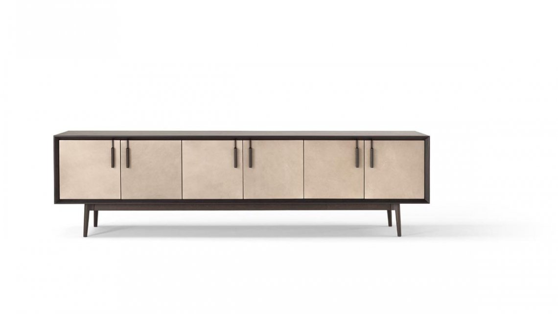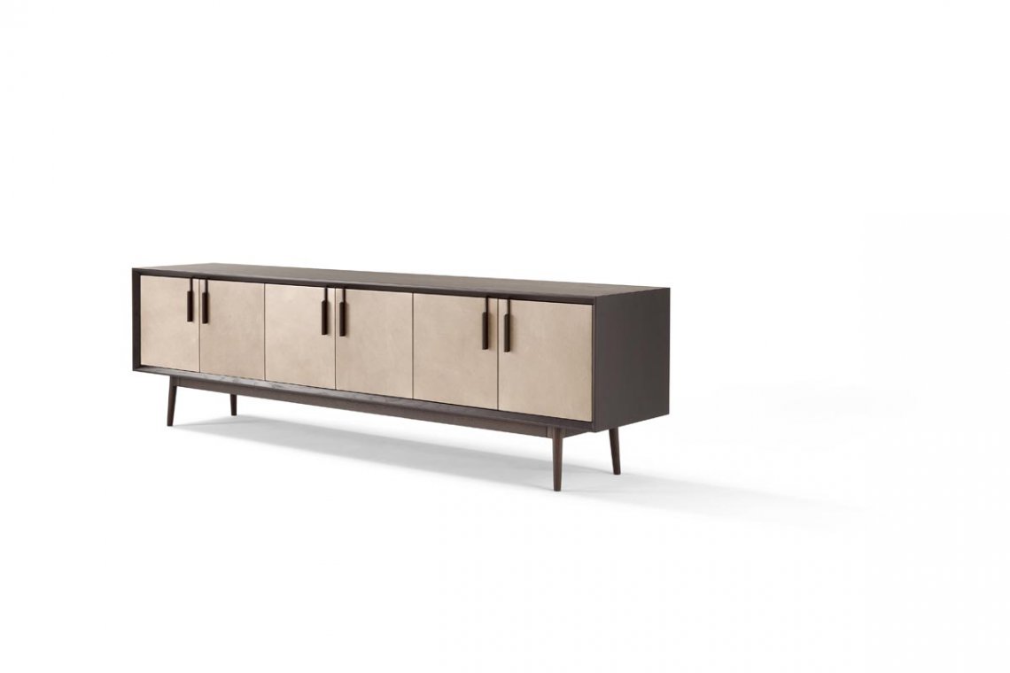Theo è l’interpretazione moderna di un complemento d’arredo tradizionale: la madia. L’elegante contenitore in legno è impreziosito da un dettaglio raffinato: il rivestimento in pelle delle ante, disponibili anche in vetro, a loro volta arricchite da esili maniglie in legno. Anche la base di appoggio, sostenuta da piedini conici, è in legno.