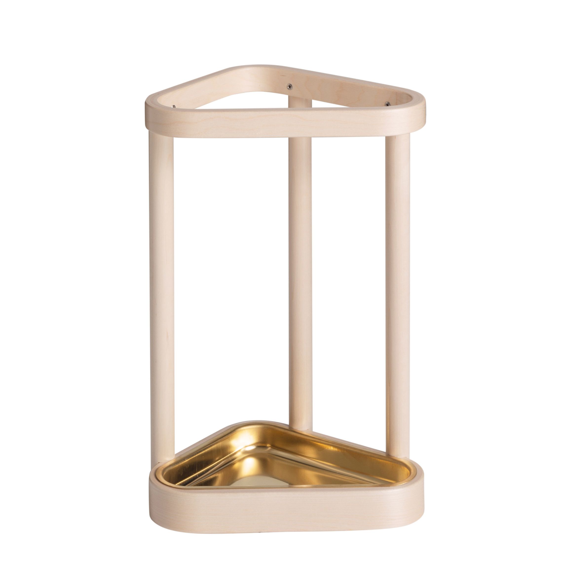 這款雨傘架在當(dāng)前的Artek系列中獨樹一幟,將樺木和黃銅融合在一起,其結(jié)構(gòu)由三個實心樺木柱和兩個手工彎曲的薄片環(huán)組成。 制作雨傘架115時使用的特殊的薄片環(huán)需要兩個人彎曲的力量,并帶有一個接縫。 安裝在三角形底座內(nèi)的黃銅鍋可以捕獲掉落的雨水。 在使用期限內(nèi),由于使用的原因,黃銅會自行產(chǎn)生豐富的銅綠。