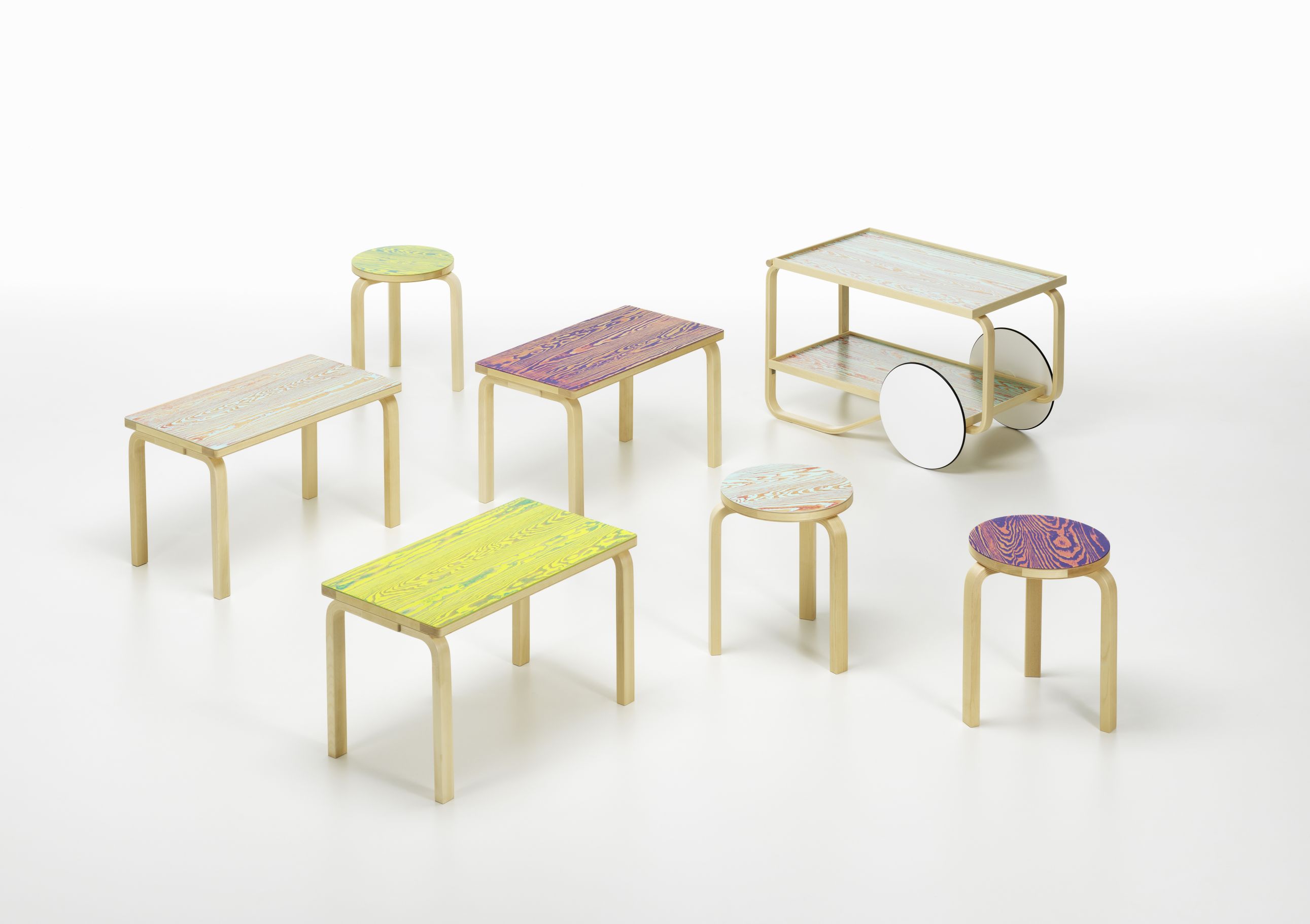 Jo Nagasaka的新穎傳統(tǒng)手工藝以其新穎和現(xiàn)代的表現(xiàn)而聞名。因此,總部位于東京的建筑師和設計師是Artek的FIN / JPN友誼收藏的自然伴侶。長坂(Nagasaka)著手將他在表面處理方面的研究應用到Artek最受歡迎的經(jīng)典作品中。 Nagasaka嘗試了Udukuri和Tsugaru-nuri的古老做法,將它們合并到自己的原始流程中,從而產(chǎn)生了他所說的ColoRing。對于ColoRing,軟木松木用作表面貼面。長坂通過用硬毛刷去除較軟的部分,從而突出木材的天然紋理(Udukuri),從而使木材表面不平坦。然后添加兩層有色漆,隨后將其打磨以部分暴露下面的層(Tsugaru-nuri)。結果是令人驚訝的顏色組合和不規(guī)則的圖案,讓人聯(lián)想起地形圖。保留部分可見的木制結構,保留自然美景,同時創(chuàng)造出迷人的并列感。為了生產(chǎn)ColoRing系列,Artek將這些傳統(tǒng)上完全手工的技術轉化為半工業(yè)工藝,從而使該系列能夠帶給更多的聽眾。使用ColoRing技術處理過的Stool 60,Bench 153B和Tea Trolley 901在芬蘭制造,在世界范圍內都有銷售。