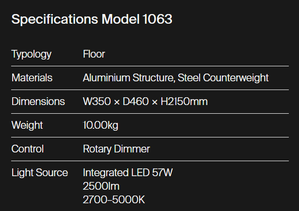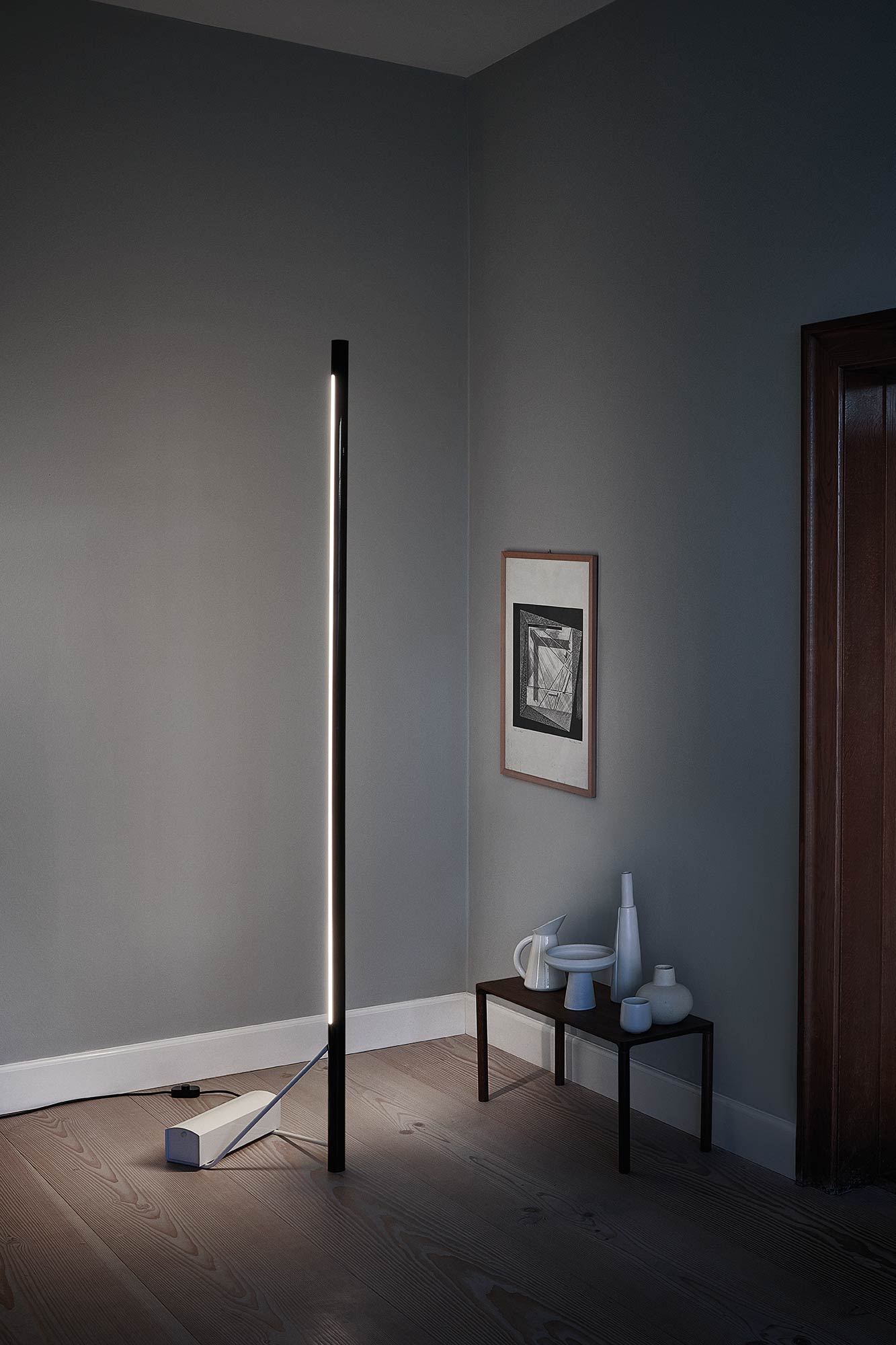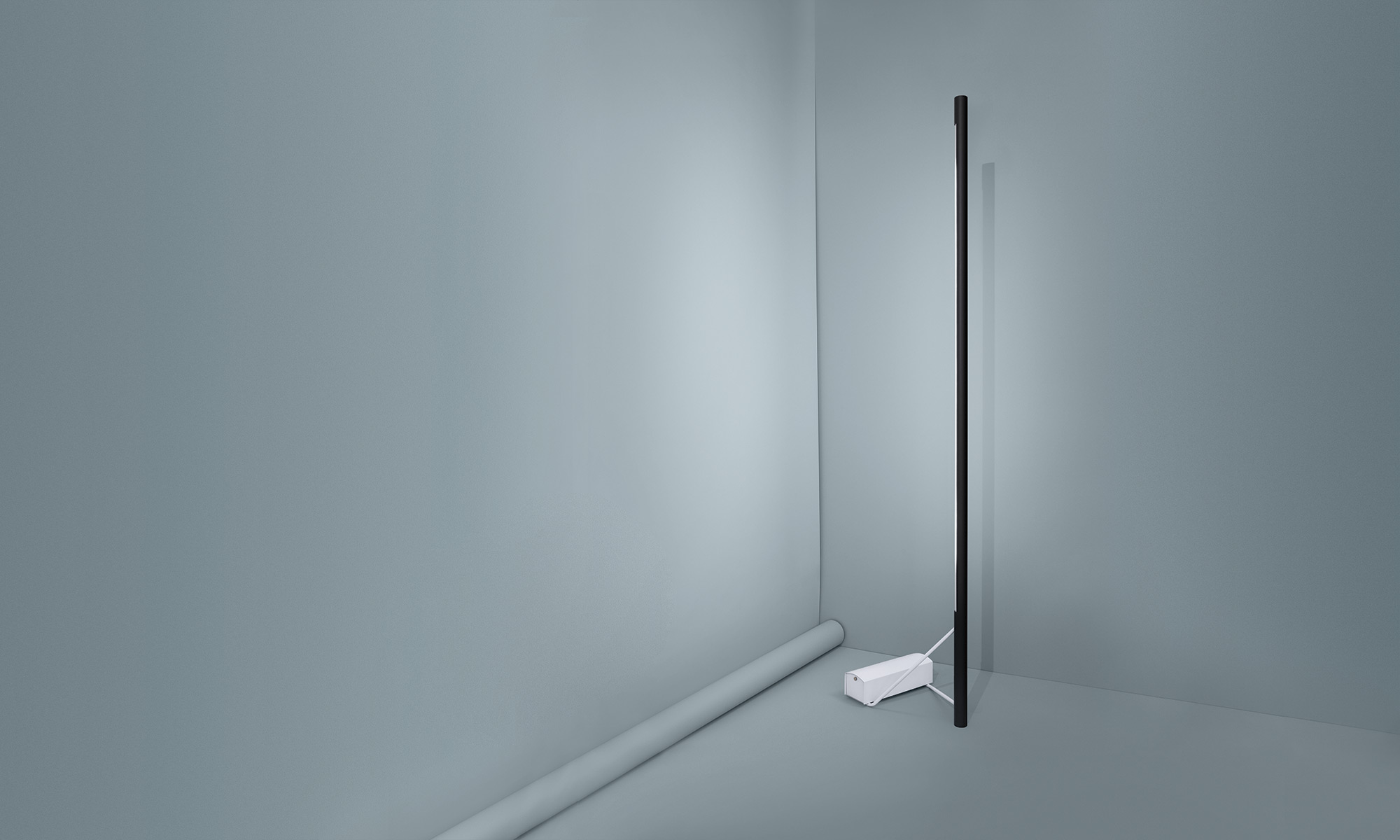 Emitting direct or reflected light, the floor lamp is composed of a thin black or white- painted aluminium tube, which houses the light source. The aluminium base is balanced by an aluminium box, a rounded rectangular section that contains the power supply. The two parts are connected via two steel rods arranged in an unusual off-centre position that appears to estrange them from each other while at the same time lending the luminaire a sense of equilibrium in a seemingly magical way.