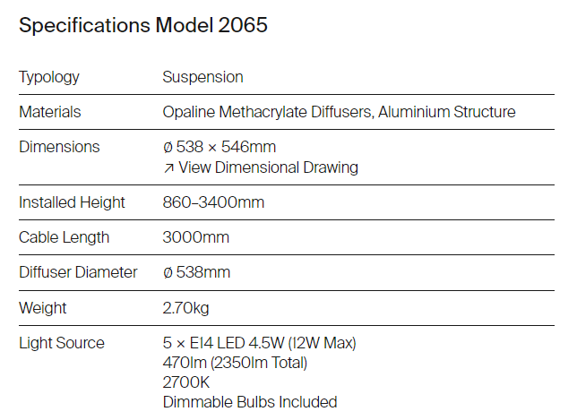 A timeless masterpiece of lightness and elegance, Model 2065 is the result of Gino Sarfatti’s desire to experiment with materials. Gino Sarfatti came across methacrylate samples between 1949 and 1950. This convinced him to create a suspension lamp with this plastic polymer which is much lighter and more resistant than glass. The 2021 version adds to these features in terms of sustainability: the diffusers are made of Green Cast?, a 100% recycled and recyclable PMMA (polymethyl methacrylate) — patented and made in Italy — that has exactly the same aesthetic and functional quality of original methacrylate.