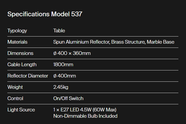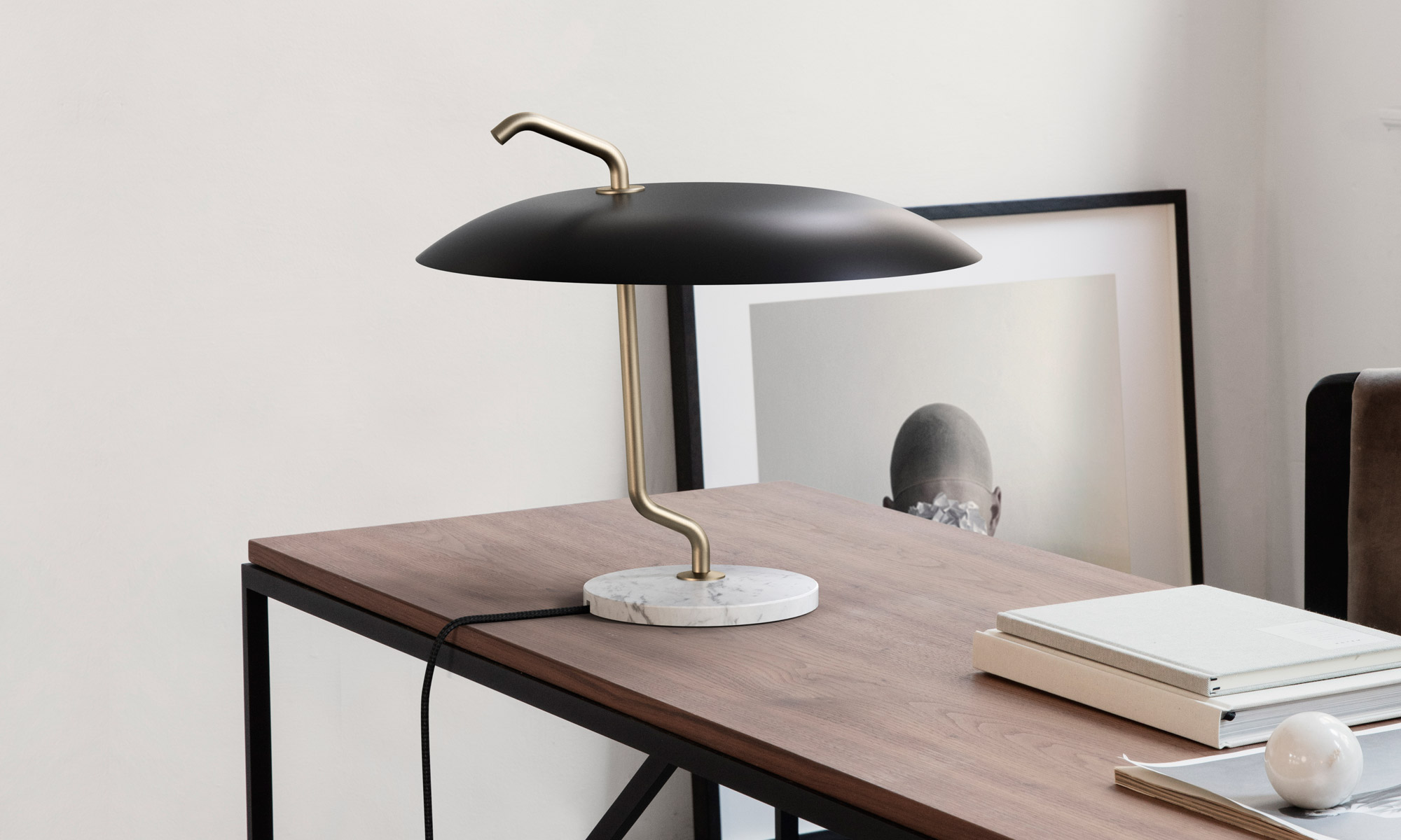 In its refined simplicity, Model 537 stands out owing to the combination of rich materials and ingenious, playful design. The large aluminium reflector in black or white is mounted asymmetrically on a lacquered or brushed brass stem, which is carefully twisted in a beautiful balancing act, coming to rest on an elegant marble base. As a vital part of the design, the stem reaches out through the reflector and beyond in a backward motion, giving the top of the stem a dual function as playful feature and practical handle.