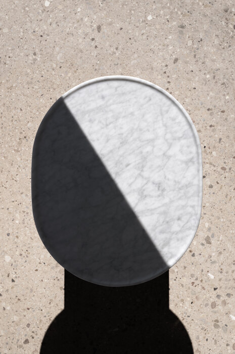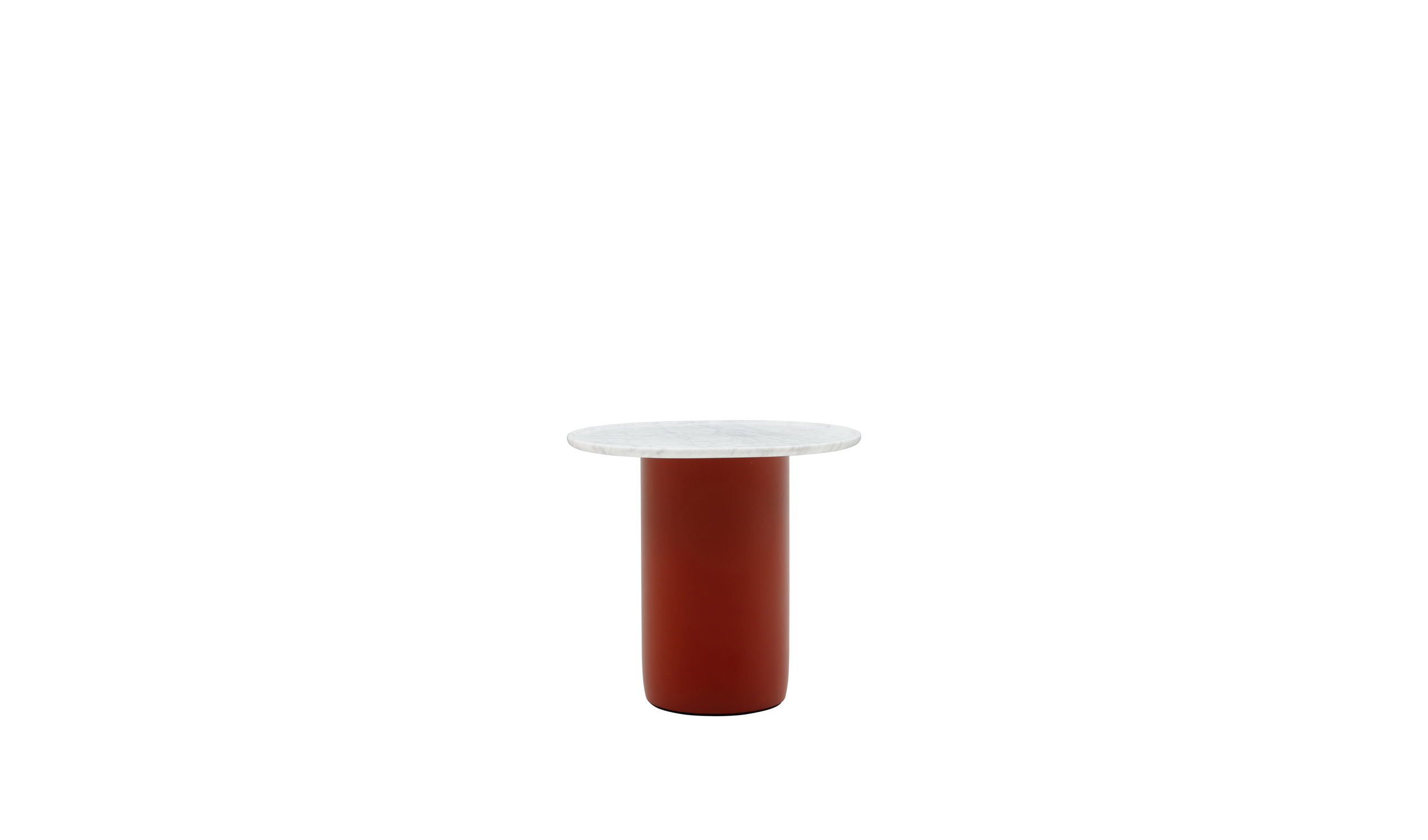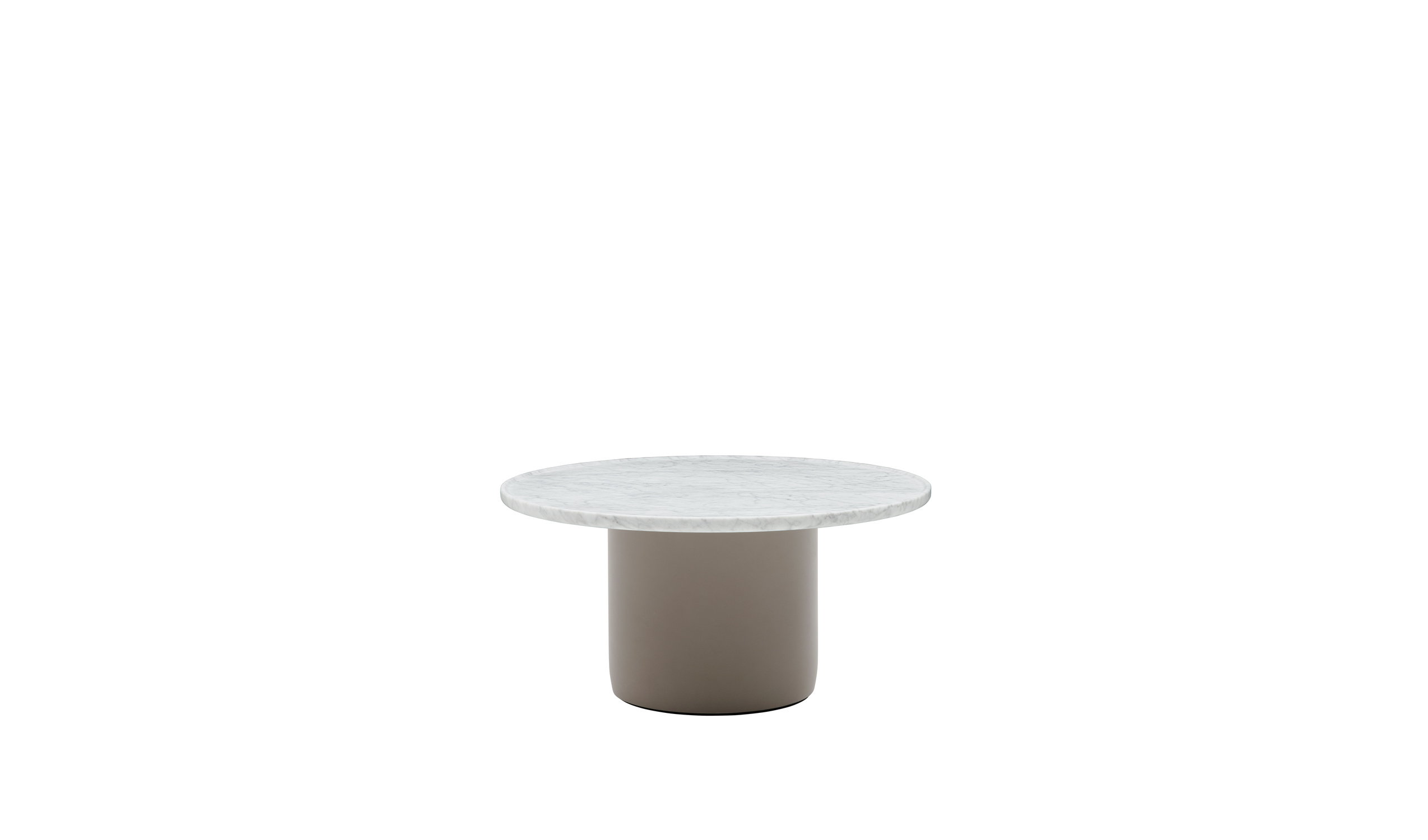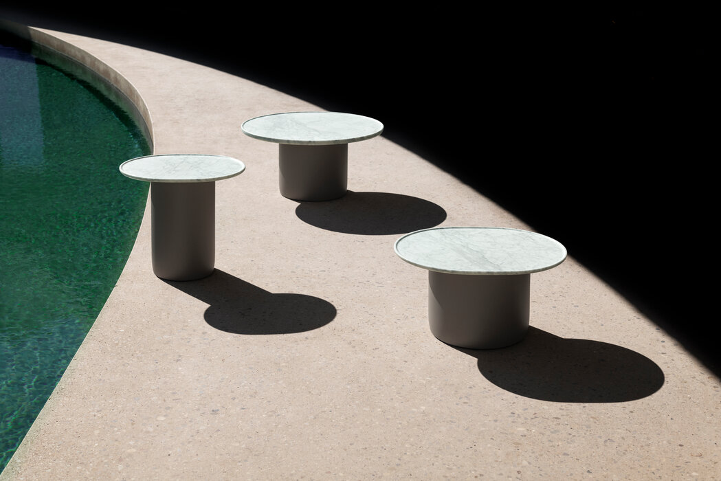 The playful collection of multipurpose coffee tables designed by Edward Barber and Jay Osgerby is offered in outdoor version. Available in different sizes, the small tables feature tops in white Carrara marble and cylindrical bases in rigid polyurethane painted in five painted colours.