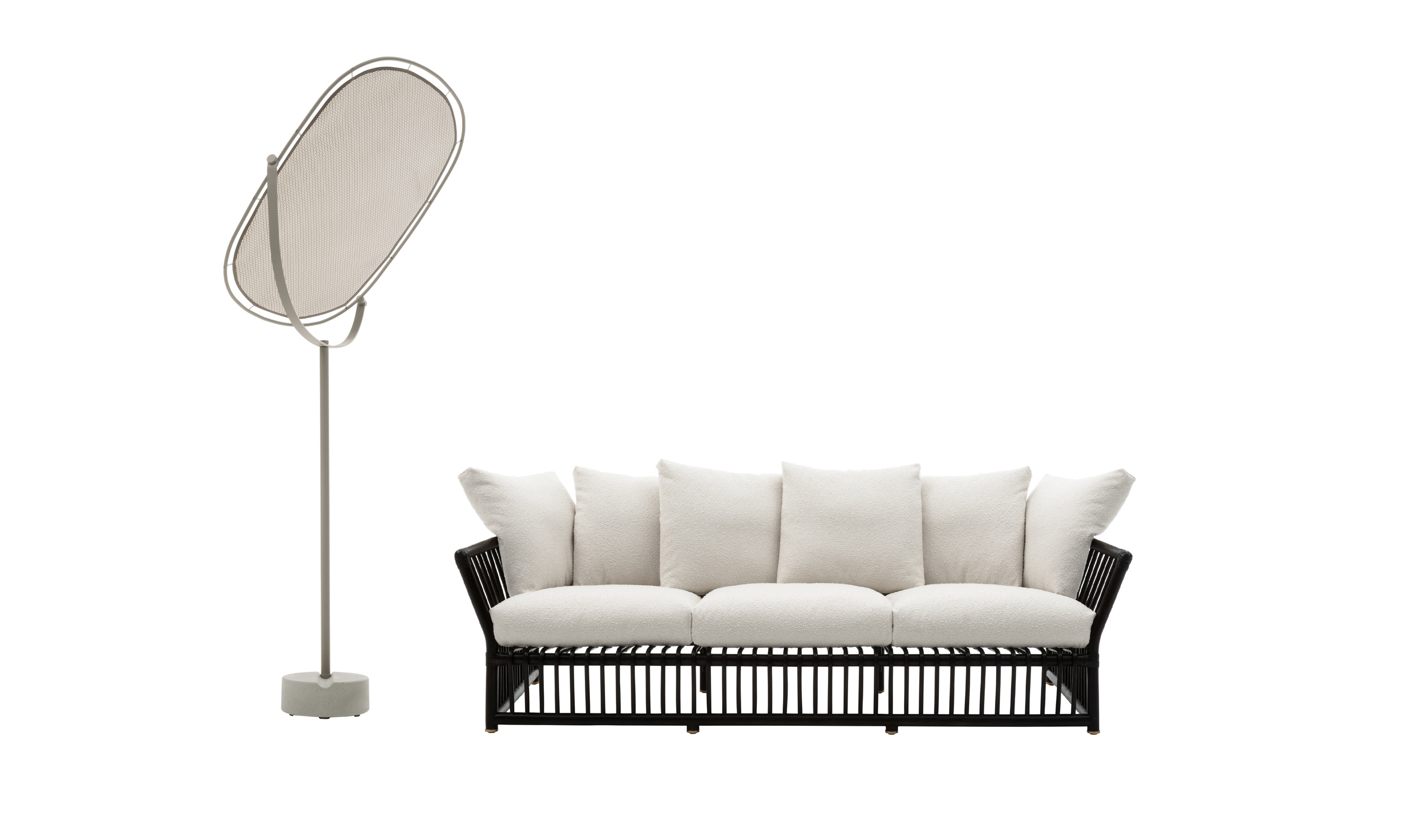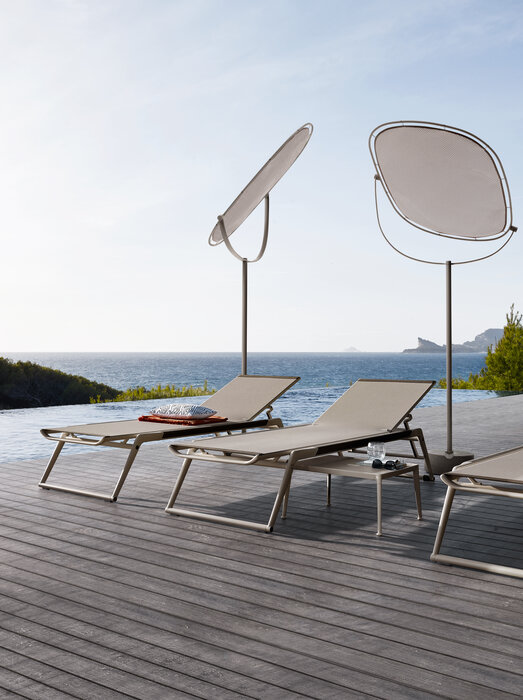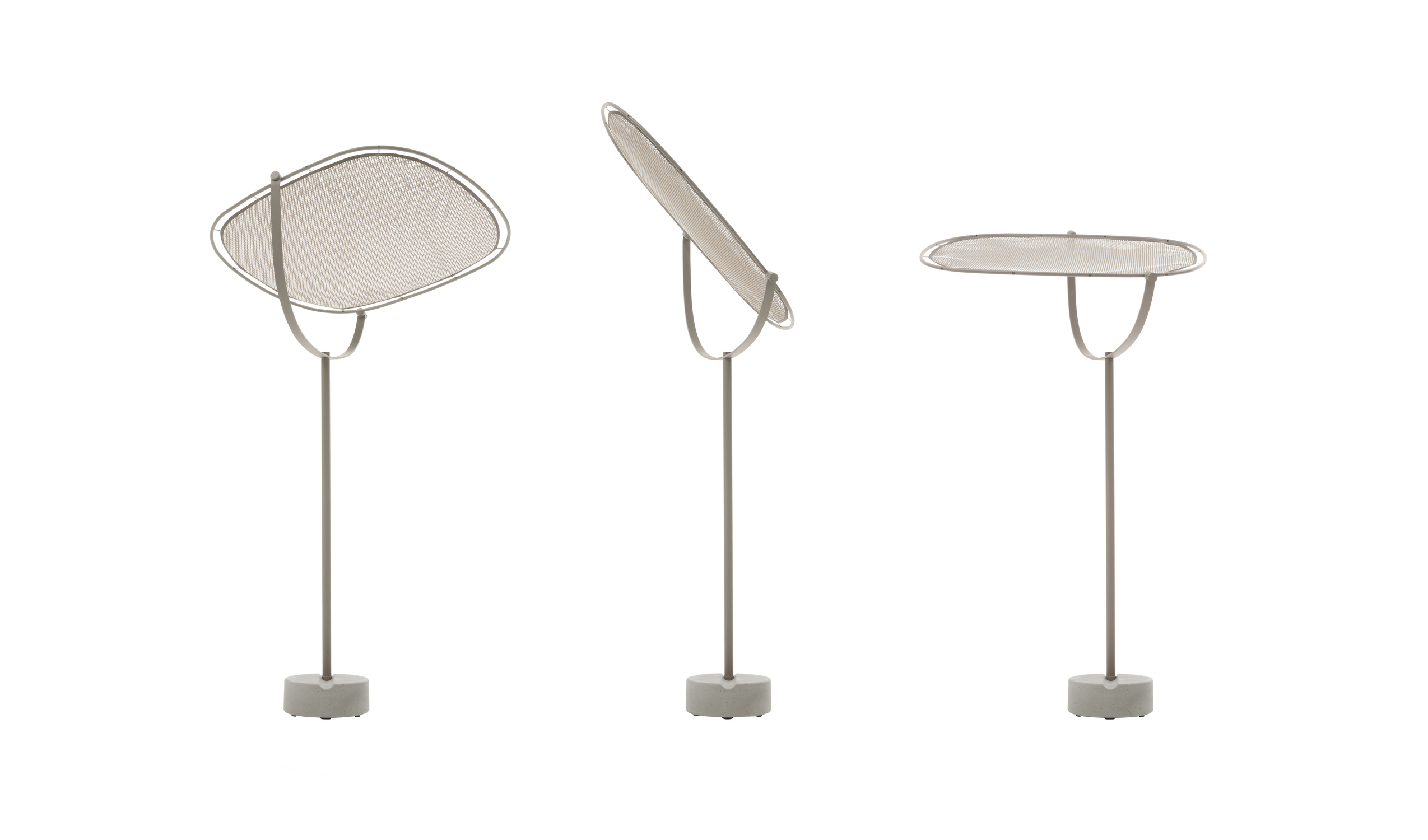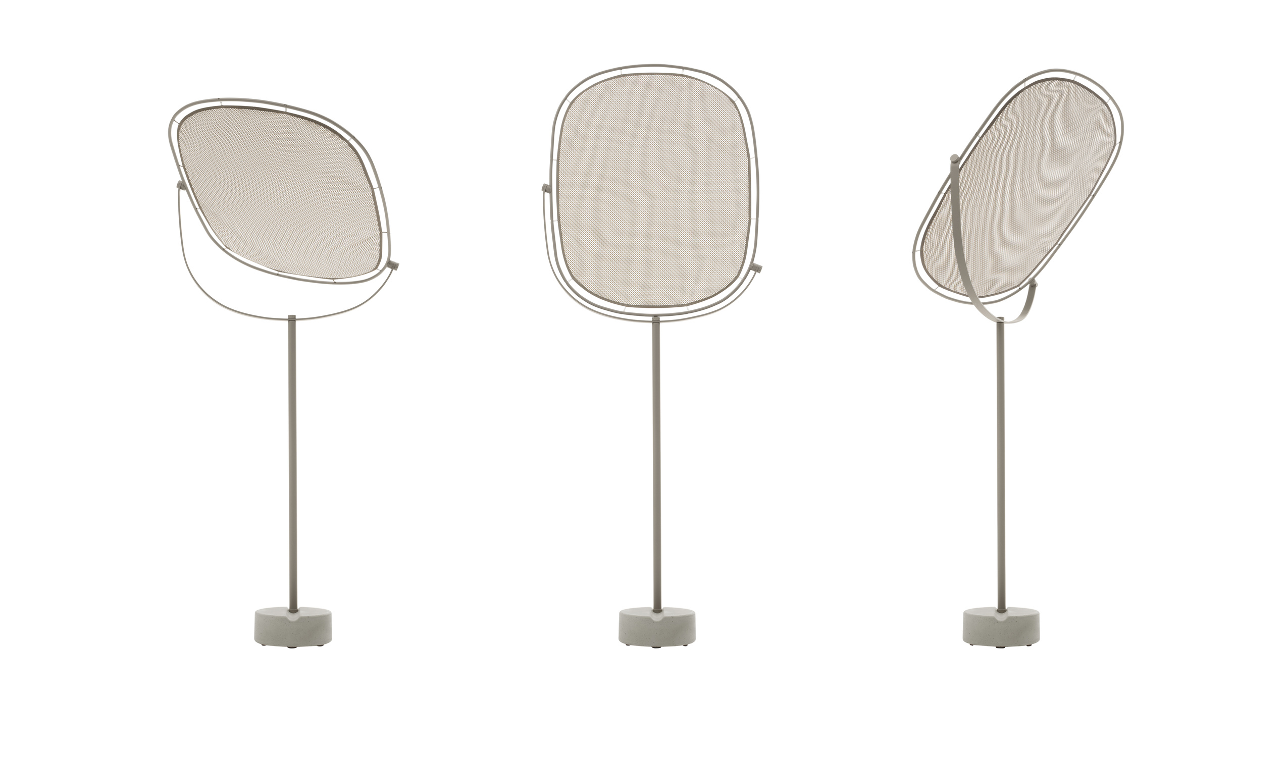 Tesa O’ is a shading element conceived as a style statement and a versatile solution for outdoor spaces, an object that combines aesthetics and functionality in an exemplary manner. The lenticular shape is embellished with an organic straw effect made of high-quality plastic material. The size of the sunshade and the aluminium pole with a 360-degree swivel joint, which allows it to be oriented as one pleases, offer protection from the sun's rays any time of day. The concrete base guarantees stability and safety, even in windy conditions.