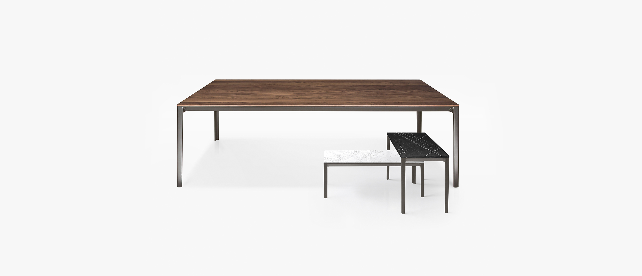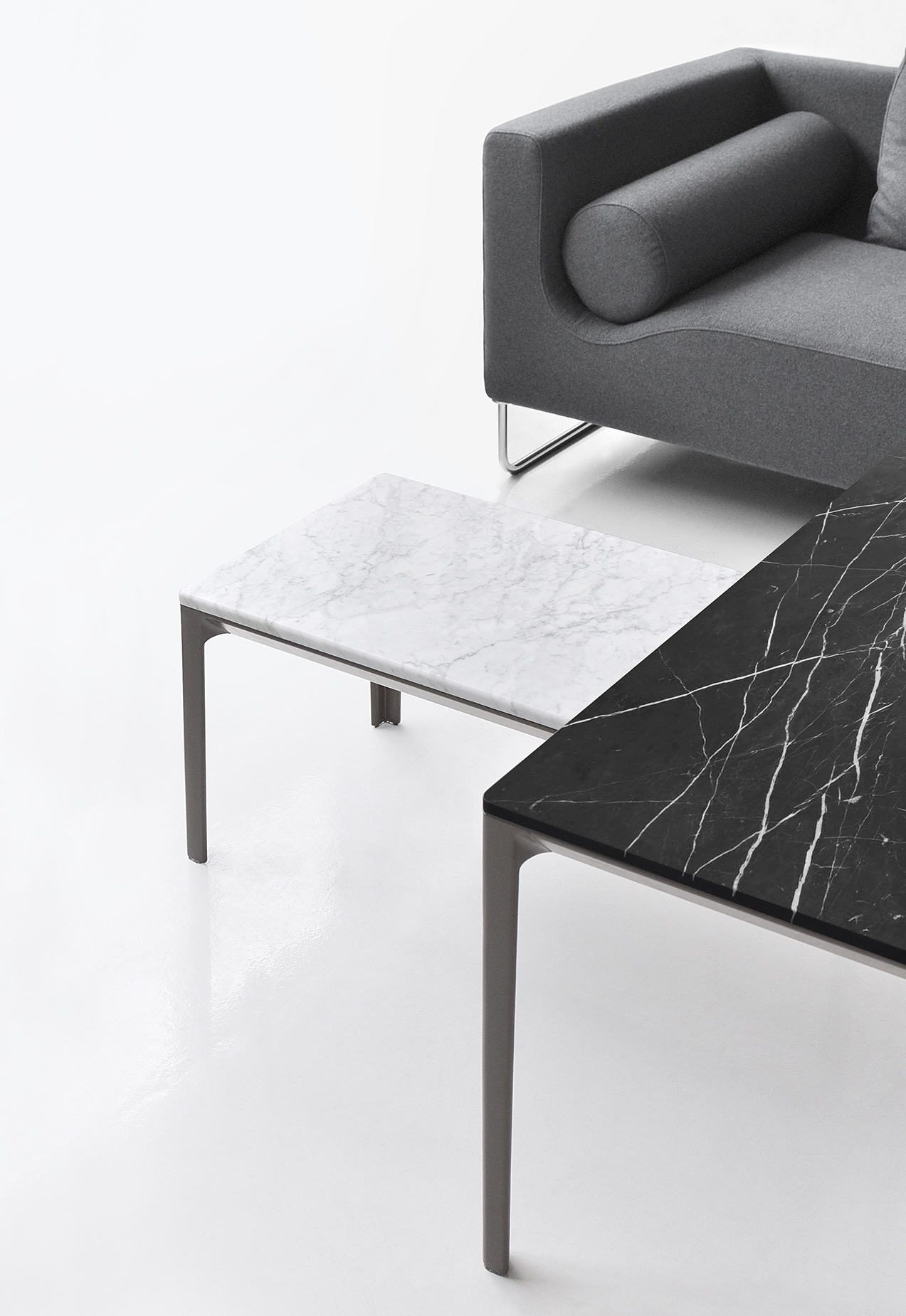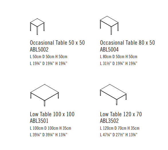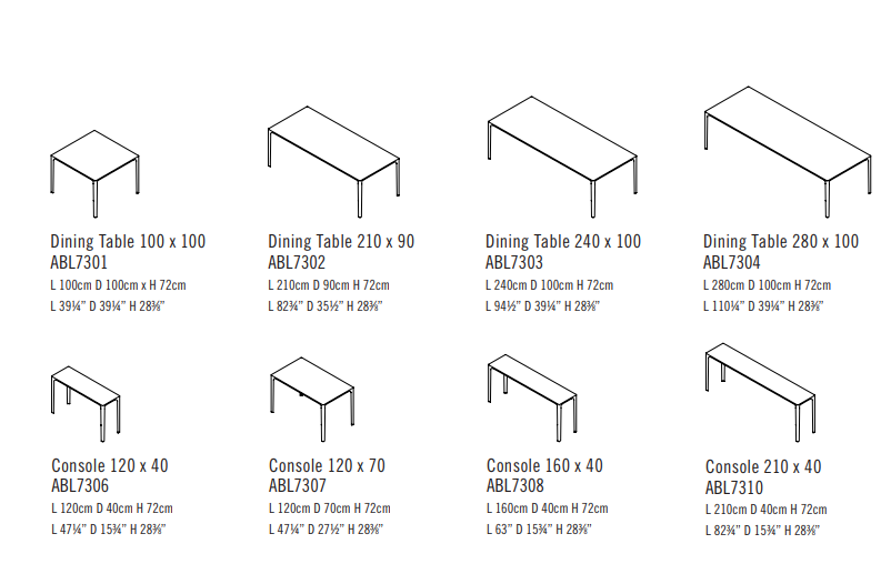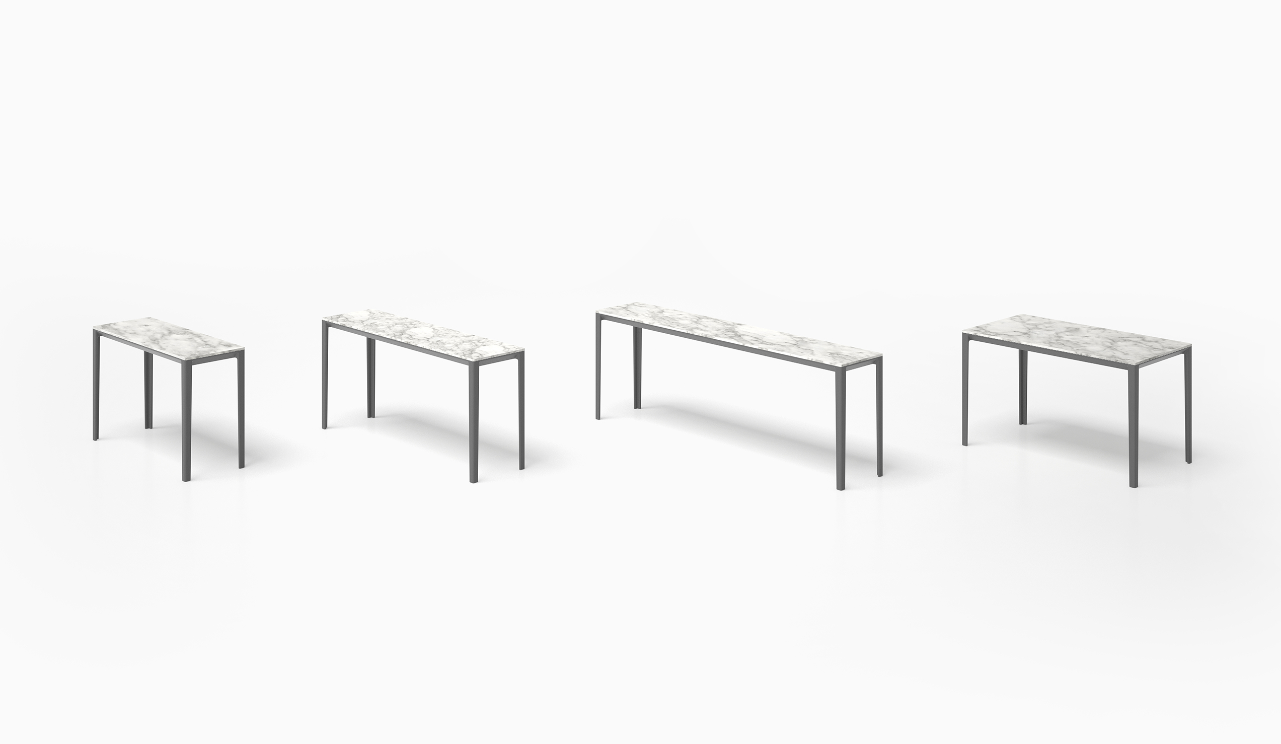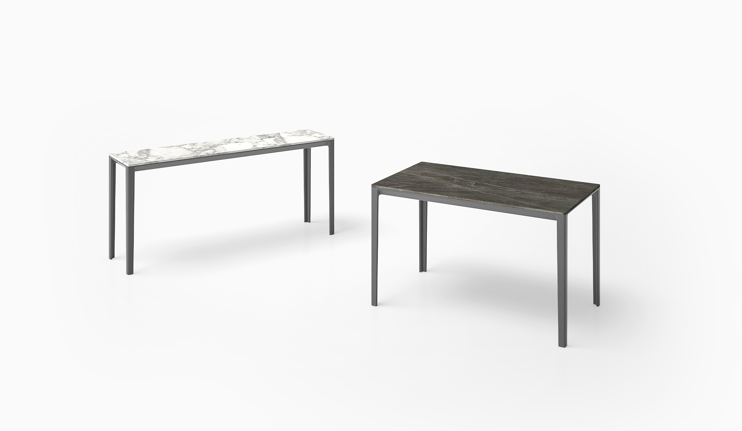 The Able collection is a family of tables that offer a variety of solutions as they are available in several sizes and materials. Cast aluminium legs and aluminium rails support tops in wood, marble and Polaris.