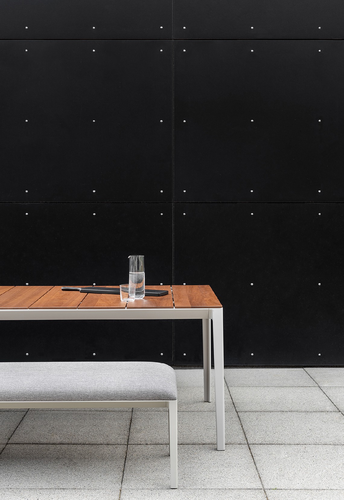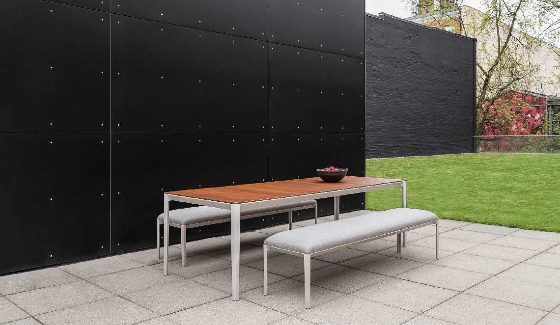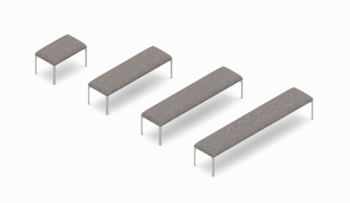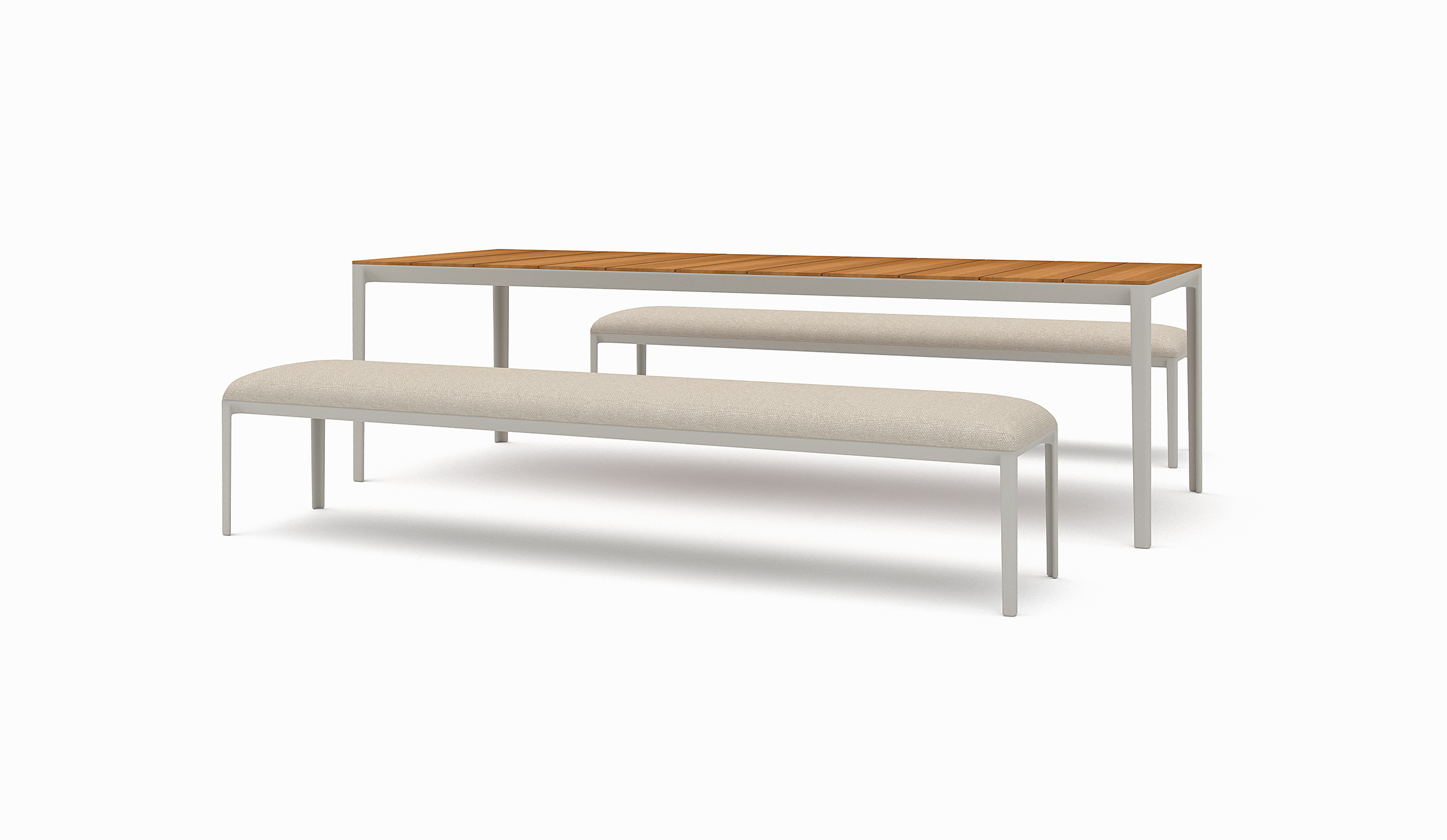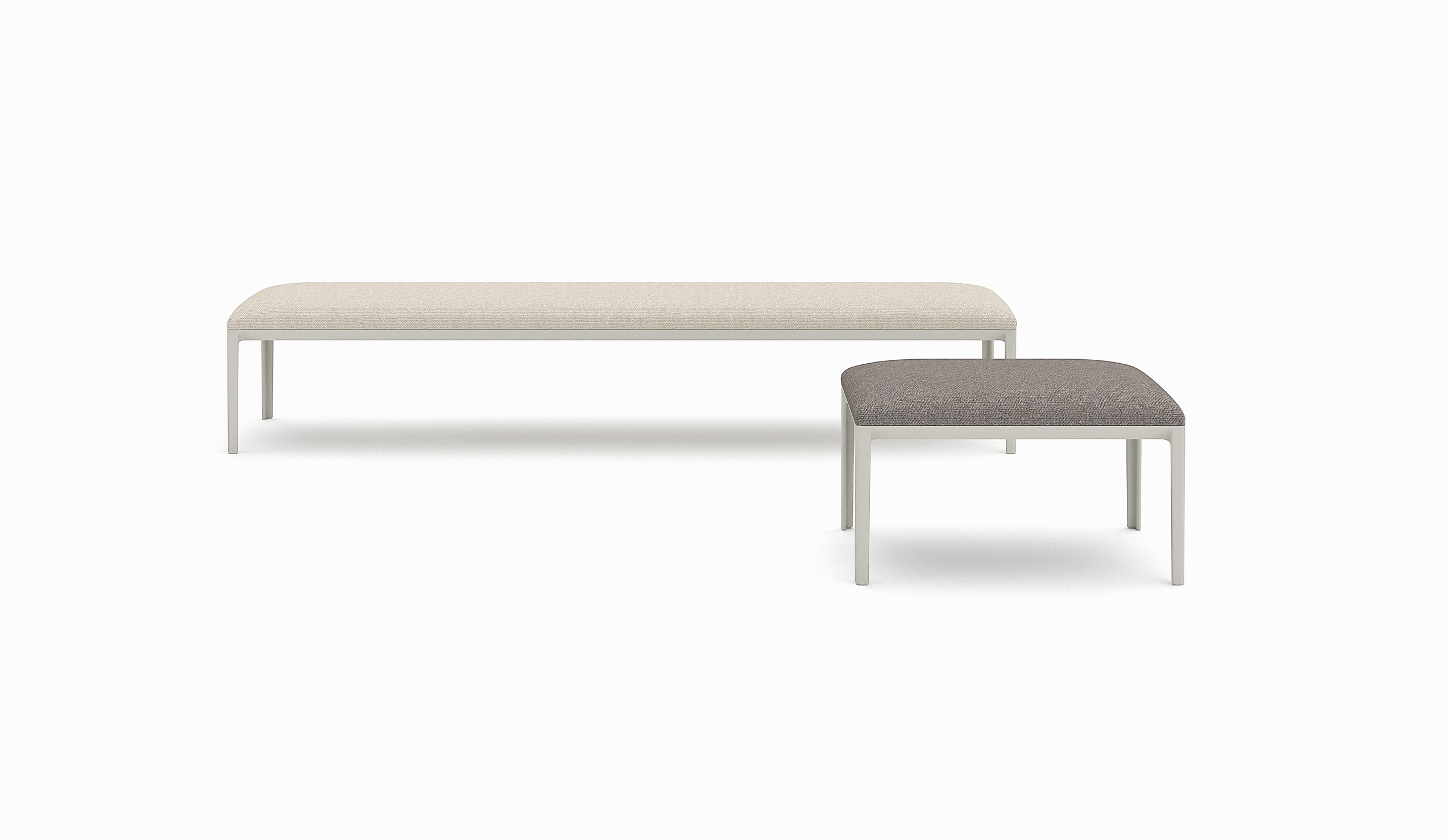 Resting upon the rigid aluminum frame of the outdoor bench a padded cushion enables comfortable seating for multiple people.