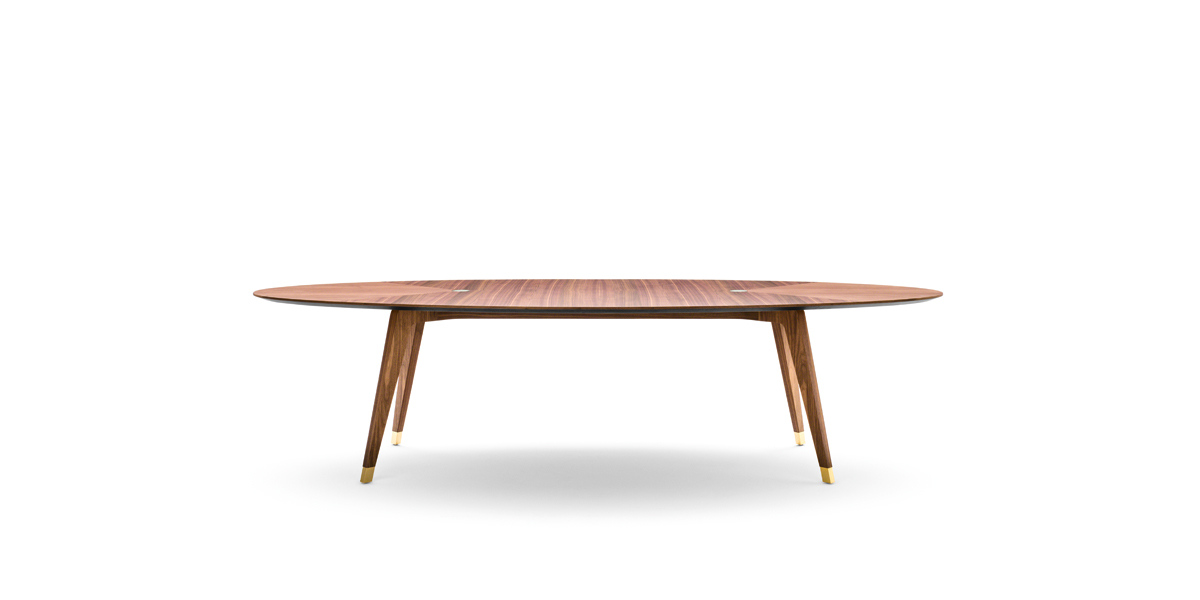 Tavolo con struttura in Noce Canaletto massiccio e piano in MDF impliacciato in Noce Canaletto. Puntali e inserti in