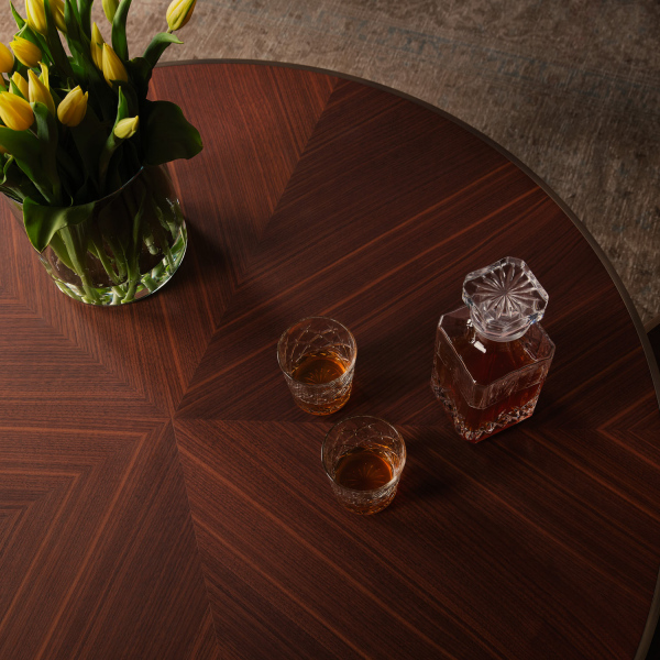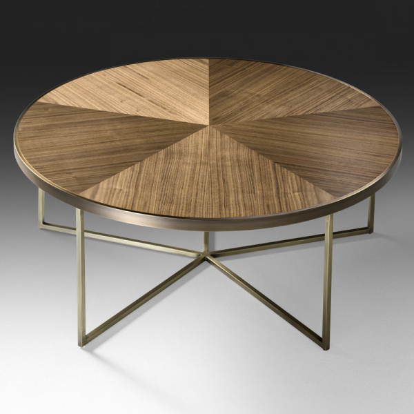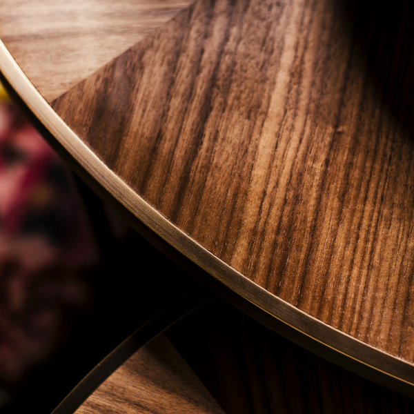 Round tables with structure in metal dark bronze matt finishing. Top in MDF with Canaletto walnut veneer and