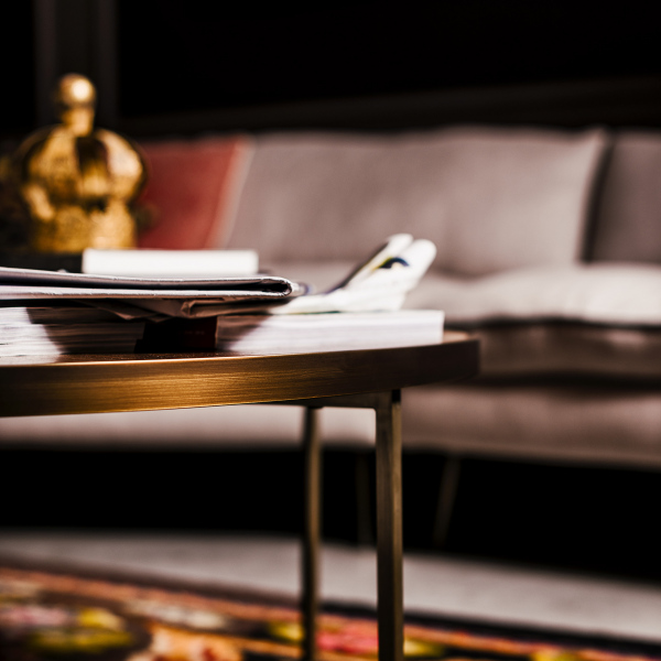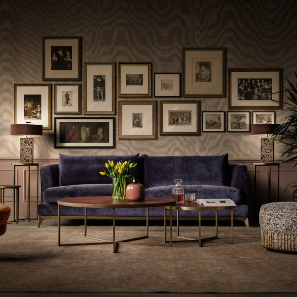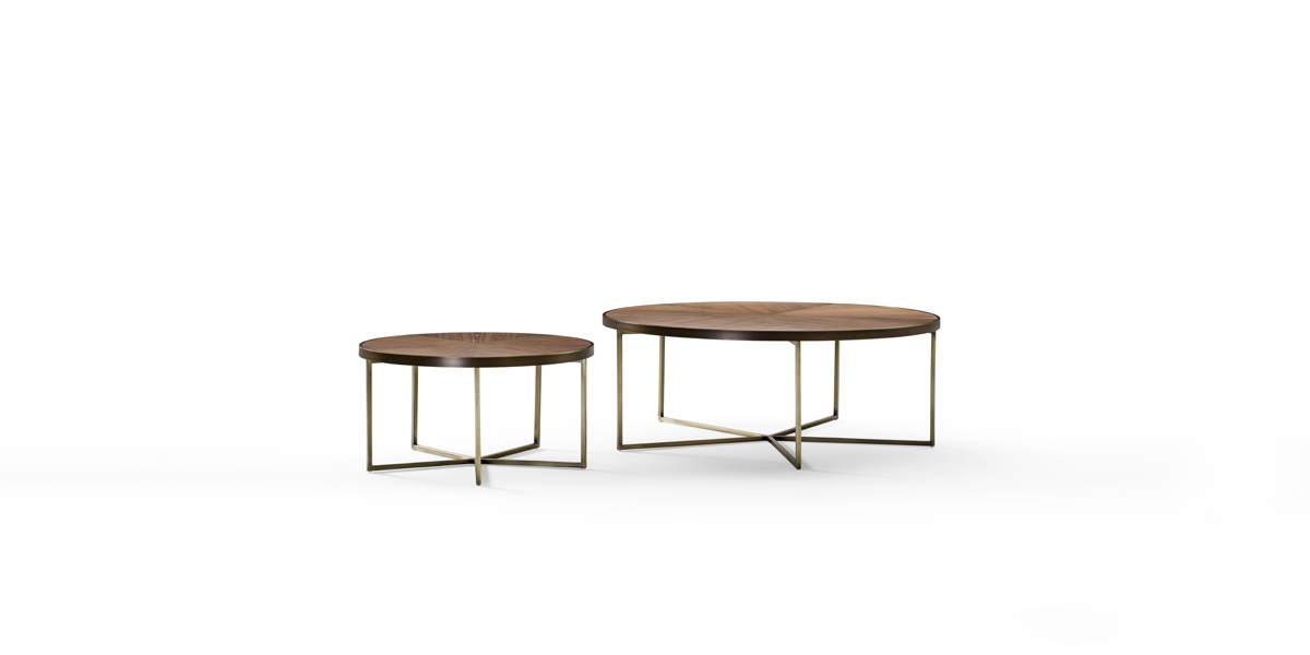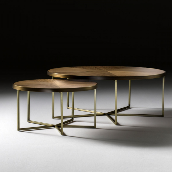 Tavolini tondi con struttura in metallo finitura bronzo scuro opaco. Top in MDF impiallacciato in noce Canaletto,