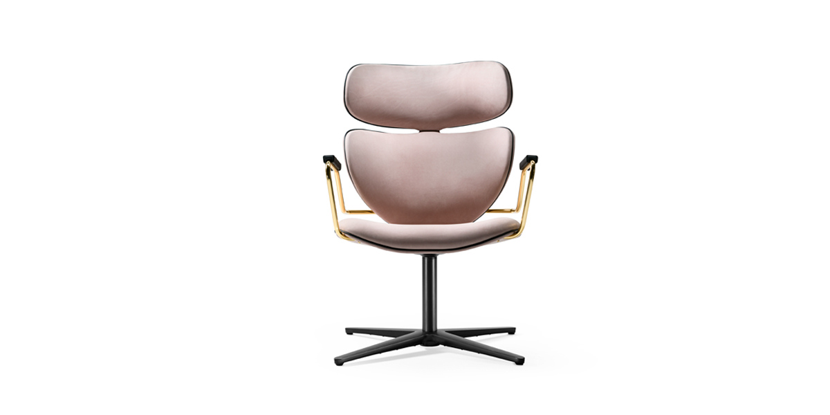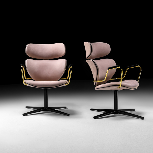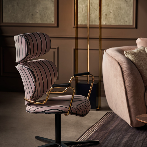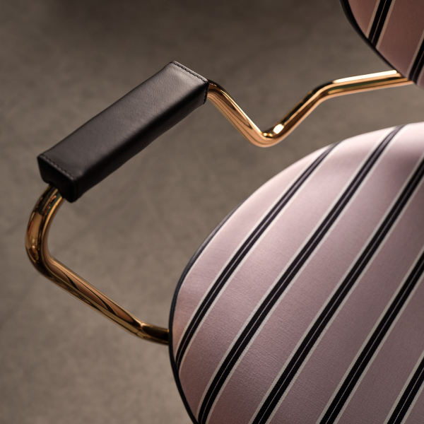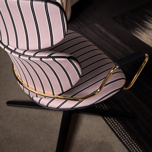 expanded polyurethane. Armrest in stainless steel polished gold finishing. 4-point-star base in die-cast aluminium,