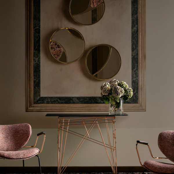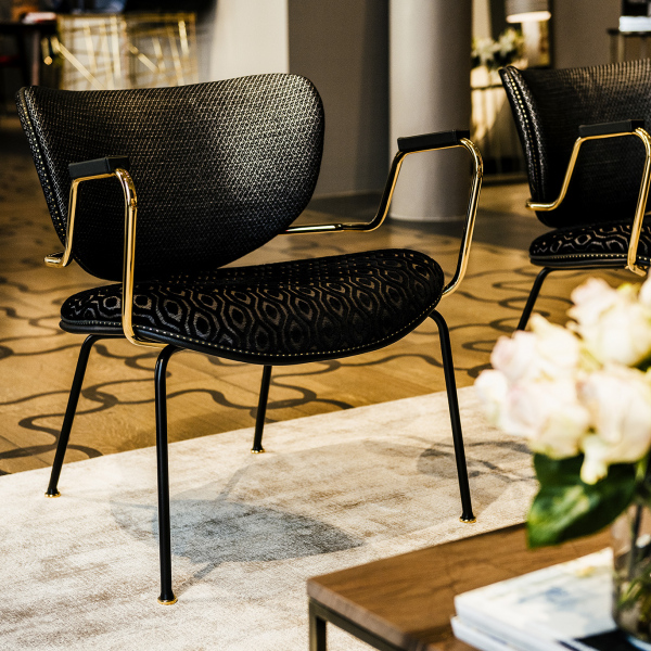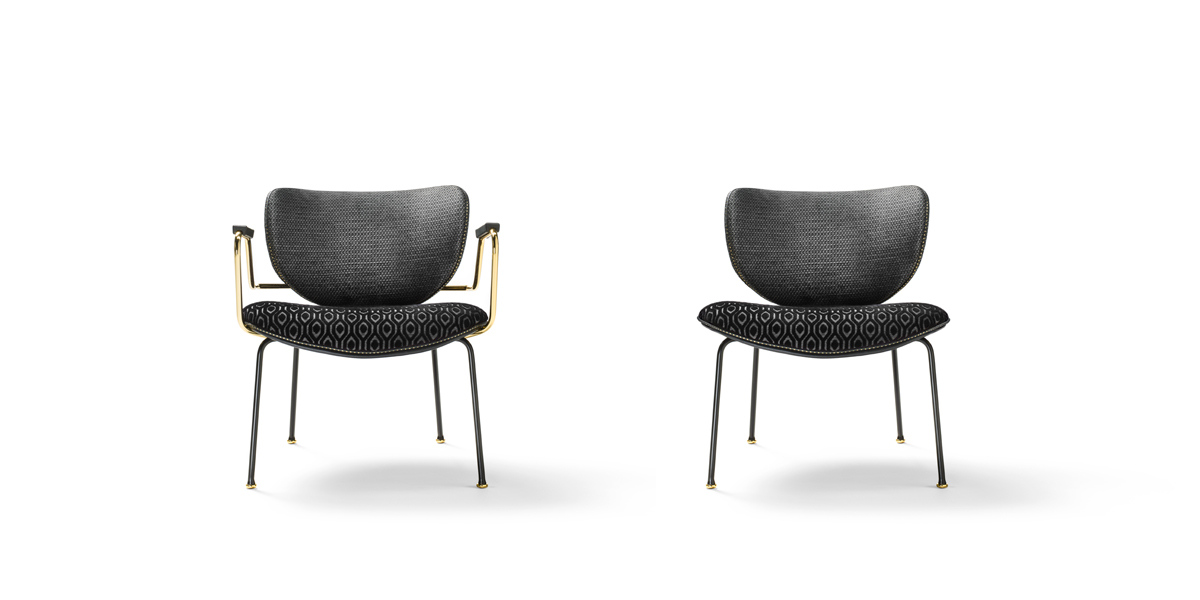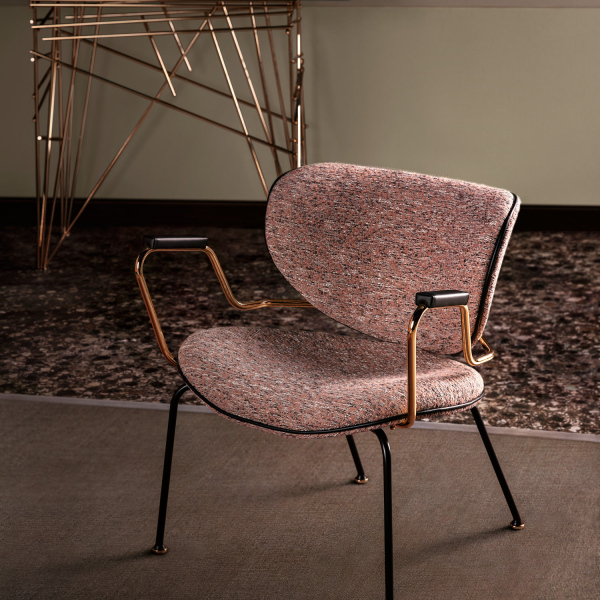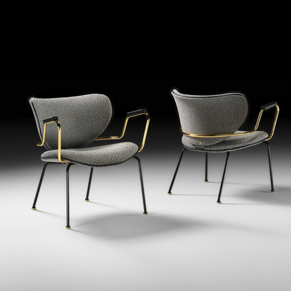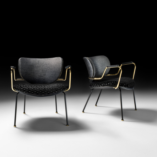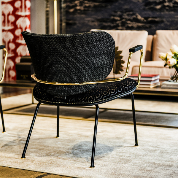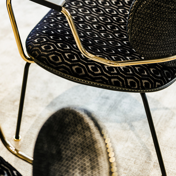 expanded polyurethane. Metal glides and armrest (optional) in polished gold finishing. Non-removable cover.