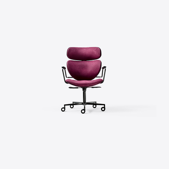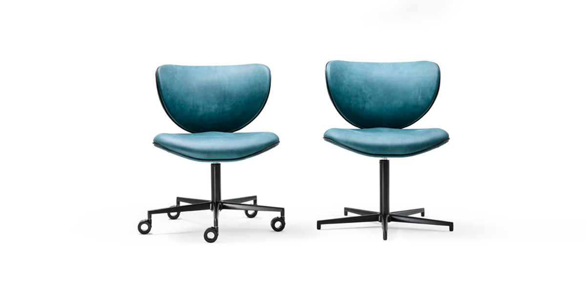Armchair with swivel base and seat, back in curved beech wood, padding in high-resilience expanded polyurethane.