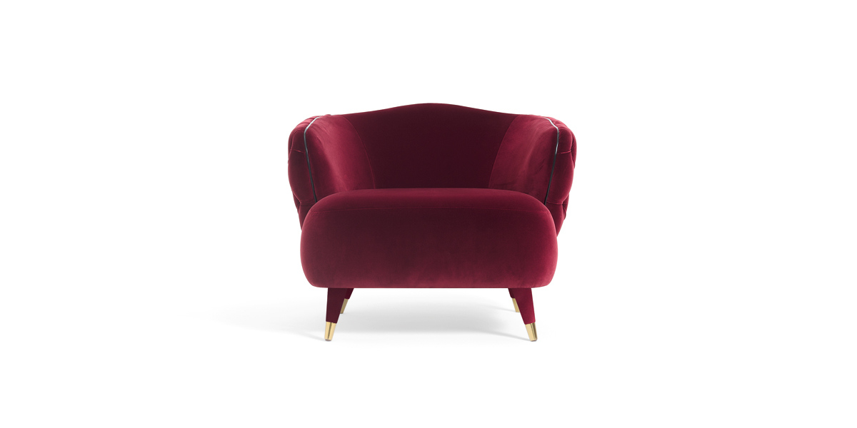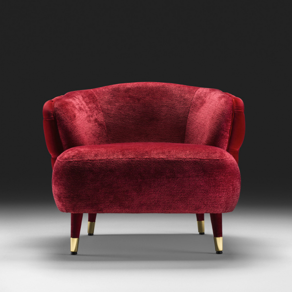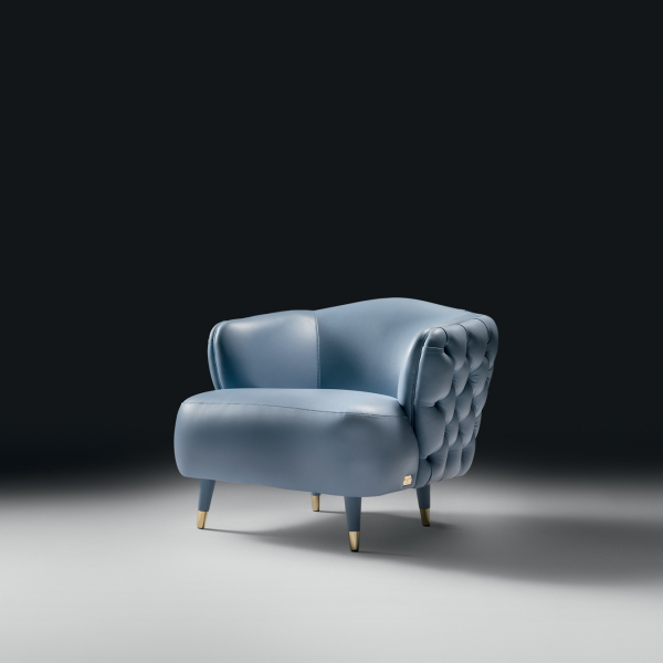 polyurethane in different densities. Tufted rear back. Feet upholstered with glides in metal polished gold or matt dark