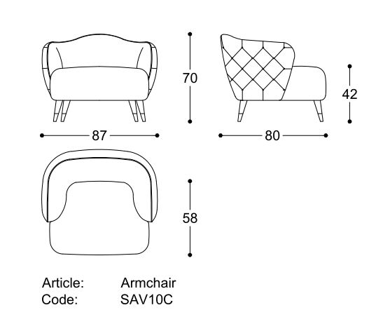 Poltrona con struttura in legno massiccio, molleggio a nastri di cinghia elastica. Imbottitura in poliuretano a quote