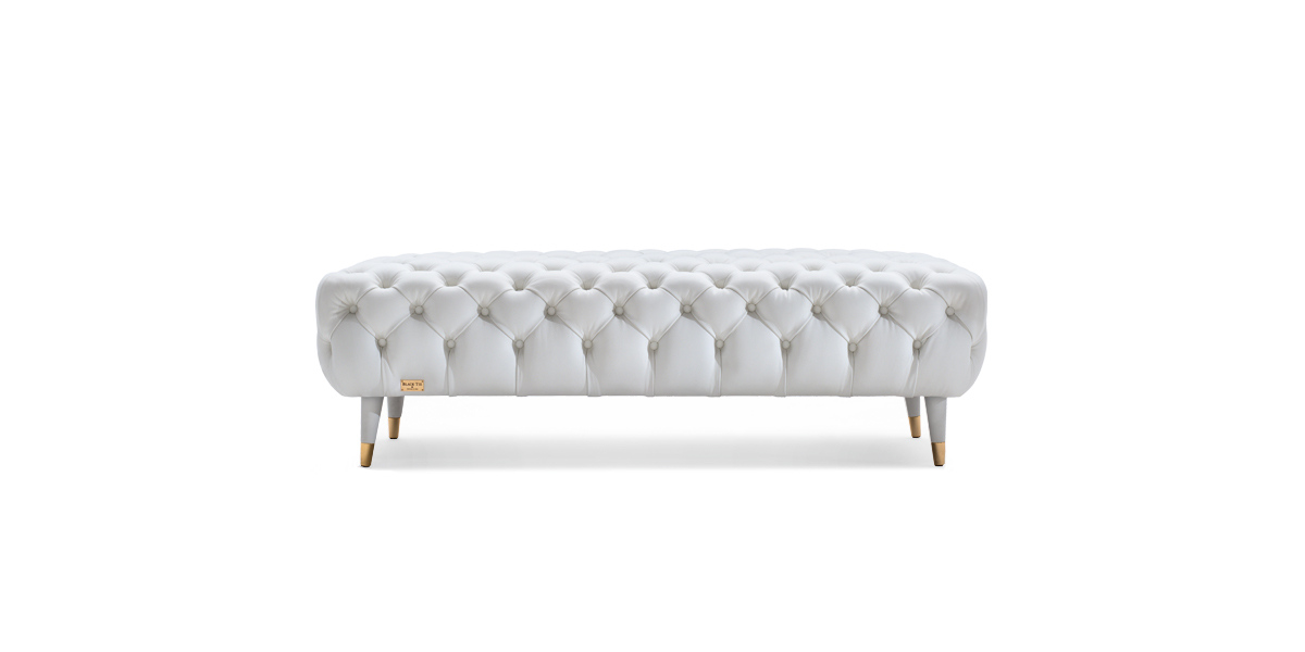 Tufted upholstery, non removable cover. Feet upholstered with metal glides in polished gold or dark bronze matt