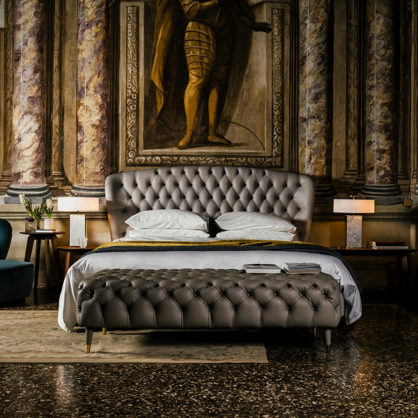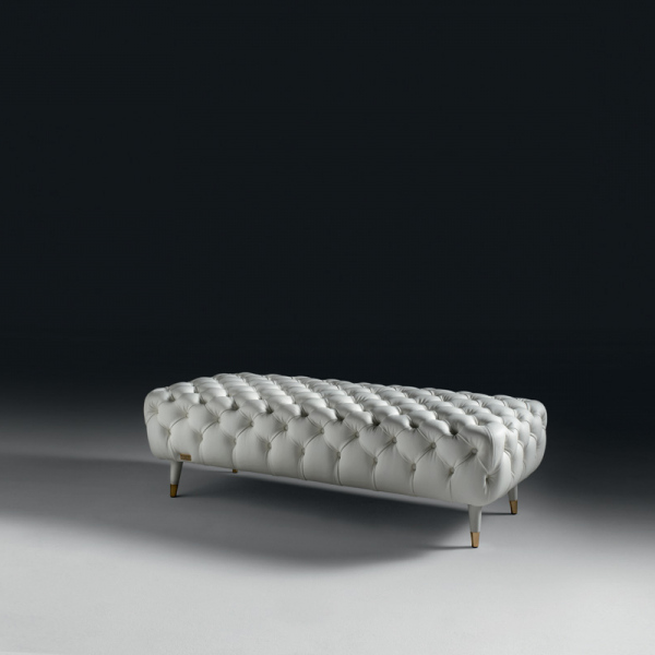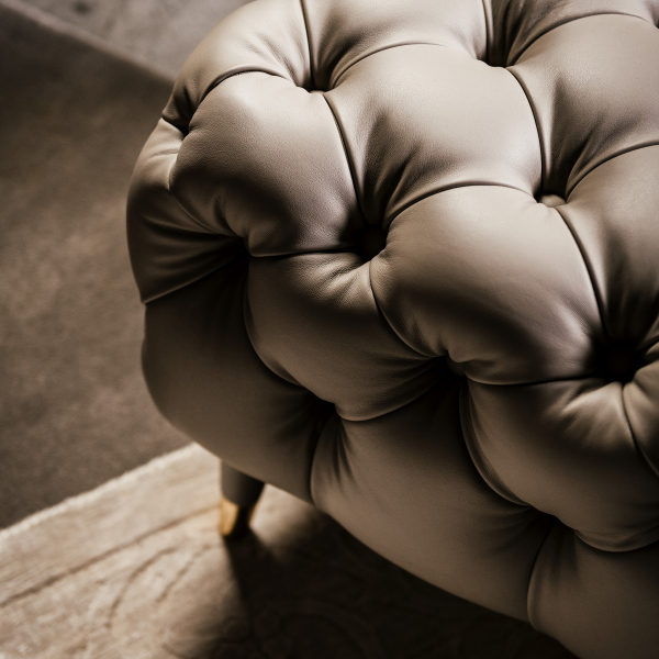 densità. Lavorazione a capitonnè. Non sfoderabile. Piedi rivestiti, con puntale in metallo finitura oro lucido o bronzo
