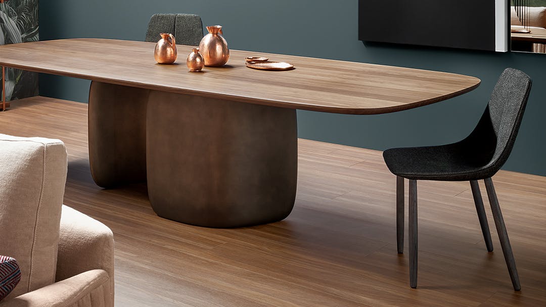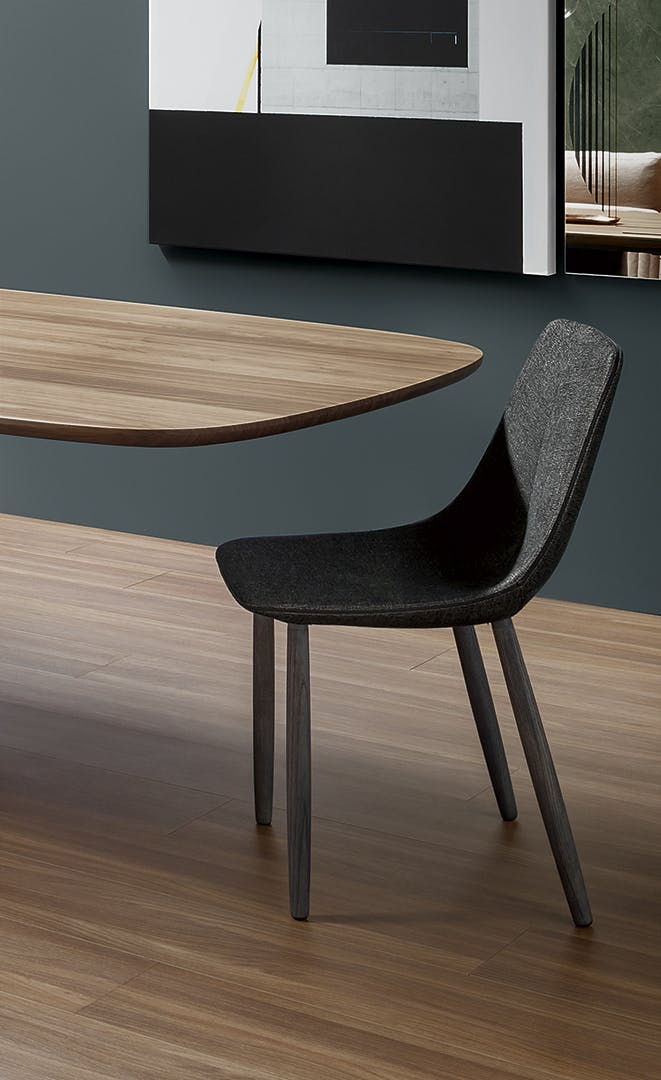 By represents not only a kitchen chair, but a true object of affection, an element that gives positive qualities to the spaces of our daily life. The By chair has a steel frame, comfortable padding in cold foamed polyurethane and upholstering in leather, eco-leather or fabric. The legs, made of solid ash-wood, are available in three colour variants. In the By met variant, the legs are in painted metal or in elegant clouded chrome, dark nickel or brown nickel finishes. The design of By and By met is characterised by the line in the middle of the backrest: a sign that becomes a refined sartorial detail, highlighting the exquisite craftsmanship for a result of great versatility, suitable for usage that ranges from the domestic environment to contract spaces.