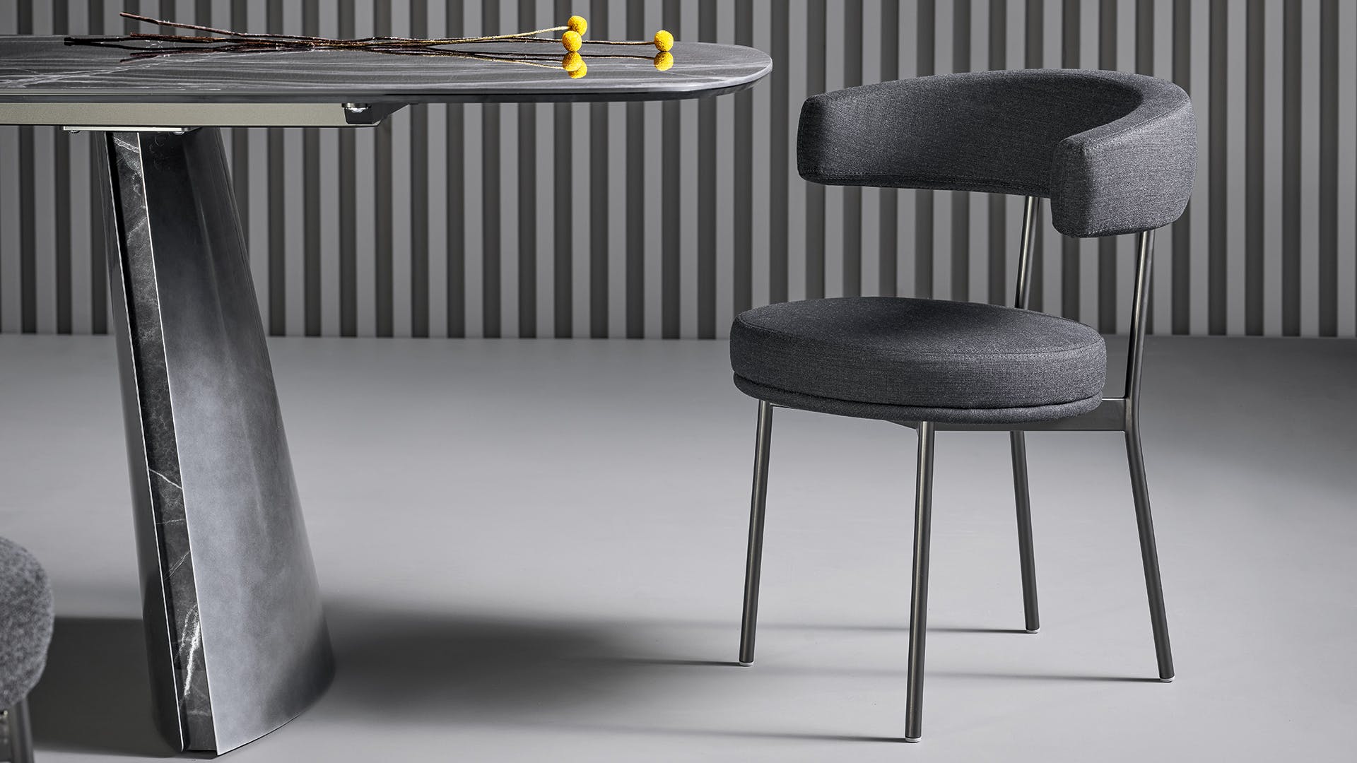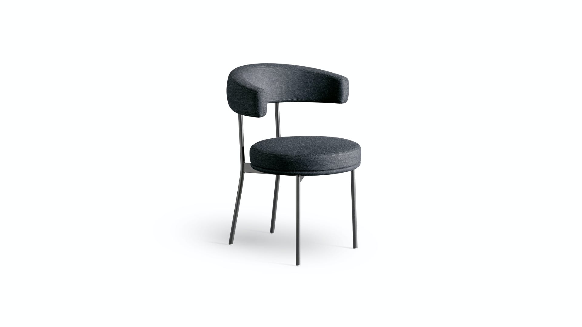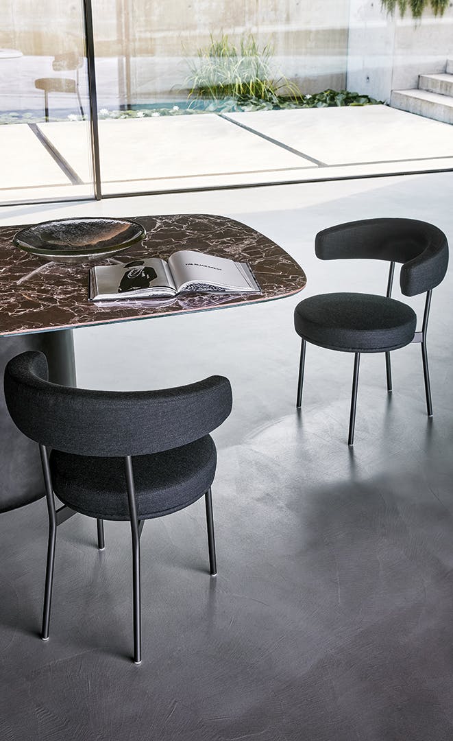 Designed by Fabrice Berrux, the Neuilly chair comes to life thanks to the combination of different and clearly outlined elements such as the thin metal tubular structure on the one side and the upholstered elements on the other. The padded seat plays with the curvilinear shape of the welcoming backrest/armrest, which embraces the body with a single ergonomic movement thereby guaranteeing a natural posture for the back and offering unencumbered support for the arms. The resulting product is a modern and comfortable living room chair characterized by a versatile style and a lightweight image. The catalogue also features the matching Neuilly too stool.