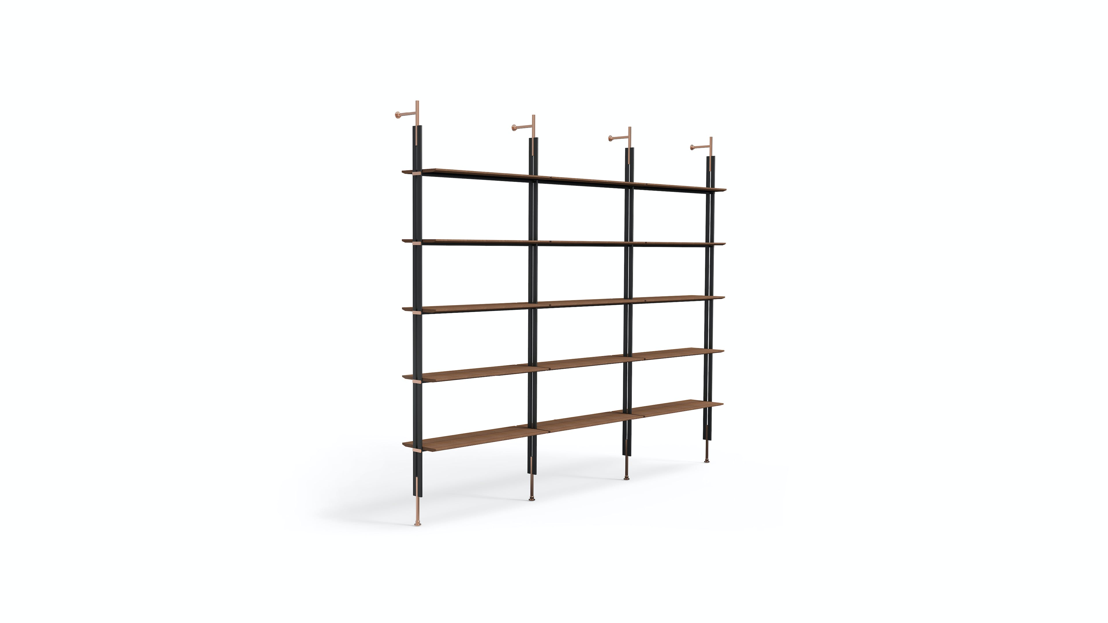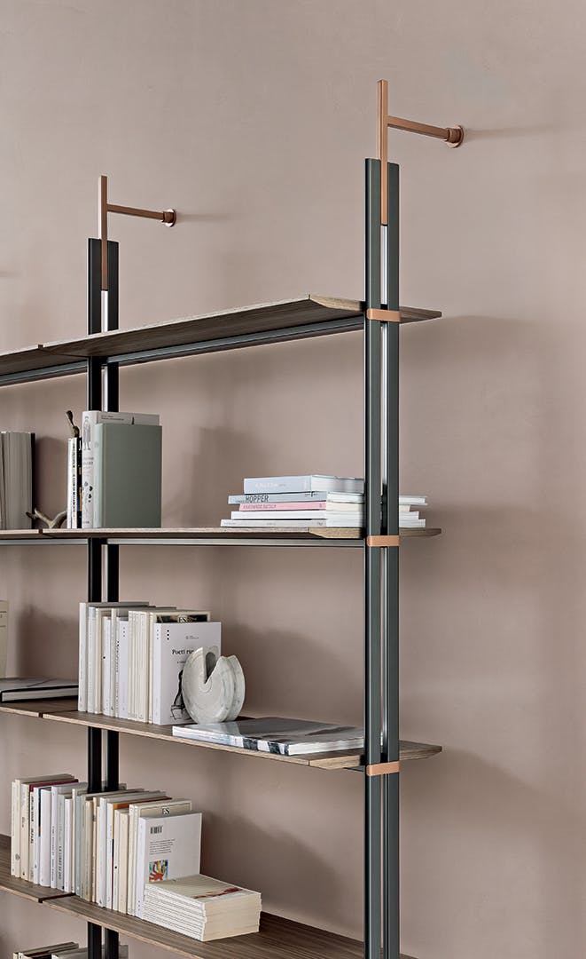 The ability to fix the Roll modern modular bookcase to the ceiling, as well as to the wall, makes it a furnishing element that can also be installed in the centre of a room to divide it into two spaces. Mounting it to the wall takes place by means of supports composed of metal tubes with a lead finish; both the shelves and the details that emerge from the metal tubes are available in the same finish as the supports, or in different finishes for a play of contrasts of utmost elegance. The modularity of the modern Roll bookcase makes it suitable for any size of wall, both in the home or office. A box module is also available, to store objects and books.