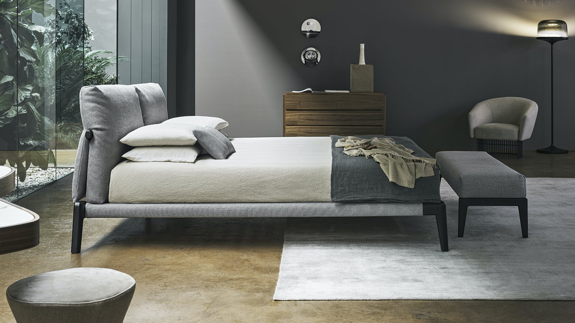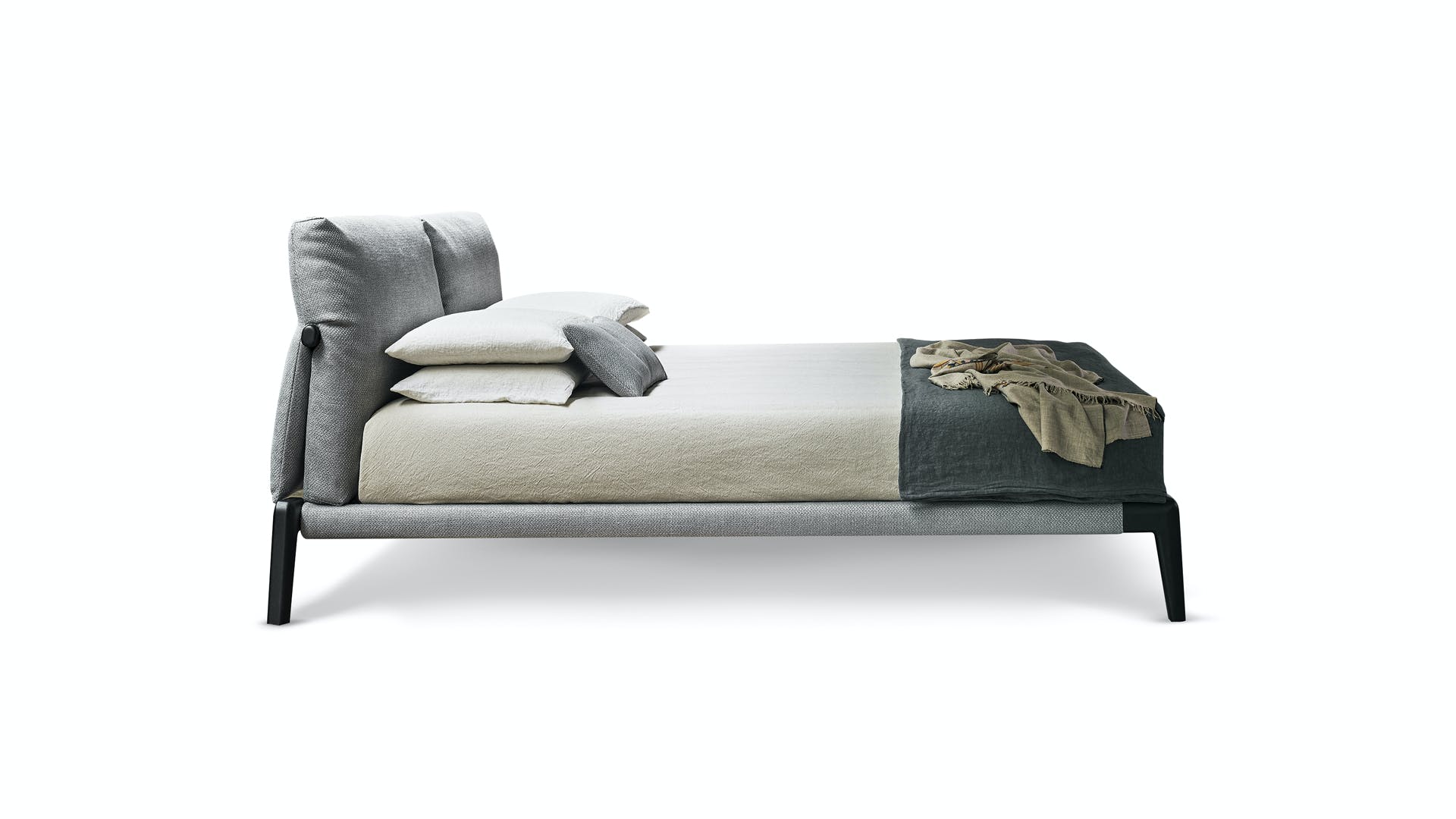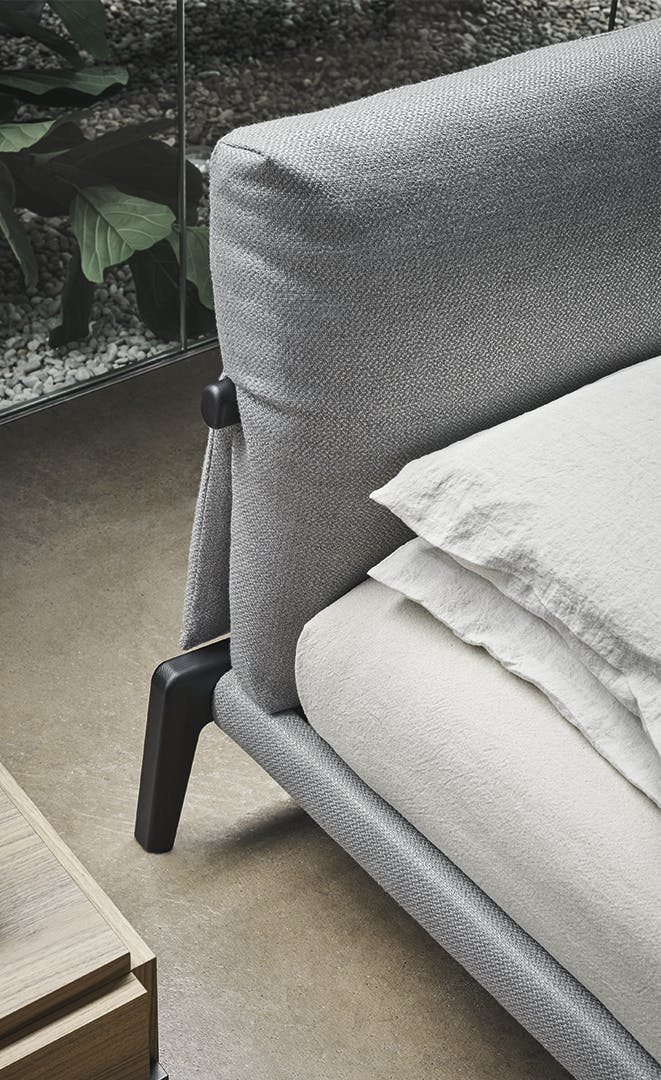 Kriss is a collection consisting of the romantic modern luxury design bed and coordinated accessories, a concept that focuses on the contrast and perfect harmony of fascinating materials: the elegant softness of fabric combined with the traditional solidity of wood. The modern wooden design bed’s structure becomes a visible and characterizing element, while the cushions that make up the headrest provide extra comfort. The result of a continuous aesthetic evolution, the sophisticated combinations of fabric and wood suggest the will to create elegant shapes and solutions, enhancing the qualities of both materials and giving a warm, welcoming and exclusive look. In addition to the double bed, a bench is also available in the Kriss collection.