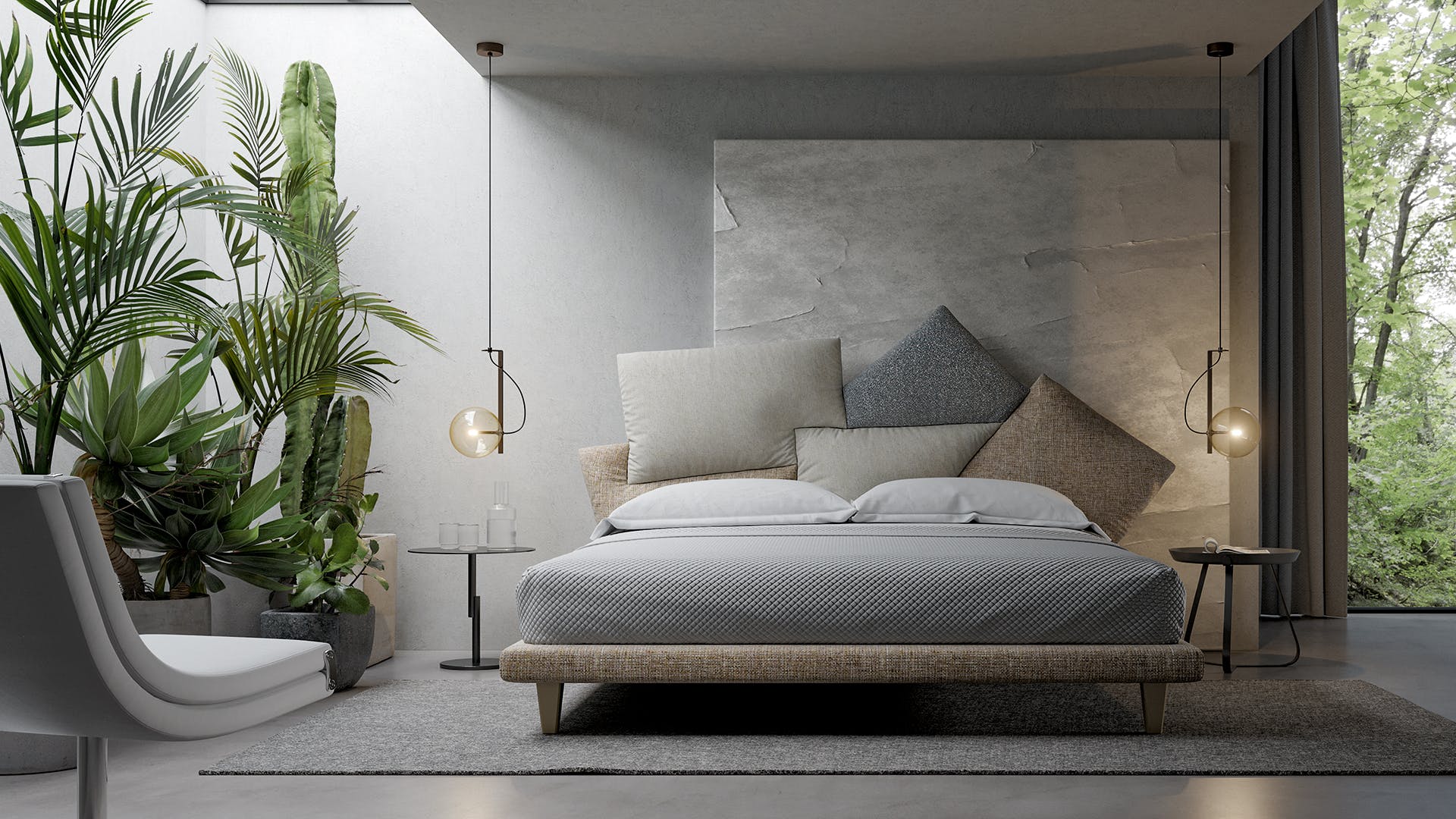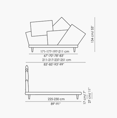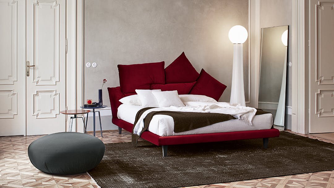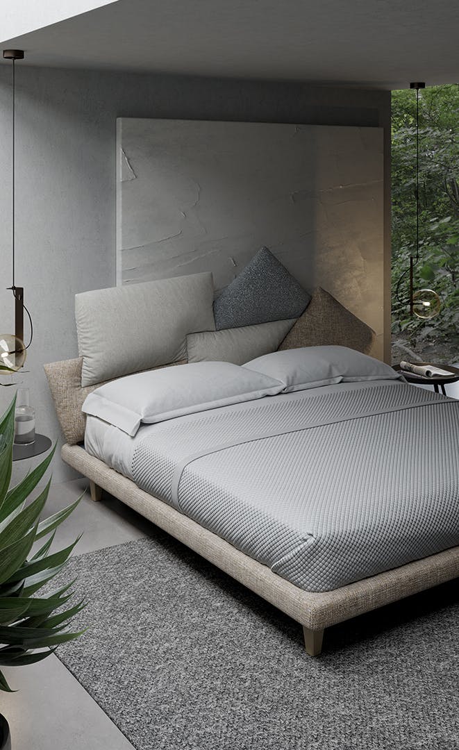 A casual combination of cushions that manages to be decorative and functional, discreet yet spectacular: this is the Picabia headboard, the bed with unusual lines that offers those who choose it numerous options for personalisation, giving maximum space to creativity for a unique result and effect. The finish of the cushions can be single colour, similar or in contrast, in line with personal tastes, thereby giving the bed a completely different character depending on the selected combinations. The removable cover is made of fabric or leather. The wooden feet are available in grey anthracite or walnut or made of matt painted metal. The Picabia modern upholstered bed is available in double or single versions.