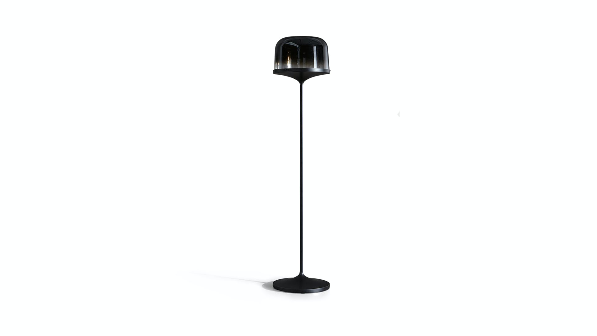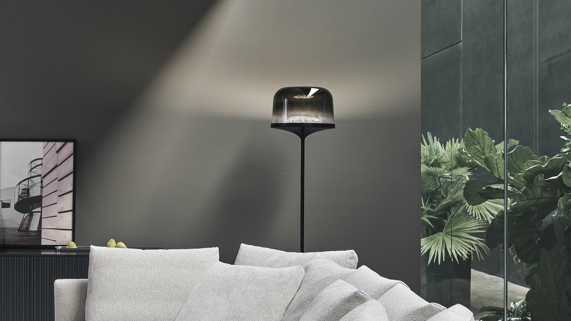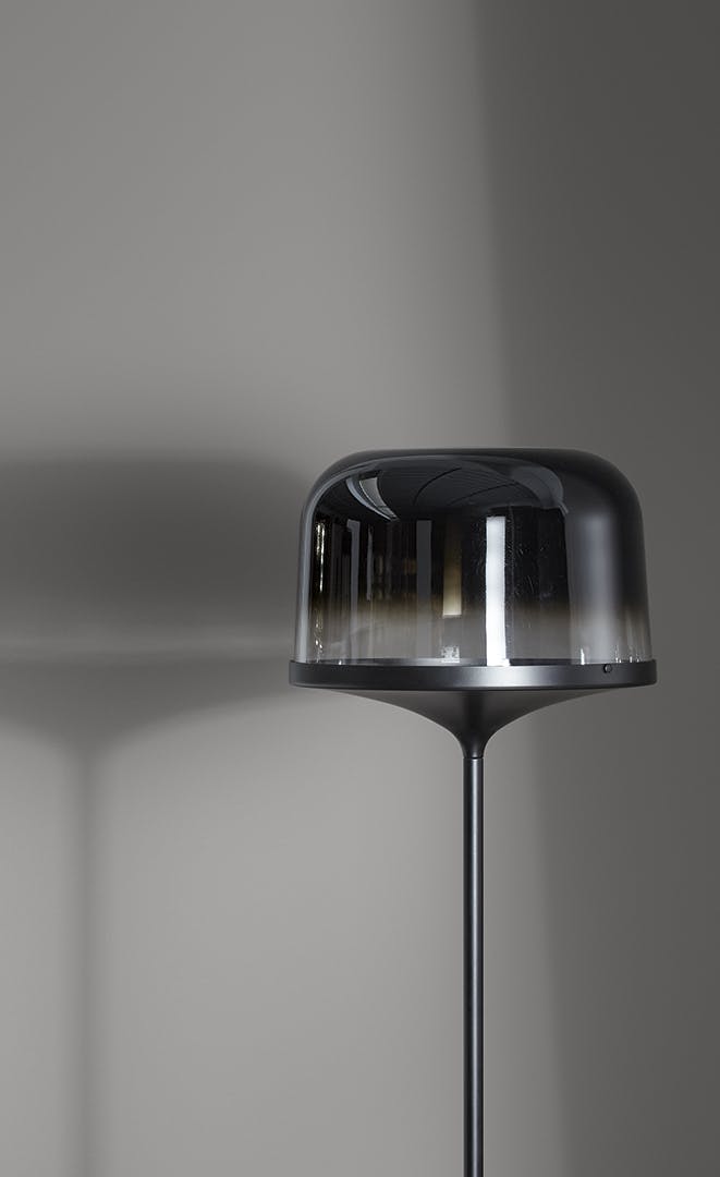 The Pin design floor lamp for living rooms has a striking blown glass lampshade which contrasts with its slender metal frame. Pin’s linear design fits seamlessly into any home setting, a discreet presence that illuminates by defining a precise point in space. It is available with a smoked lampshade and a lead base.