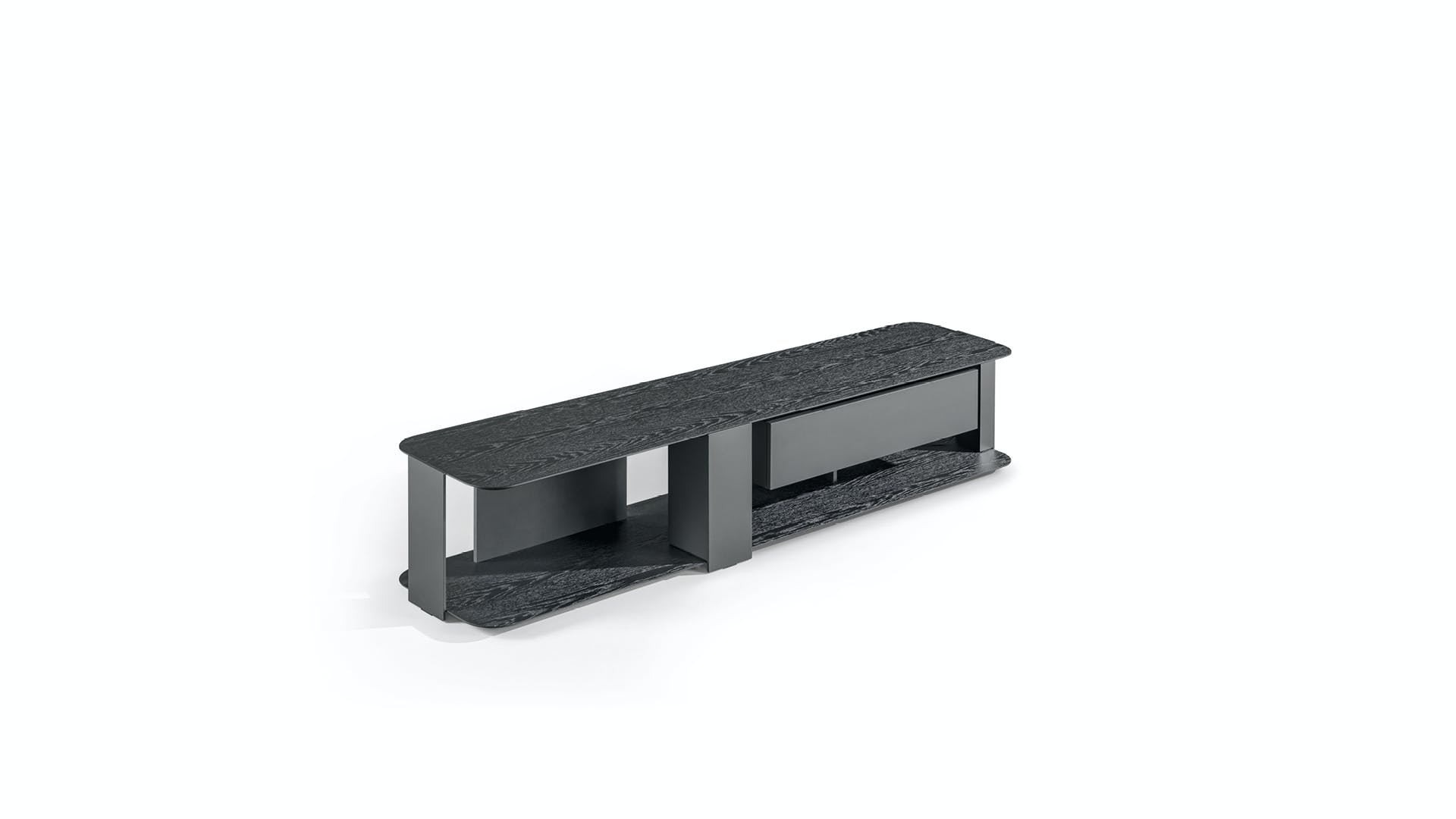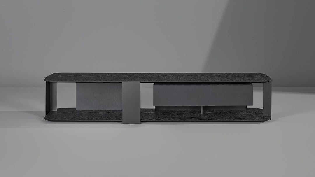 The Paddle TV stand catches the attention thanks to its visual lightness yet behind which there is significant structural strength. In addition to being freestanding as a low console, this piece of furniture can also be wall-mounted, offering ample flexibility for interpretation and insertion into any space. Available in two fixed colour combinations (Canaletto walnut and bronze or coal oak and lead), the modern tv console is enriched with the addition of a convenient lacquered wood drawer. There is also the Paddle TV stand light version with integrated lighting system offering a backlit effect.