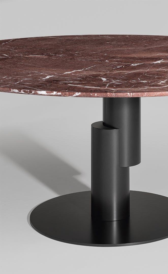 The base of the Innesti modern nesting table, designed by Paolo Grasselli for Bonaldo, appears detached from the upper part of the accessory, as though the top were suspended in the air. The two parts are united by a perfect, yet unexpected joint that puts this table in the spotlight with a great sculptural effect. This element becomes the standout feature of the living area, while dialoguing with the surrounding space thanks to the option of customizing the details with different types of marble, wood and ceramic for the top and different metals for the base.