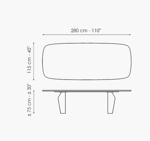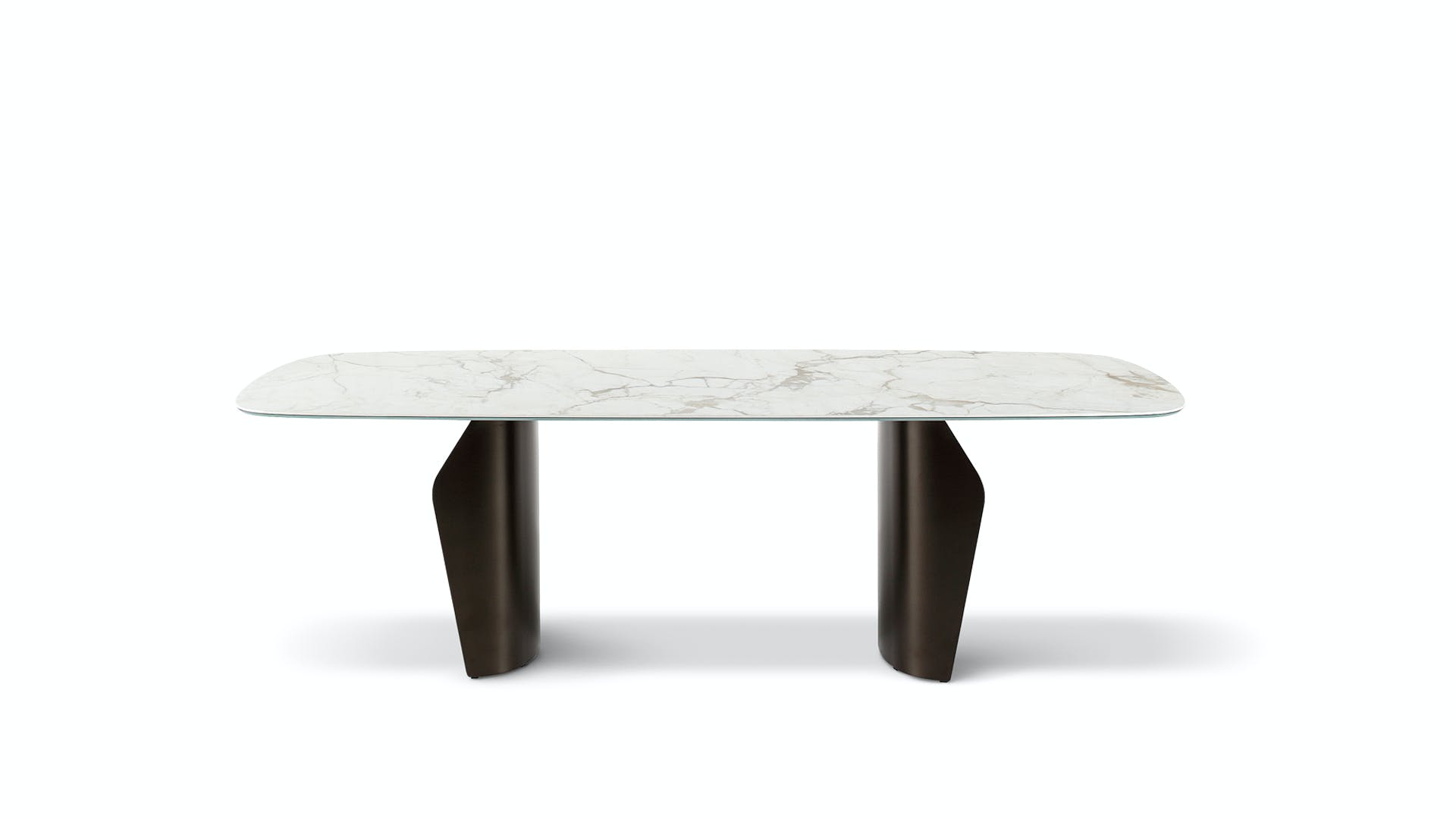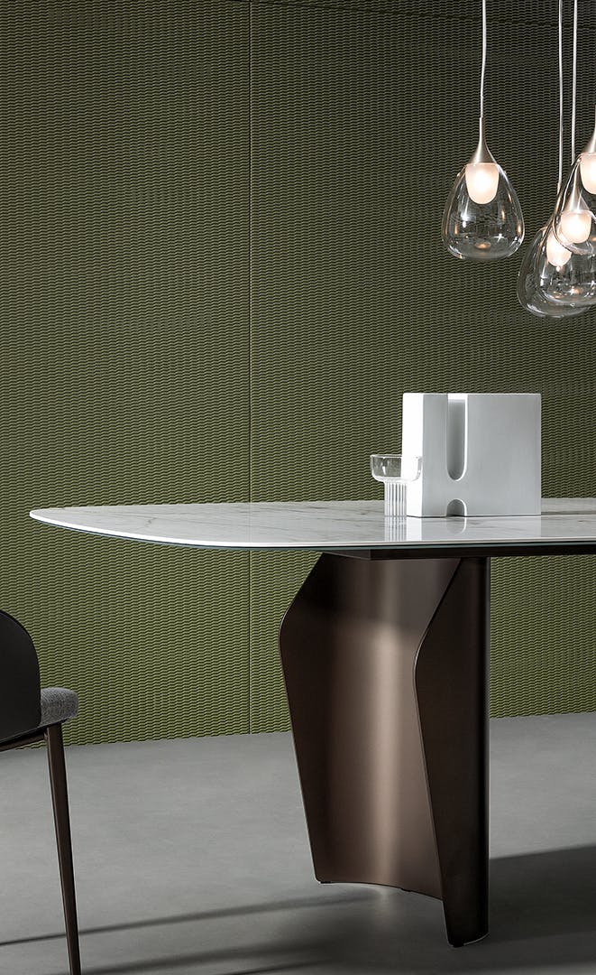 Flame’s main features are its harmonious shapes and light, sinuous volumes. The top, which is visibly suspended, is fully usable thanks to the position of the double base designed to optimize the overall space. Form and function are perfectly expressed in this table: the extensive customization options allow you to arrange it according to your tastes, needs and the mood of the surrounding space. The top is available in a number of sophisticated finishes – from wood to ceramic and marble – and you can choose from various metal options for the base. A wooden base is also available for this modern living room table (Flame Wood).