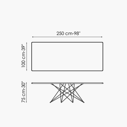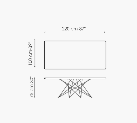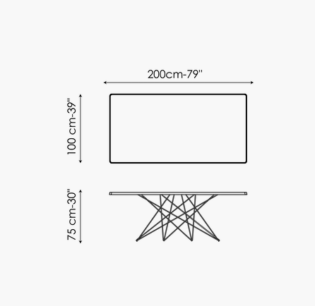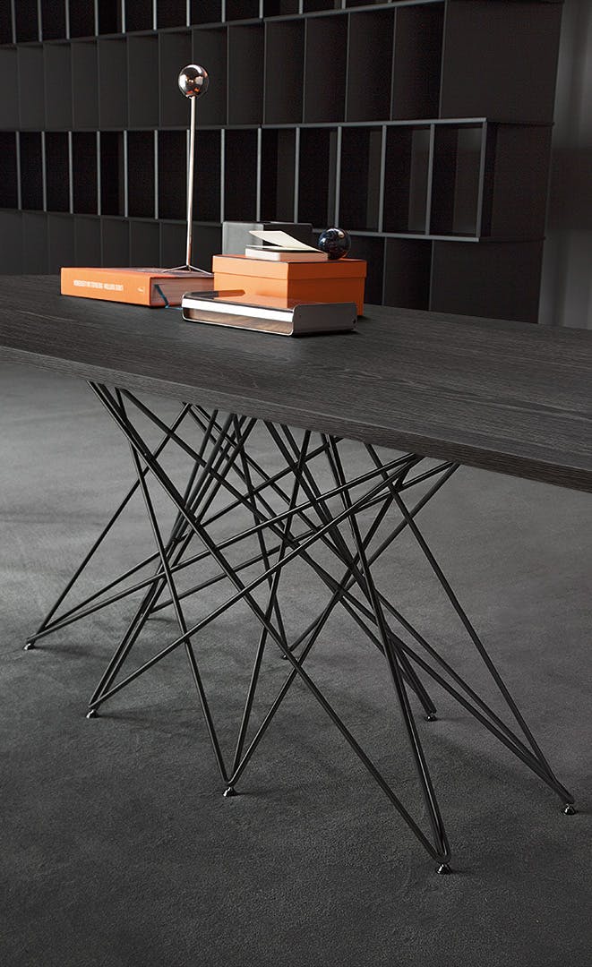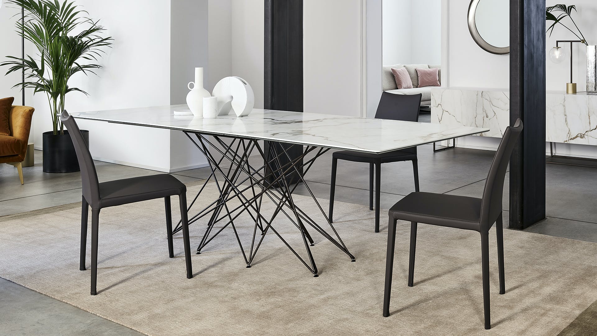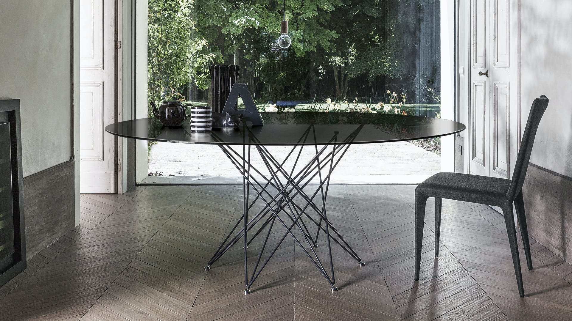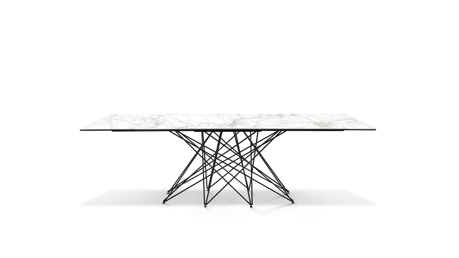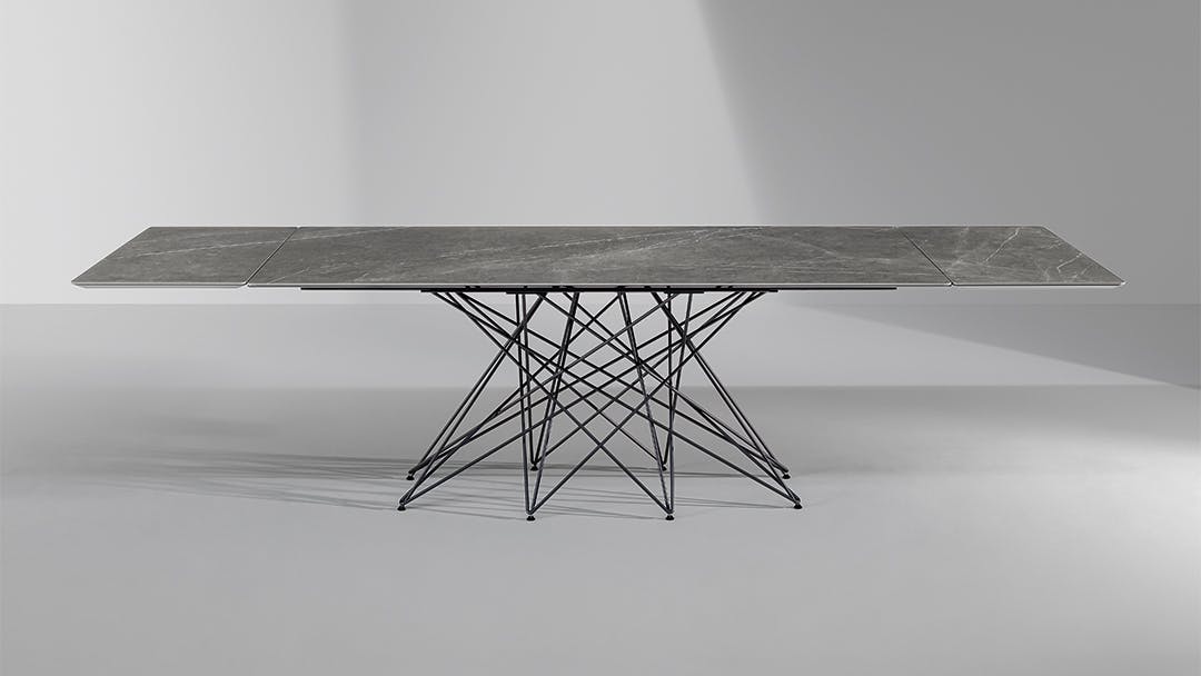 Octa comes from the Greek word “okto” meaning eight: the number of legs that make up the elaborate base of the Octa dining table, metal elements that intersect in an apparently disordered way. This idea arose from playing with Shanghai sticks, an age-old pastime that suggests an idea of chaos and turmoil, lightness and randomness. The top can be fixed or extendable, and is available in a wide range of materials and finishes; in the round version, the table is fixed and made of glass or ceramic. In the fixed rectangular and barrel versions, veneered and solid wood finishes for the top are available. Its image, in contrast with the base, is sober and linear. The overall result is an almost molecular equilibrium for a decidedly unusual and elegant table, able to characterise the space with a sought-after and contemporary meaning: that of a sign that becomes an object.