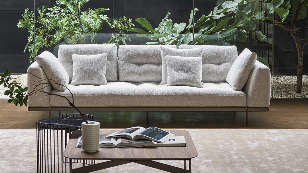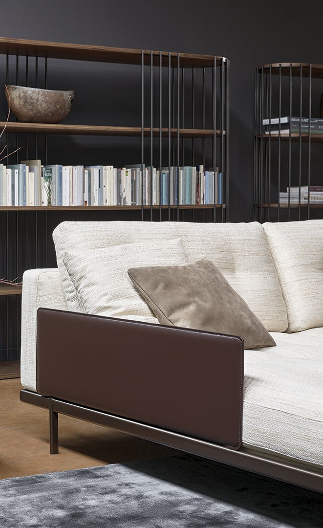 Characterized by refined aesthetics and an iconic character, the Maximilian seating system is capable of furnishing any living area with style. Not just a simple sofa set with tables, but a modular collection of elements that offer a variety of configuration possibilities, useful for designing the living area in both residential and contract settings. In addition to its generous upholstery, contrasting with the slender metal feet, the most striking feature of this sofa is the stitching on the upholstery that embellishes the backrest and seat, and which recalls the typical elegance of the 1950s. A series of leather accessories complete the Maximilian collection to achieve a perfect aesthetic and functional performance: among them, the armrest, the magazine holder armrest and a small table; they stand out as distinctive elements in a versatile, elegant and understated project. The extraordinarily wide range of elements, materials, and finishes is one of the most important added values of the entire Bonaldo collection; when it comes to the Maximilian sofa, this versatility represents a key element in fully satisfying different design requirements.