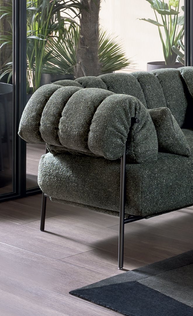 The Tirella sofa, an addition to the armchair collection, is an element with a retrò taste, inspired by the fabric samples that are laid atop a cutting table. A small modern sofa with a sophisticated silhouette in which the cushions, from simple “extras” take on the leading role, “embracing” the metal frame around the armrests and backrest. Thanks to its small size, the Tirella sofa is suitable not only for living spaces, but is also perfect for public environments and reception areas.