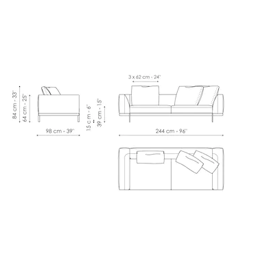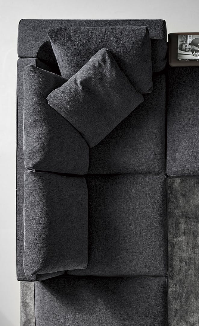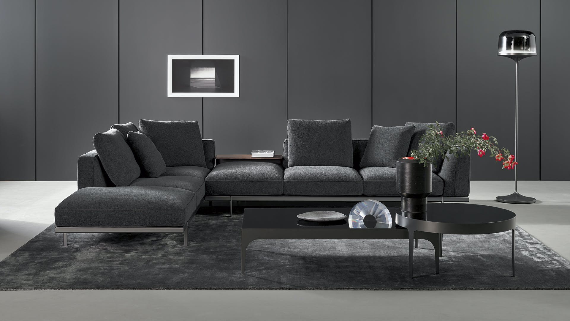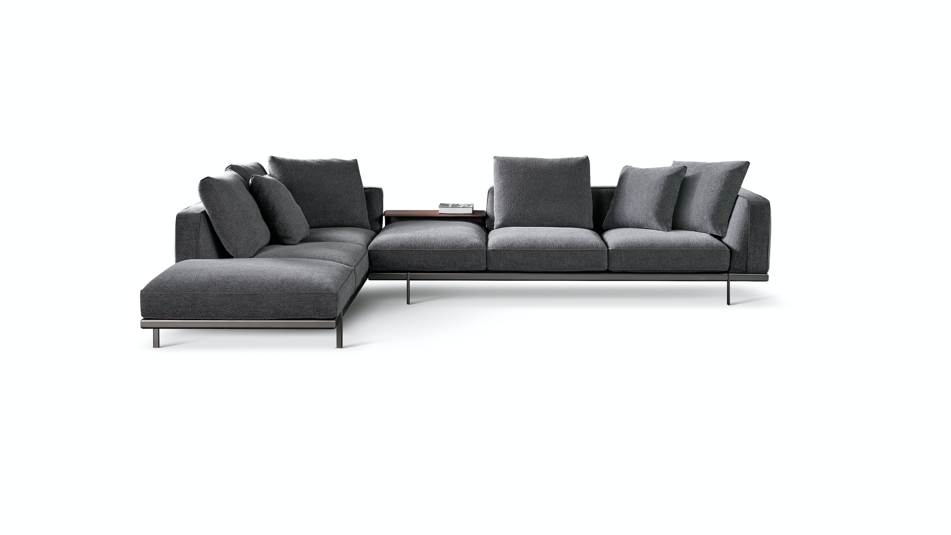 An elegant personality, a frame with a sense of lightness and generous upholstery are the characteristics that make Phil a suitable piece of furniture for any living area. The clean and rigorous lines of this sofa design are best emphasized by the detail present in the profile of the cushions, an original ornamental border in grosgrain which is available either in contrast or tone on tone for a uniform effect. The sofa is full of details and sartorial elements such as armrests, armrests with magazine rack, trays and tops in leather that complete and personalize the sofa, resulting in an elegant and versatile design. The Phil collection is available in the “Casual” version whose back cushions are reduced in size with spaces between them and the “Linear” version with larger back cushions side by side.
