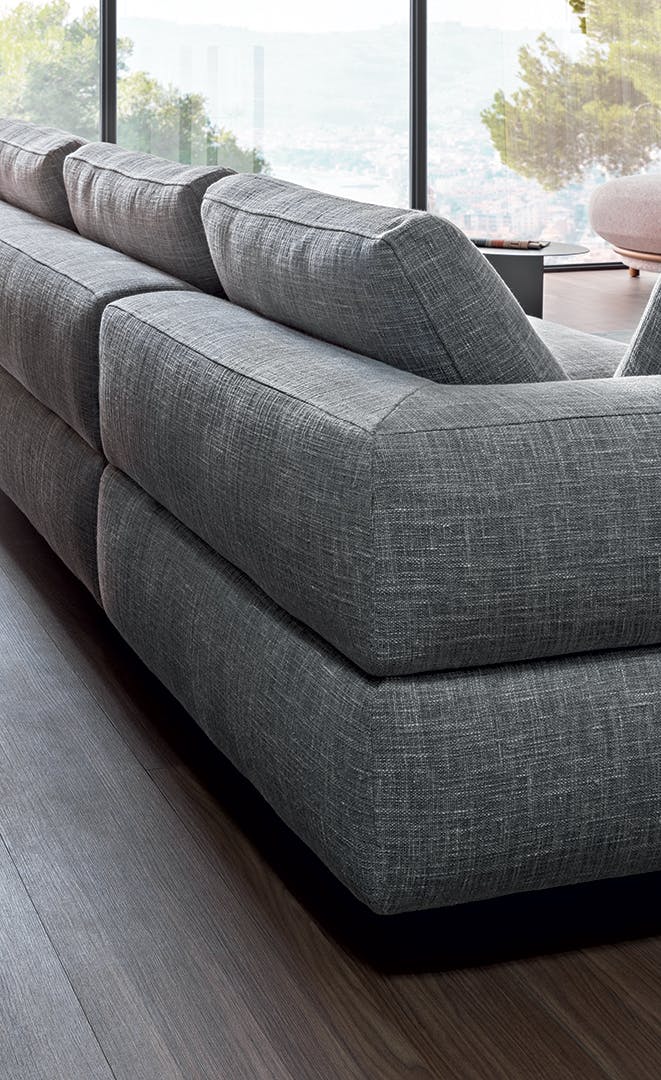 embraces the seats and gives the living area a note of softness and elegance. The keyword is maximum personalisation. Thanks to the many elements from which it is possible to choose, it is an extremely versatile modern sofa with high back which adapts to every style or space requirement. Indeed, it is possible to create the perfect sofa composition combining a wide range of modules, such as poufs, corners and chaise longue: the backrest, therefore, becomes a true “trait d’union” of an island with 360° freedom. Ever More can be also placed at the centre of a room, to create a convivial space. The upholstery is completely removable.