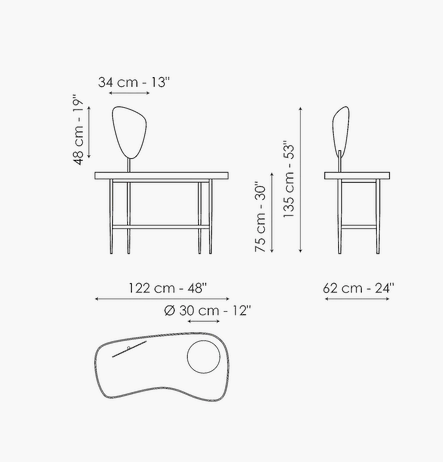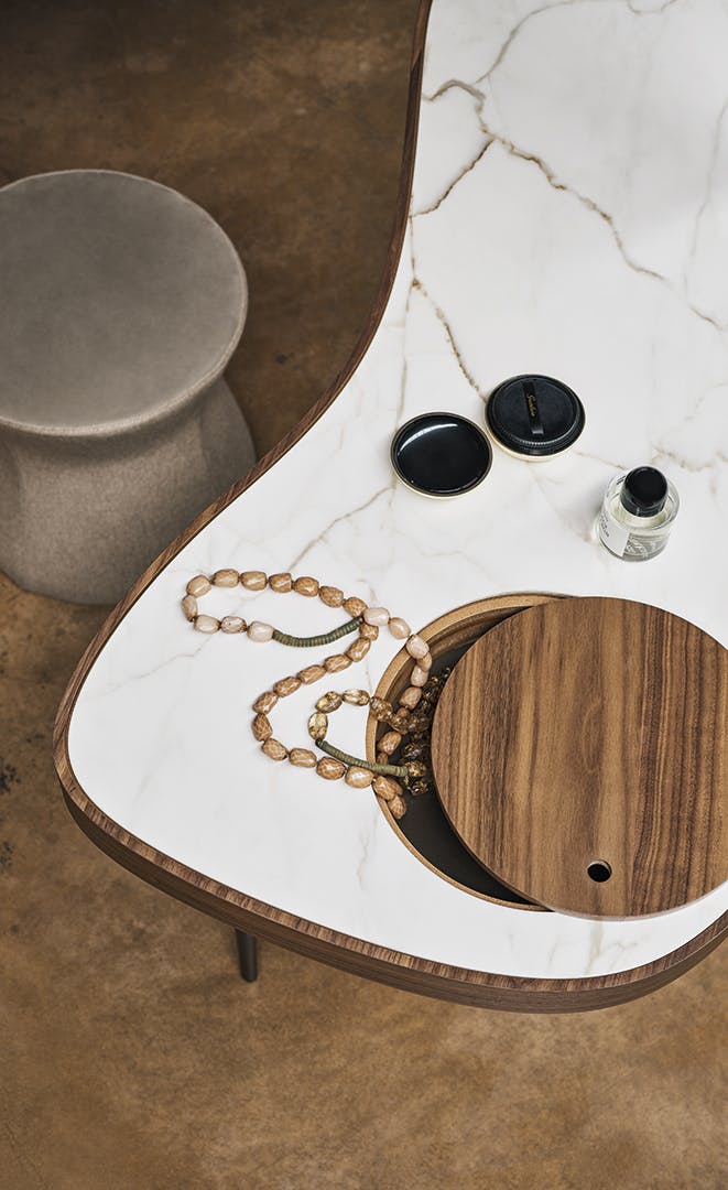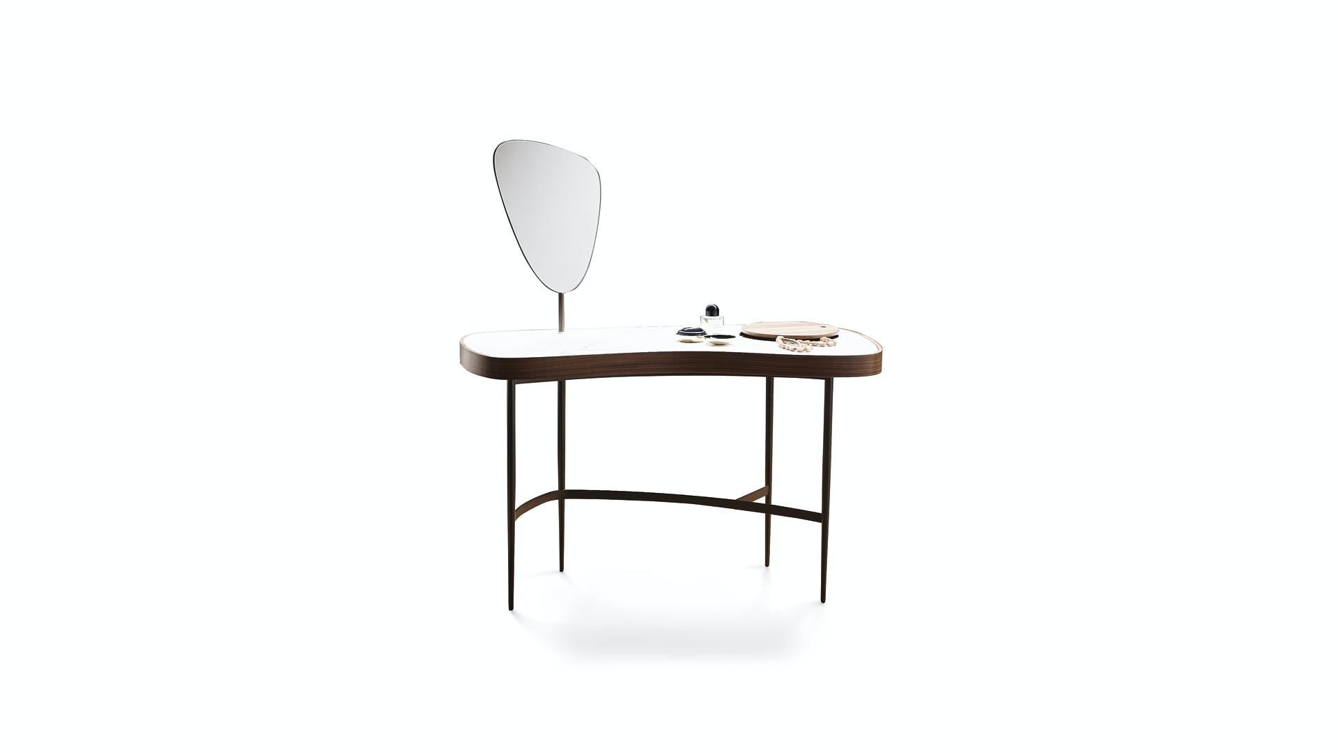 The Venus modern makeup vanity table is a functional freestanding piece of furniture with a metal structure and an original shaped top featuring uniquely rounded lines. Its range of accessories makes it highly practical: a make-up mirror and a handy storage compartment with a walnut lid, useful for storing jewellery and small everyday items. The unique shape of the base structure, with part of the frame curved and set back, is surmounted by a considerably thick top consisting of a wooden frame with a ceramic top inside.