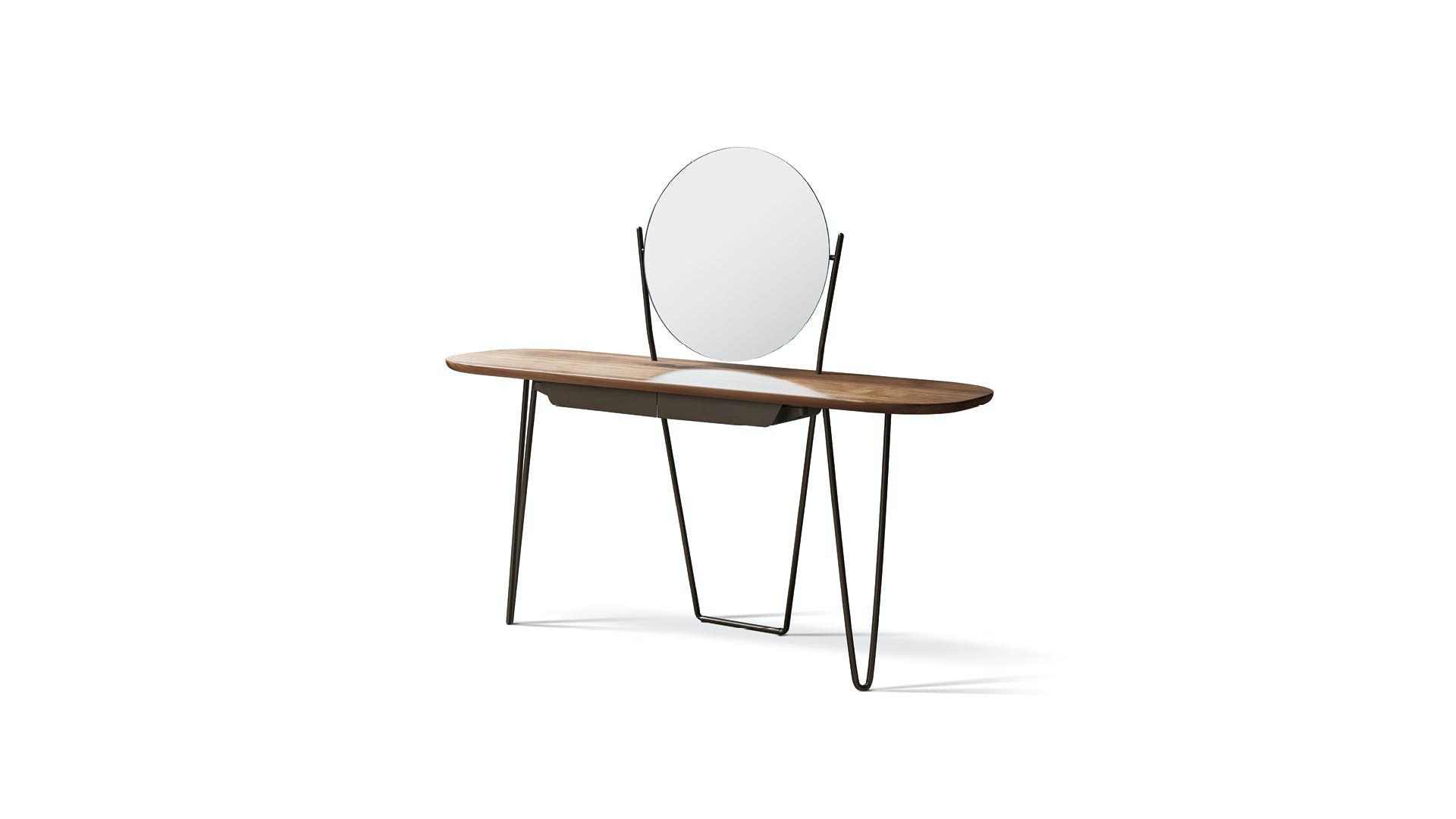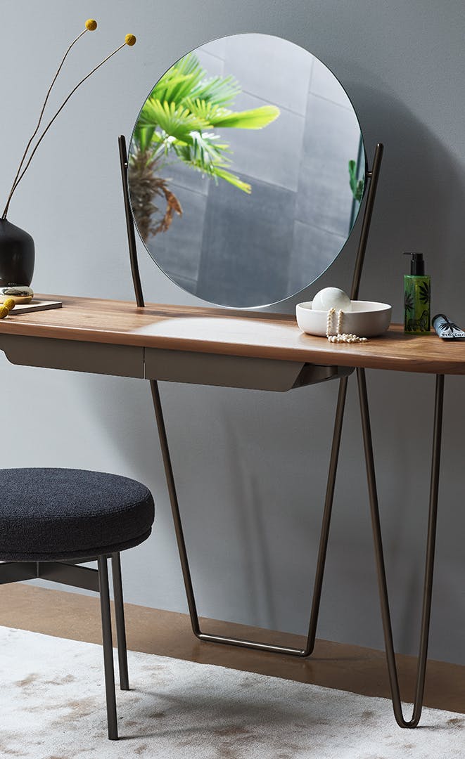 Light in its tubular structural elements yet strong in its proportions, the Coseno bedroom modern makeup vanity desk is a multifunctional console: a display surface, dressing table, desk and adjustable mirror. Precisely because of these features, it is an ideal item for furnishing any environment, to be placed either in the entrance hall or the bedroom. The slender frame, available in matt painted metal or in the elegant matt copper and matt bronze finishes, supports a wooden top: a sophisticated material element that gives warmth, enriches the overall lightness and makes it immune to the passage of time. In the Coseno plus version, the two practical metal drawers, made in the same finish as the base, offer further space for placing books or objects.