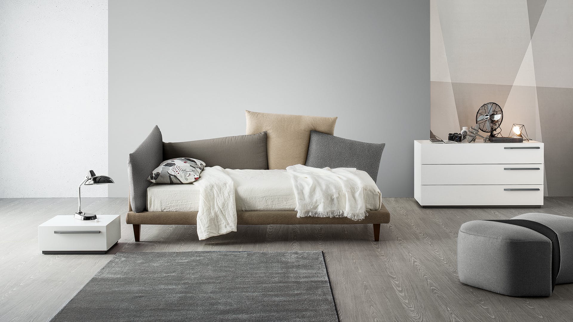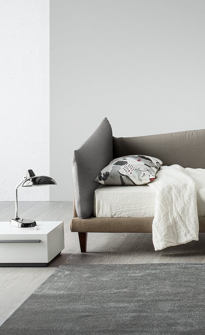 A disorderly combination of cushions that manages to be decorative and functional, discreet yet spectacular: this is the Picabia headboard, the corner single bed design with unusual lines that offers those who choose it numerous options for personalisation, giving maximum space to creativity for a unique result and effect. The covers of the cushions that make up the headboard and one side can be monochromatic, with graded effect or in contrast, in line with personal tastes, thereby giving the bed a completely different character depending on the selected combinations. The removable cover is made of fabric or leather. The wooden feet are available in grey anthracite or walnut wood or made of matt painted metal. Picabia is available in double or single versions