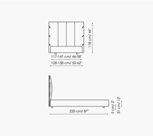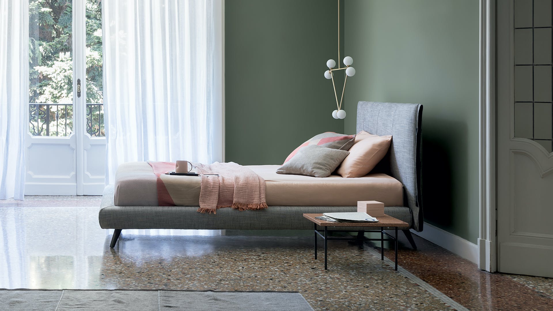 Available in double or single versions,Cuff is a bed made elegant by the exquisite details that characterize it: from the frog fastenings that adorn the two flaps which cover the padded headboard, to the pleating that runs vertically and the leather inserts that also enrich the modern single bed. Available with completely removable cover in fabric, leather or eco-leather, the Cuff modern single bed is produced in various versions: with feet in painted metal (Cuff), higher headboard (Cuff hi), thicker bed frame, low feet in painted wood and low (Cuff plus) or high (Cuff hi plus) headboard. In the versions with storage (Cuff open and Cuff hi open), valuable additional space is provided for storing covers, cushions and everything necessary for the bedroom.