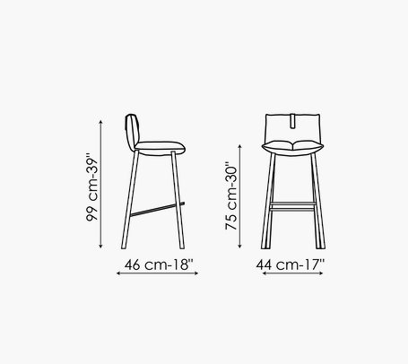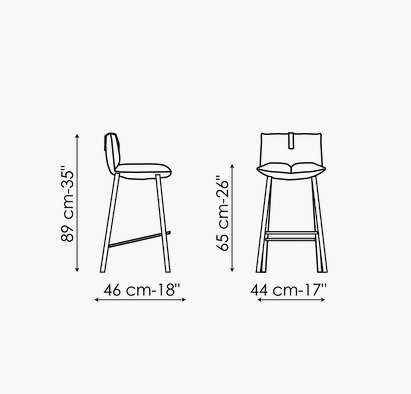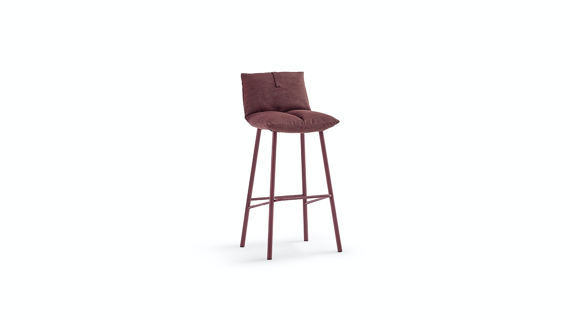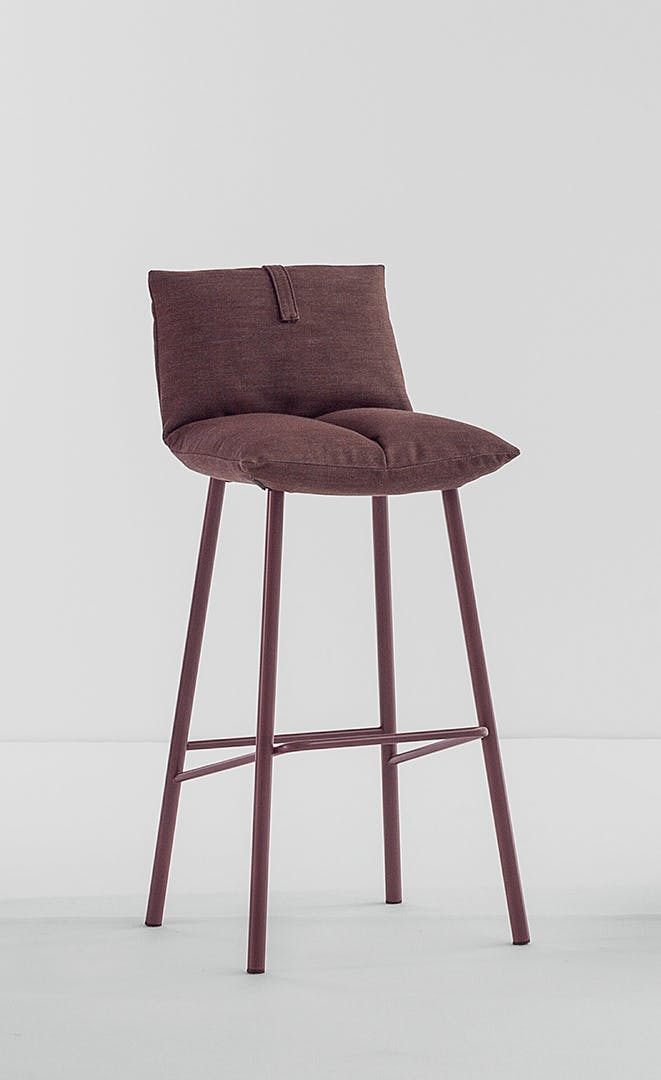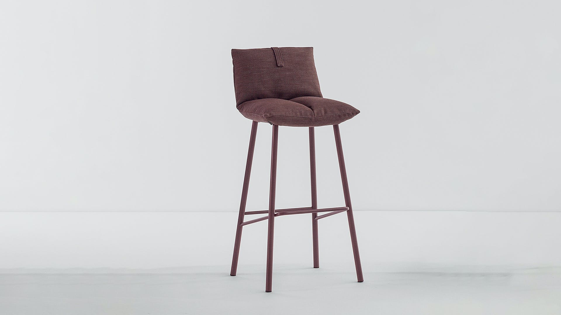 In Pil too, softness is evident even before you sit on it. Inspired by the object that is itself the symbol of softness, the pillow, and usually interpreted as an accessory, here the pillow plays the starring role, shaped and adapted to create a chair that conveys comfort and relaxation. The main components of the Pil too design stool are the backrest cushion and the seat cushion. The latter features a fold in the middle, created to generate an enveloping effect that physically and visually emphasises the feeling of softness. The base consists of metal legs, with the crossbars set at a special angle, to create an original graphic interweaving effect. In addition to the bar stool, other chairs complete the collection: Pil, (chair), Pil up (chair with higher backrest), Miss Pil (chair with armrests), Miss Pil up (chair with higher backrest and armrests), the Pil armchair and the Pil Armchair hi.